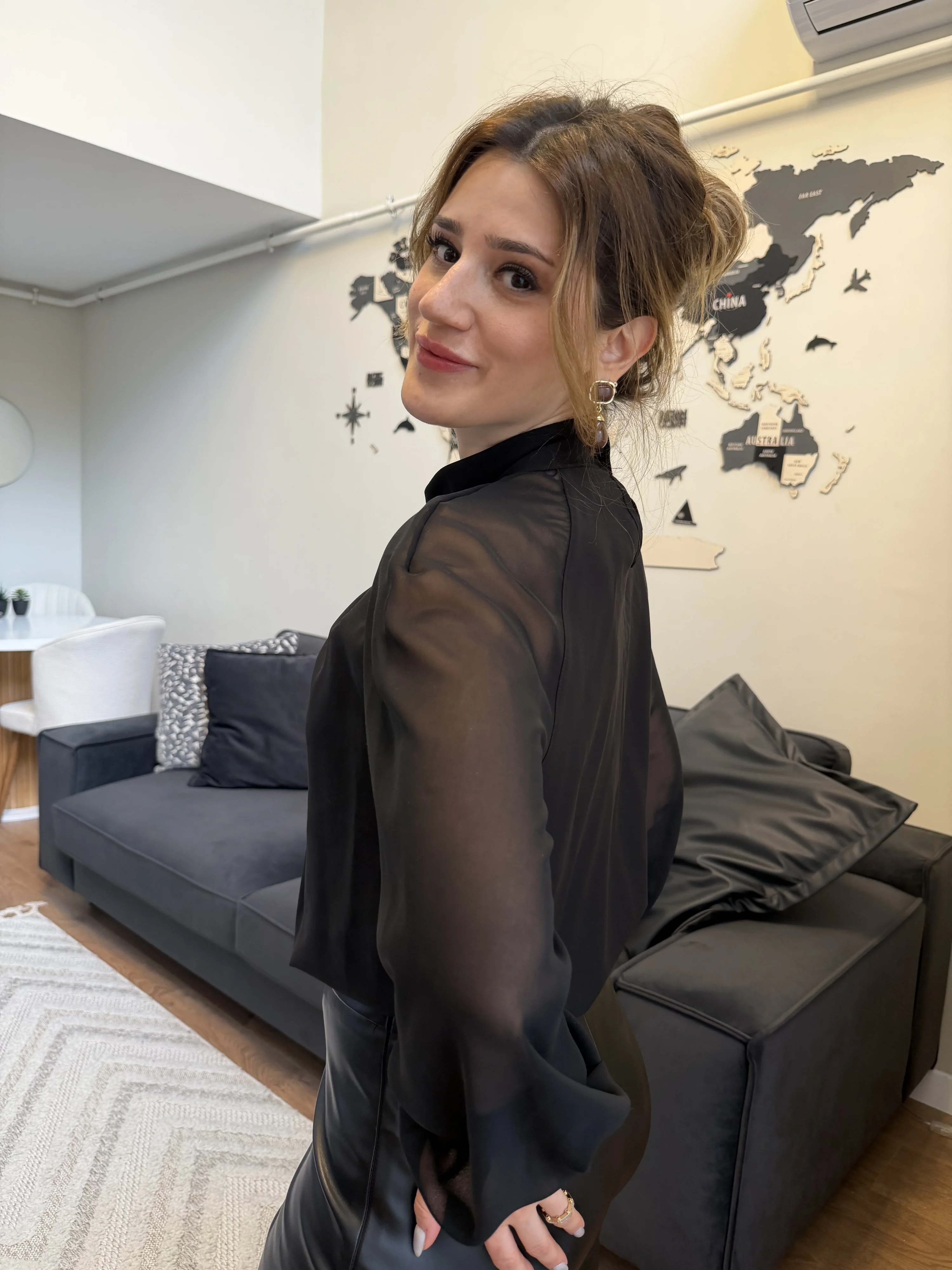 Şıklığın zarafetle buluştuğu Aksesuar Detaylı Şifon Kollu Bluz – Siyah, özel davetlerden iş günlerine kadar her ortamda tarzınızı tamamlar. Modern çizgiler, trend aksesuar detayları ve hafif şifon kollarla tasarlanan bu bluz, dolabınızın olmazsa olmazı olacak!