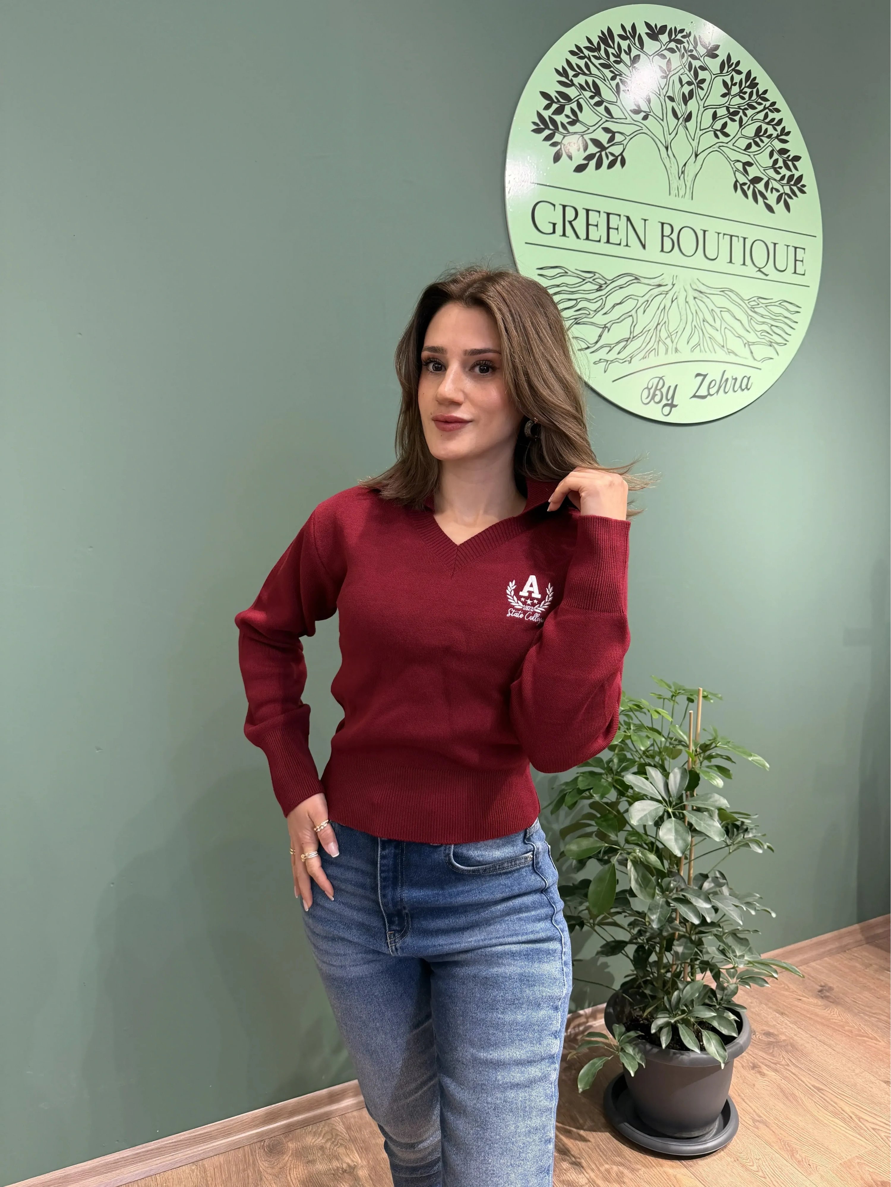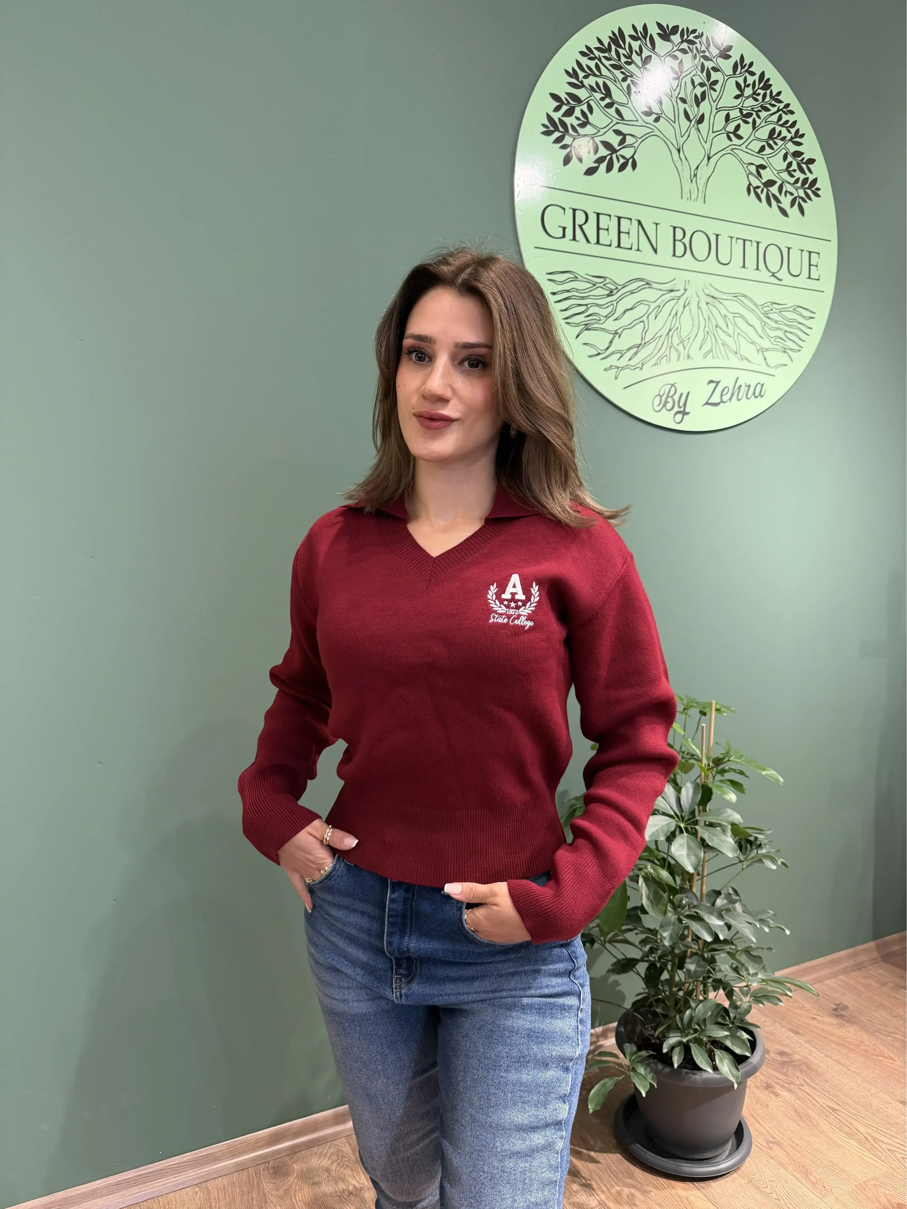 Bordo gibi iddialı ve sofistike bir renk, gömlek yakanın modern görünümüyle birleştiğinde ortaya hem düzenli hem de stil sahibi bir görünüm çıkar. Arma nakış detayı kazak tasarımına karakter katarak sıradan trikoların arasından ayrılmasını sağlar.