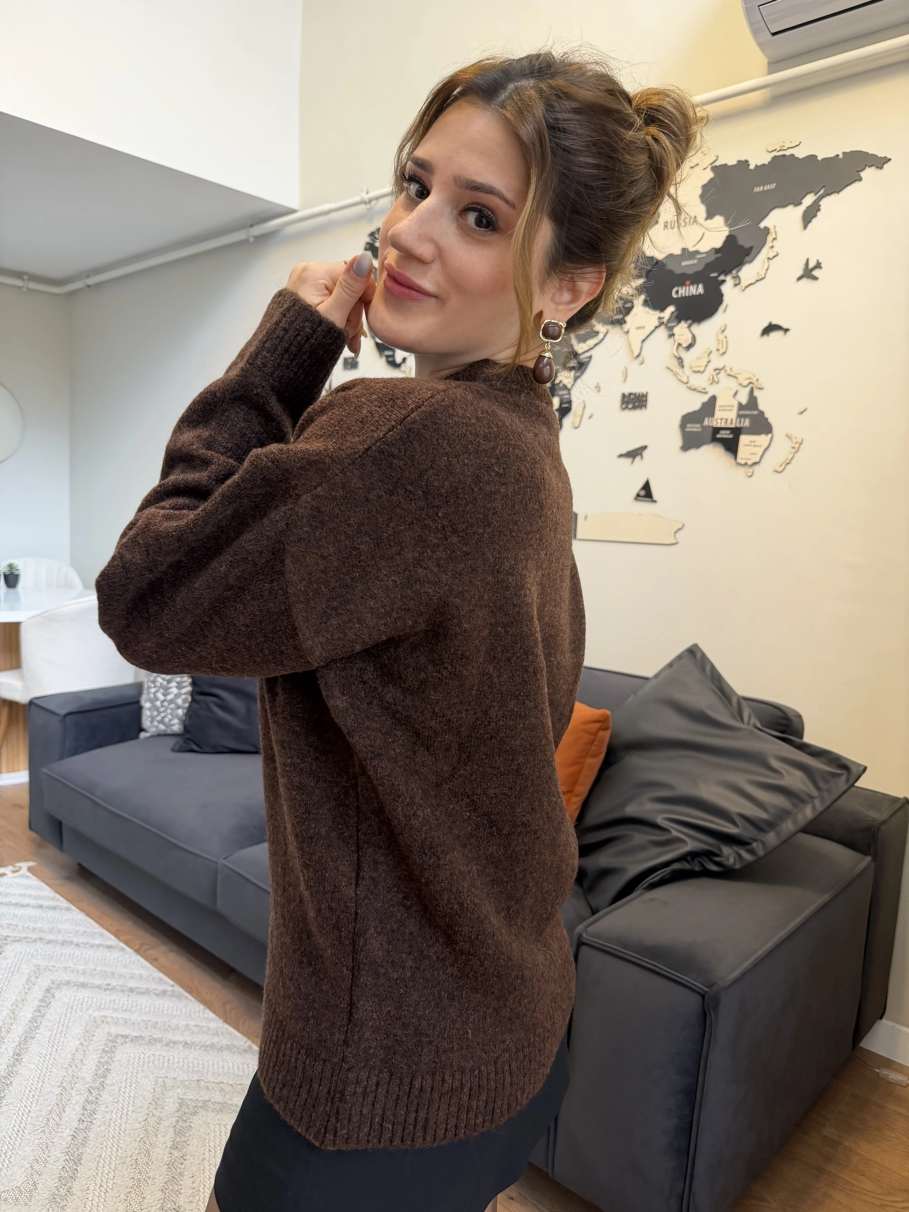 Kahverengi rengi, farklı kombinlerle kolayca uyum sağlayarak sofistike ve sıcak bir görünüm oluşturur. Günlük şehir kombinlerinden ofis şıklığına kadar rahatlıkla kullanılabilen bu kazak, modern kesimi ve esnek yapısıyla her vücut tipine uyum sağlar.