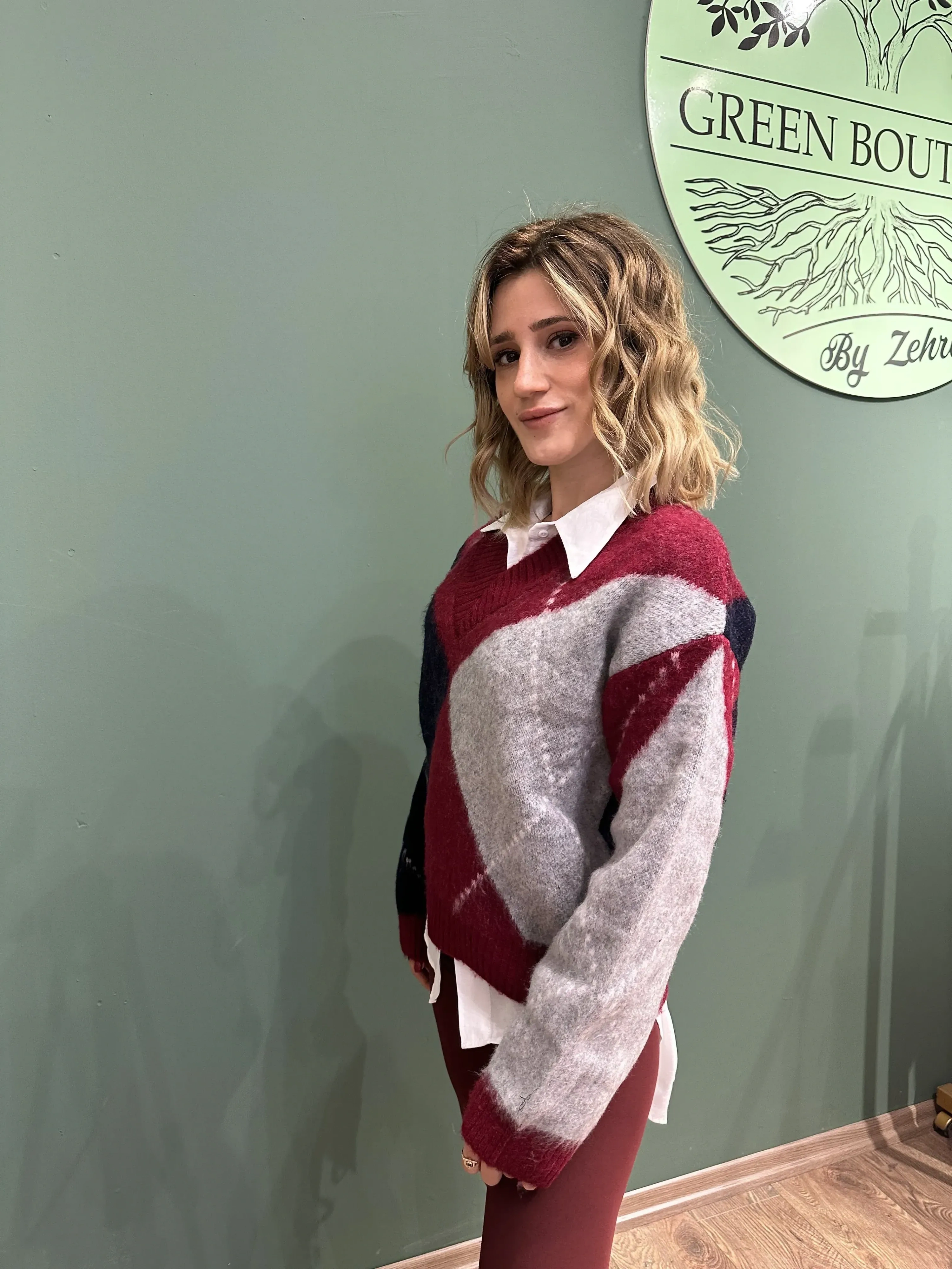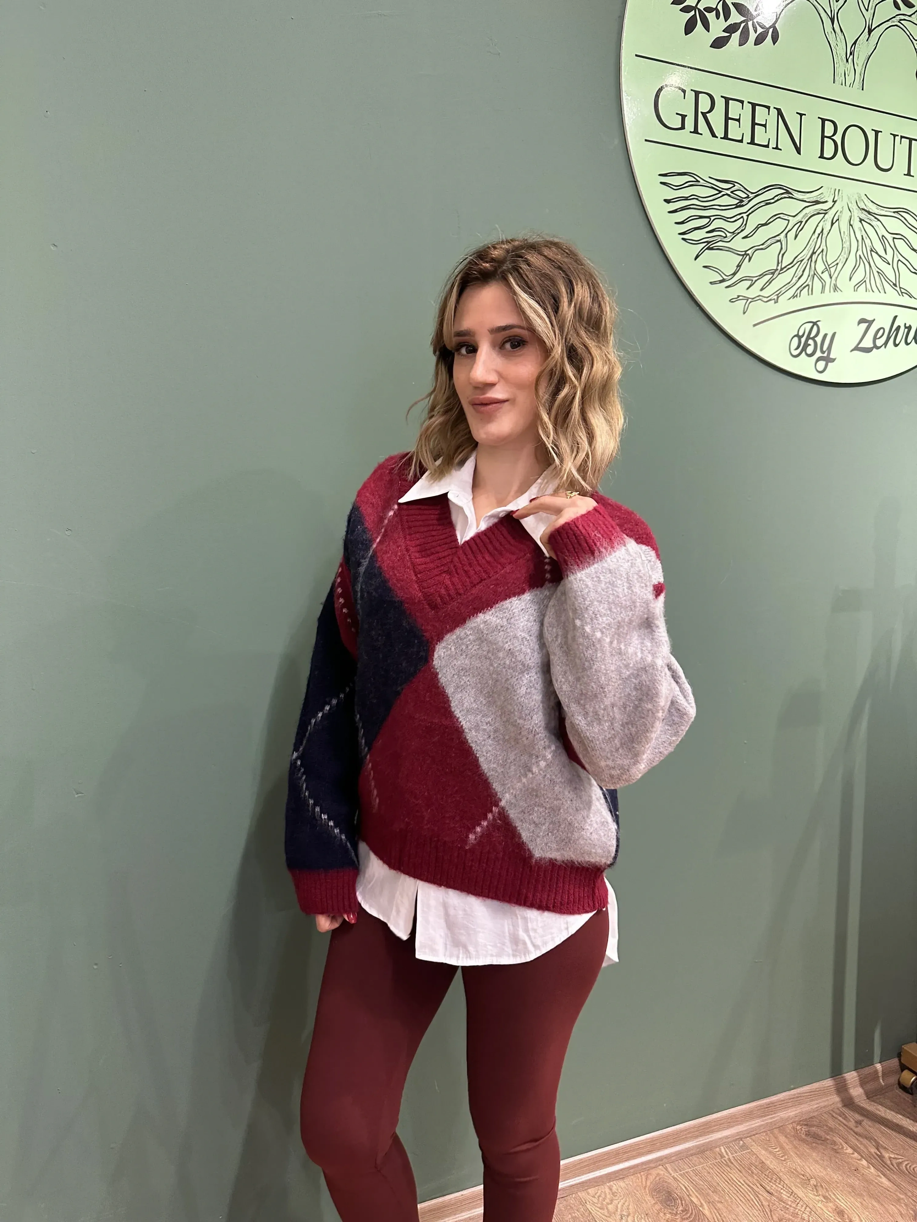 Bordo V Yaka Baklava Desenli Triko Kazak – Klasik Şıklığın En Şık Hali