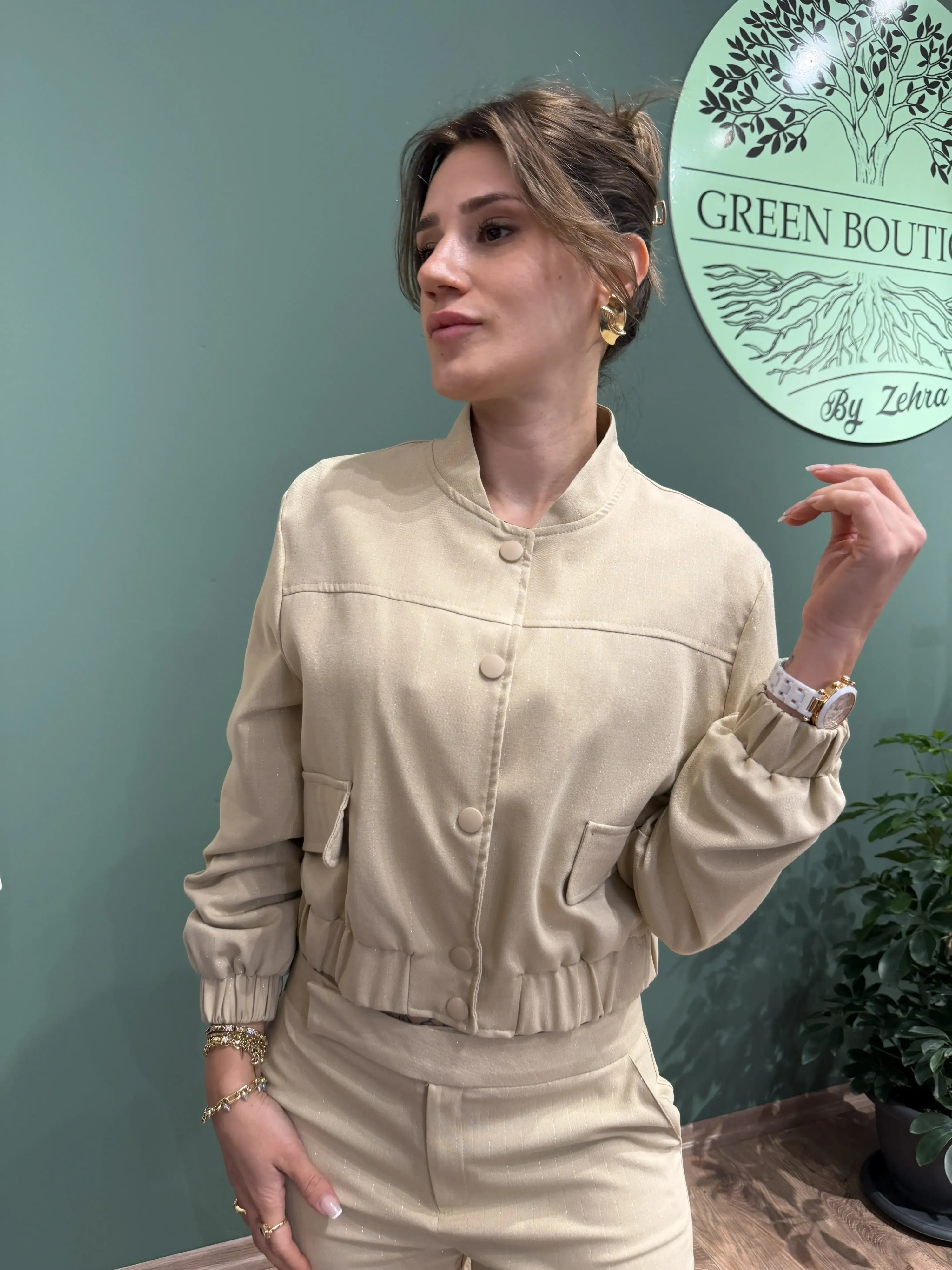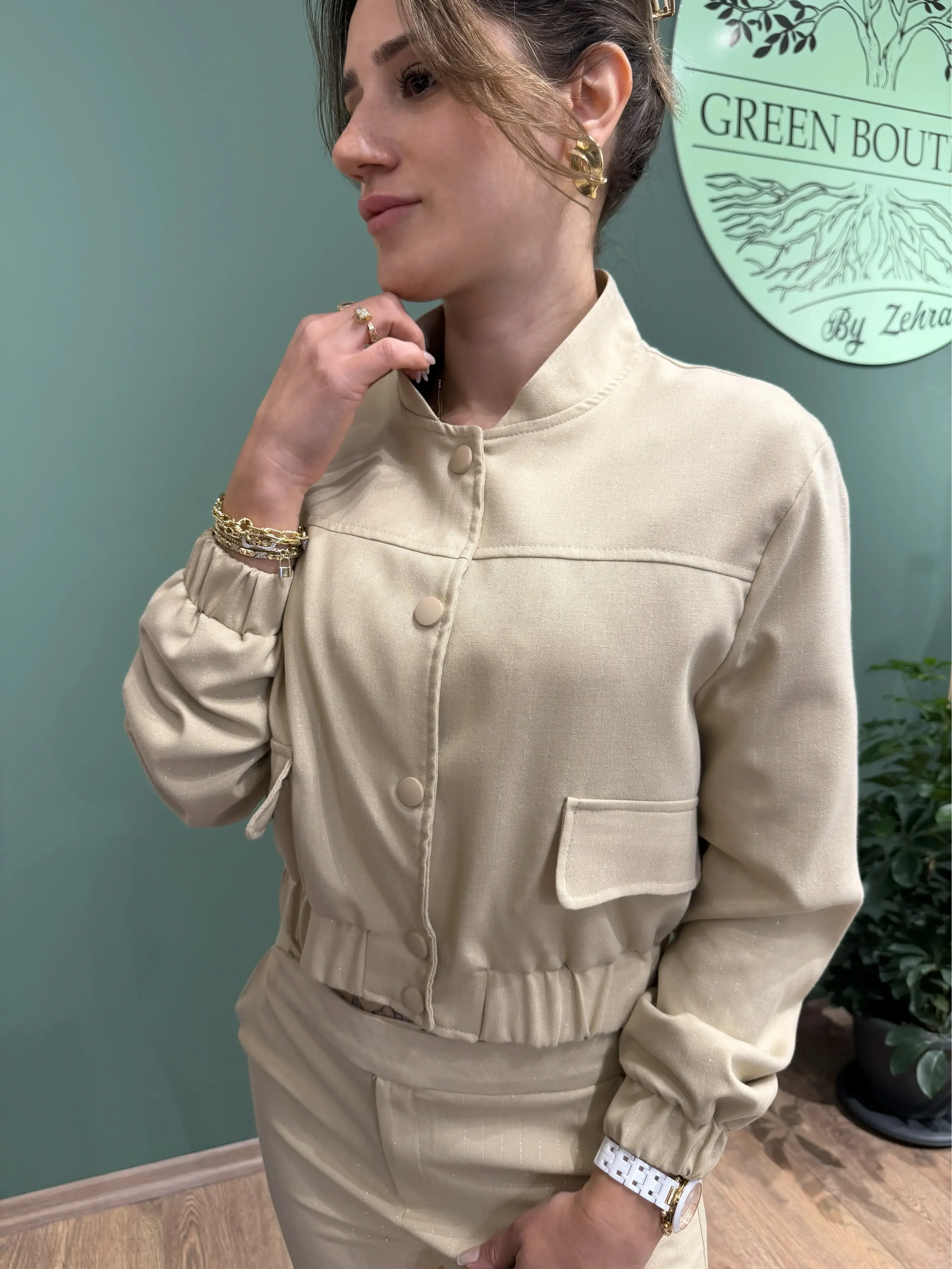 Çıtçıtlı Cepli Simli Ceket & İspanyol Paça Simli Pantolon Takım – Bej | Işıltılı, Şık ve Modern Tasarım