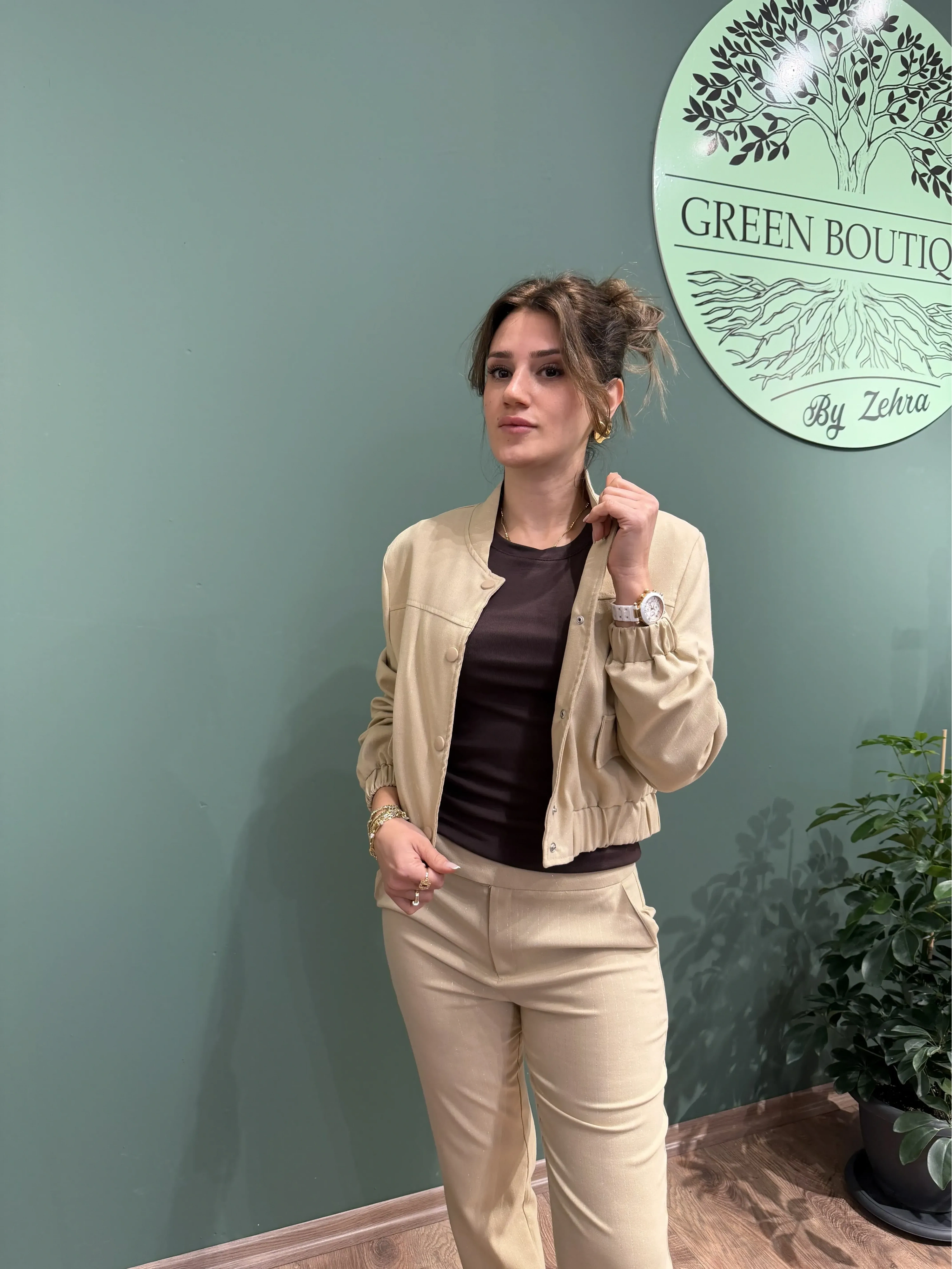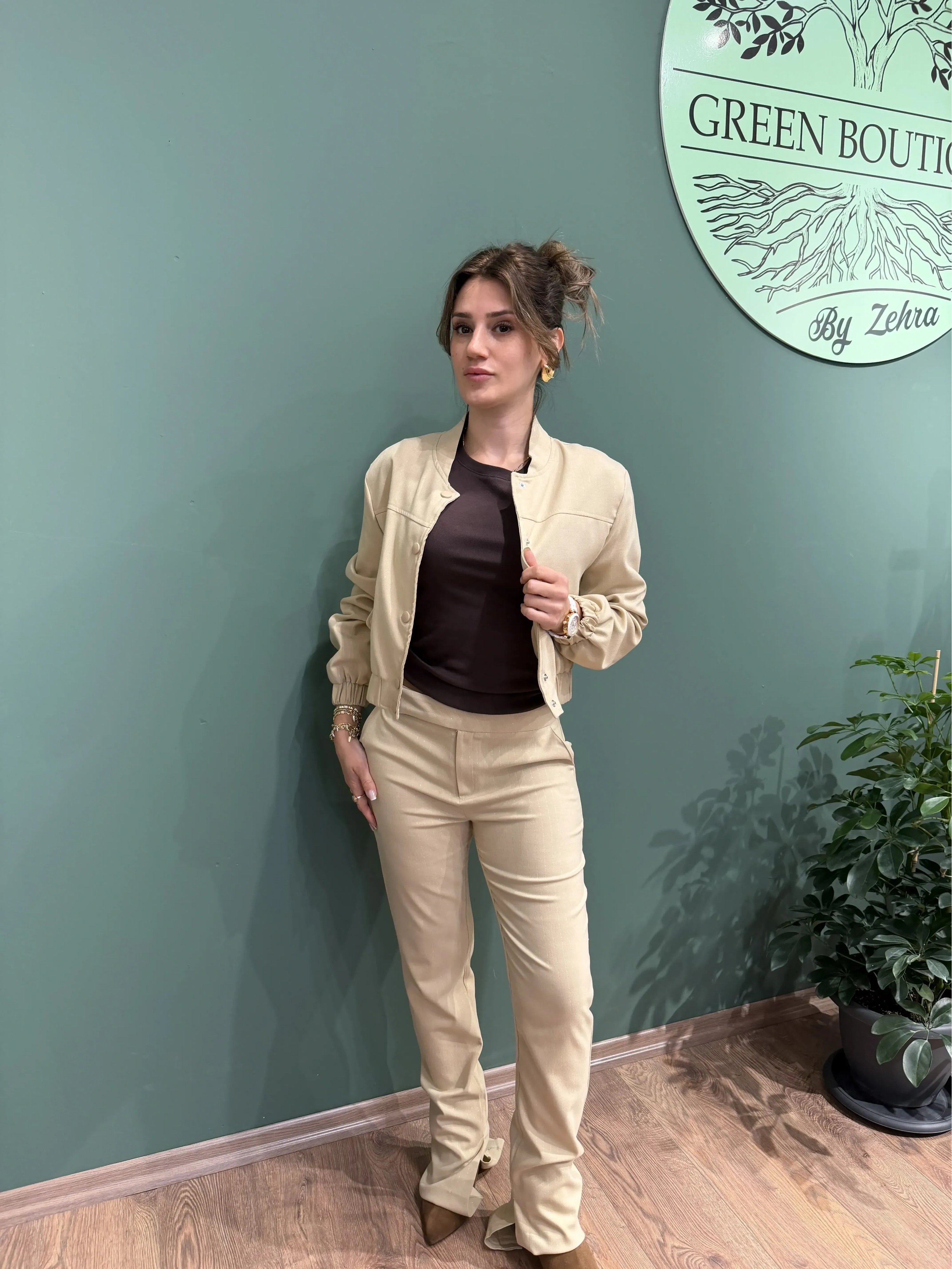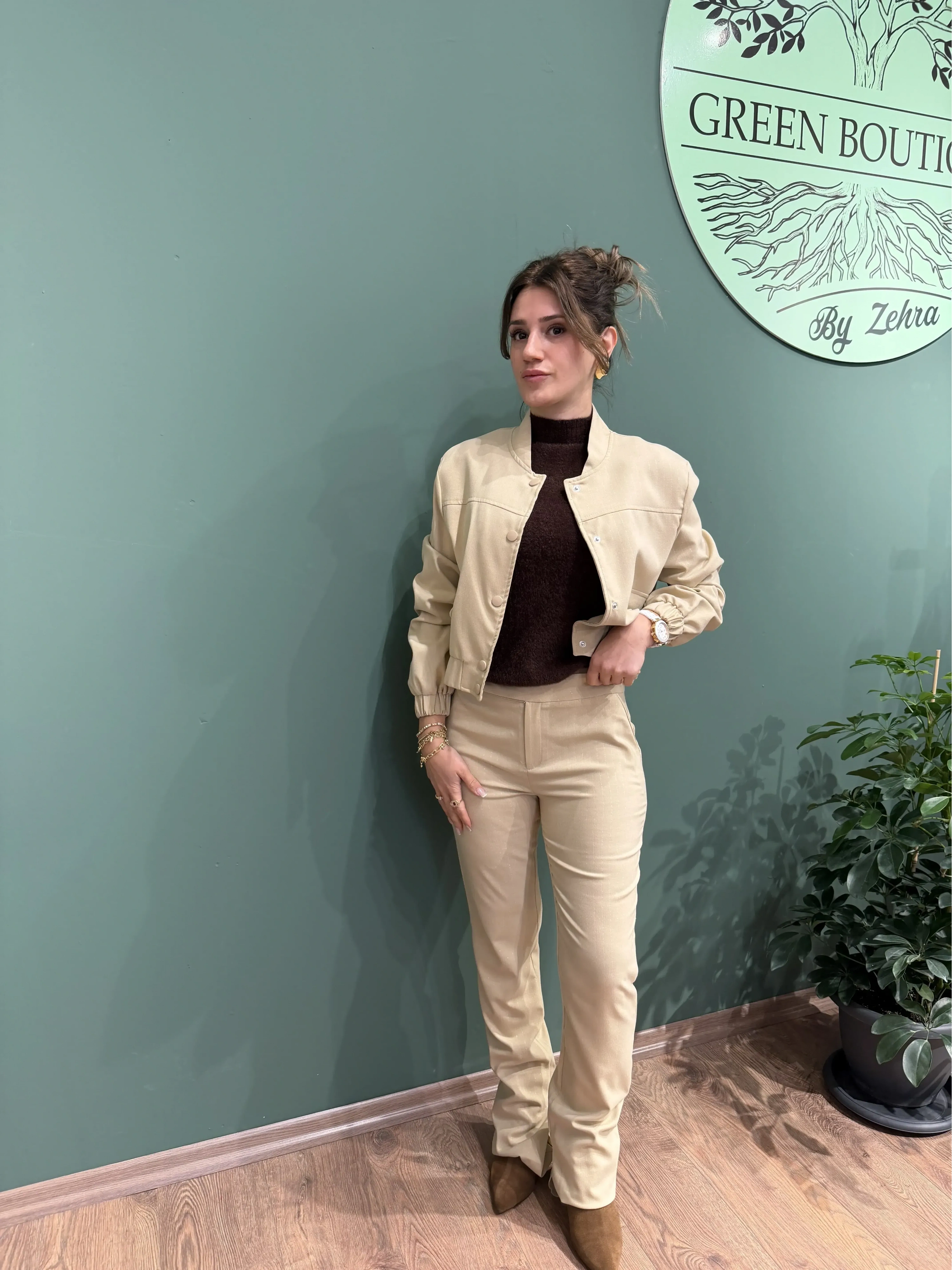 Sim detaylarıyla göz alıcı, bej tonuyla elegan bir hava sunan bu takım; hem rahat hem de iddialı görünmek isteyenler için ideal. Ceketinin modern çıtçıt tasarımı ve pantolonunun ispanyol paça kesimi sayesinde hem trendy hem klasik çizgiyi bir araya getirir. Topuklu ayakkabılar, minimal takılar ve sade bir çanta ile mükemmel bir şıklık oluşturabilirsiniz.