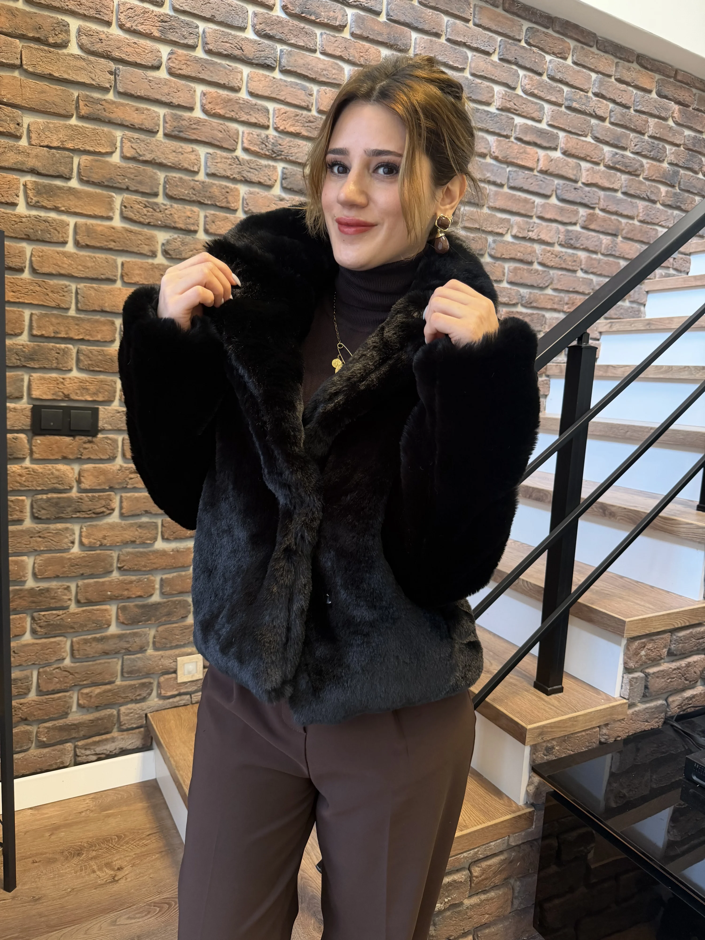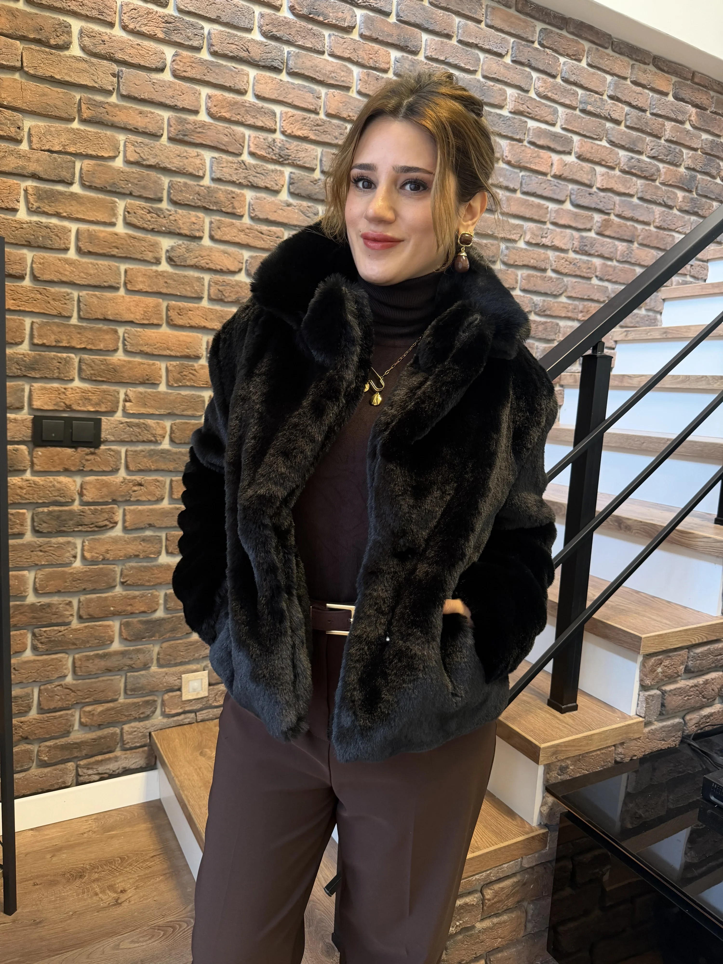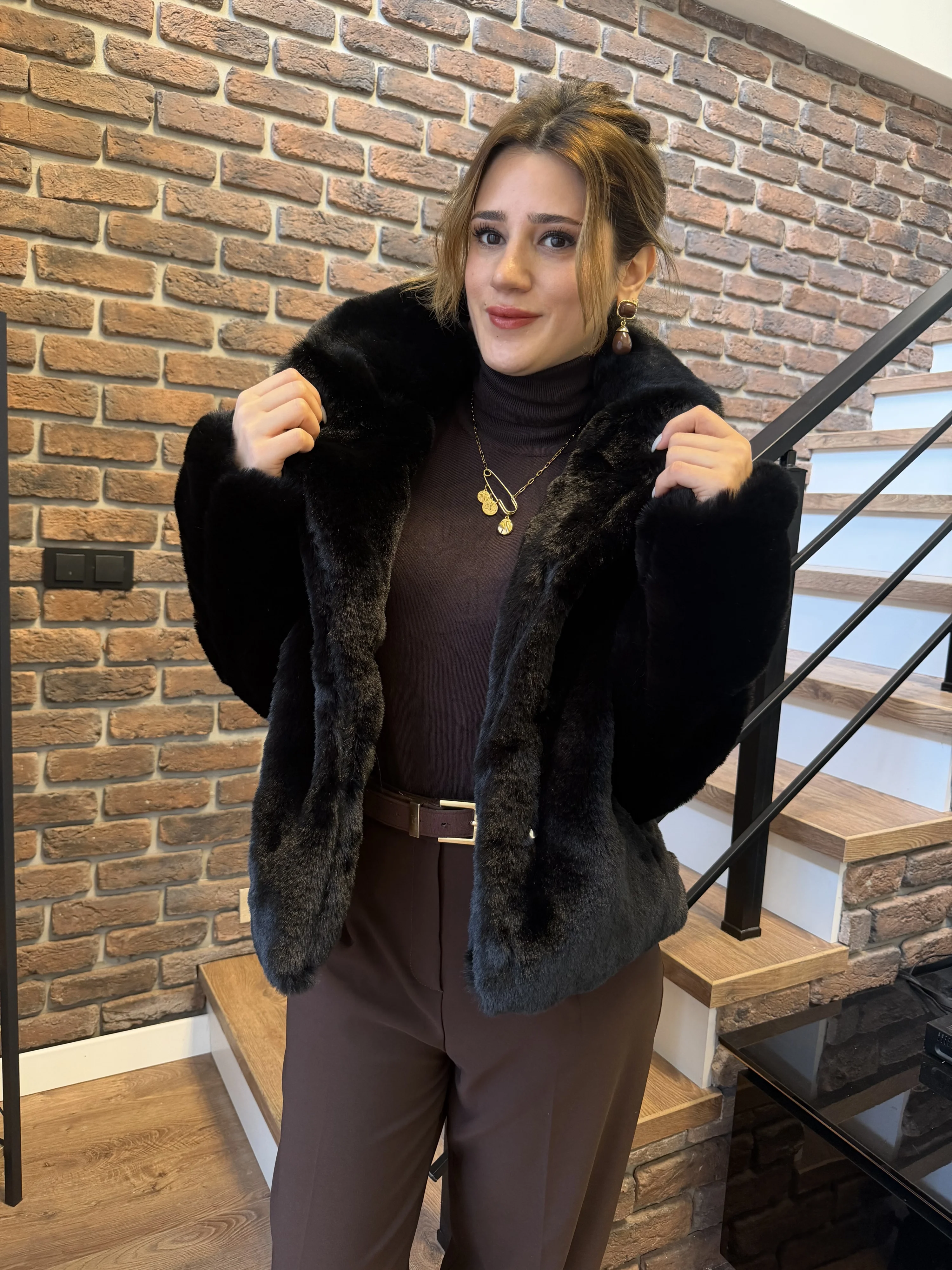 Bu siyah kürk mont; triko kazaklar, dar kesim pantolonlar, etekler ve çizmelerle mükemmel uyum sağlar. Minimal aksesuarlarla tamamlandığında sofistike ve modern bir stil yaratır. Soğuk kış günlerinde hem sıcak kalmak hem de şıklığından ödün vermemek isteyenler için ideal bir parçadır.
