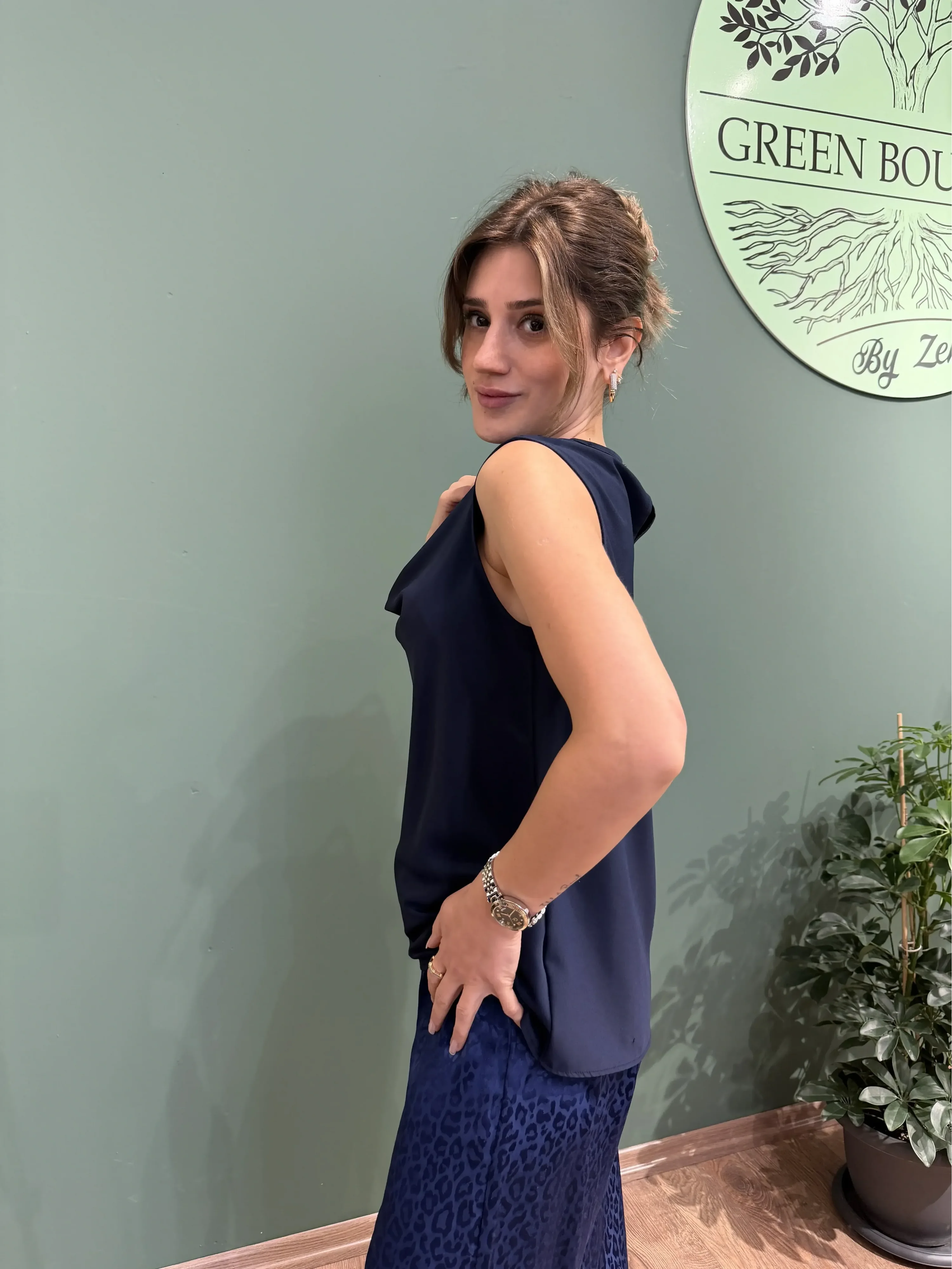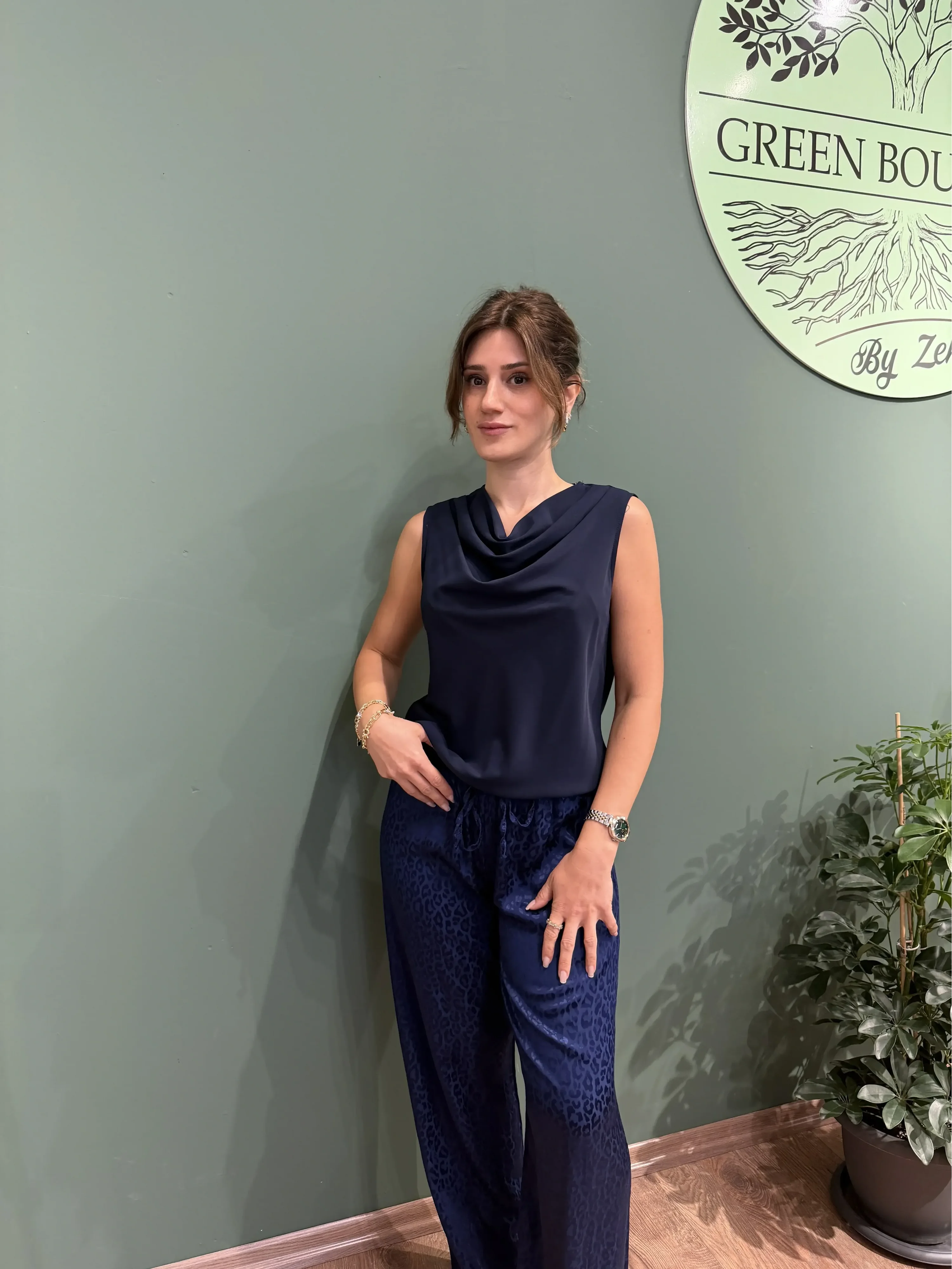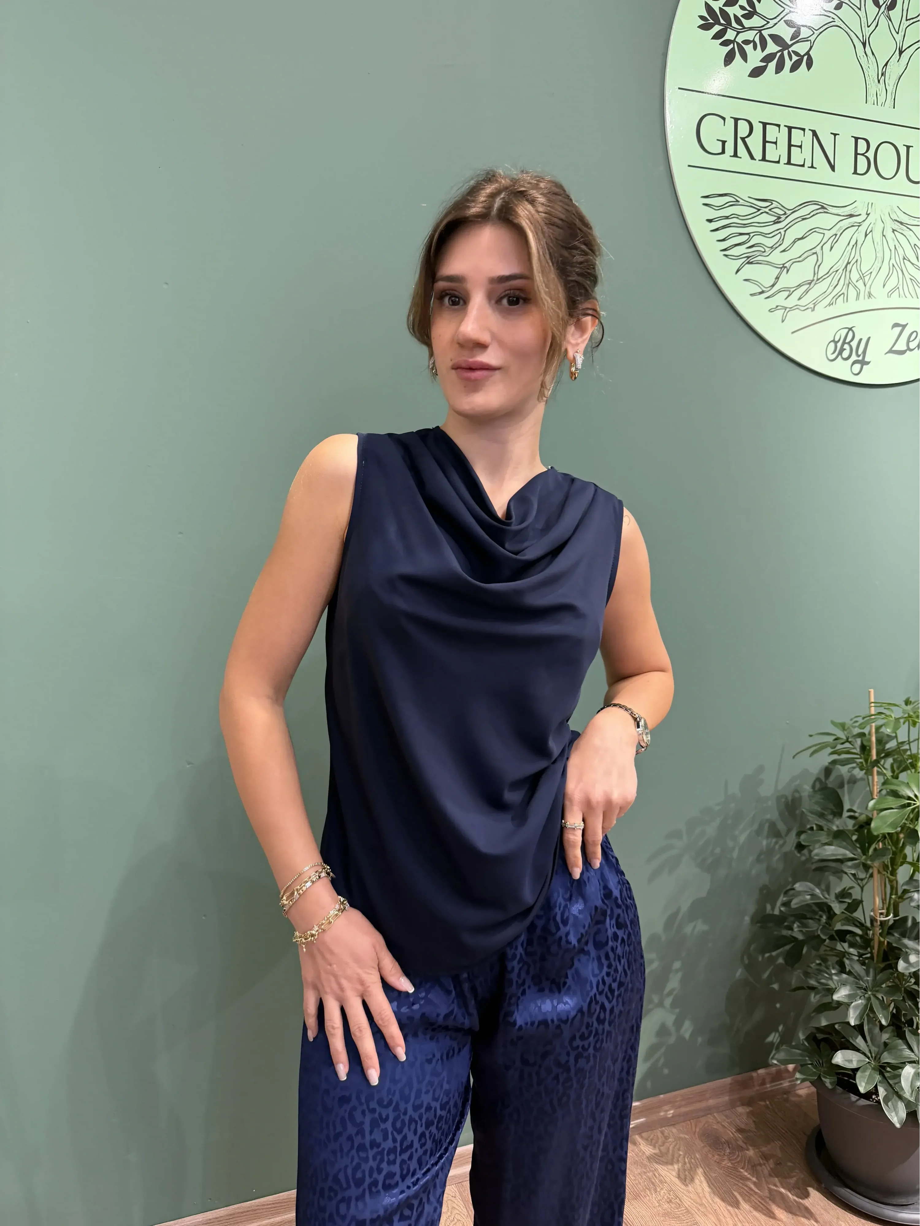 Şıklığı zarafetle buluşturan Degaje Yaka Kolsuz Bluz, lacivertin asil tonuyla her kombine sofistike bir dokunuş katıyor. Dökümlü degaje yaka detayı, bluzun modern ve feminen havasını güçlendirirken kolsuz tasarımı da hem şık hem konforlu bir kullanım sunuyor. İster ofiste ister özel davetlerde… Bu bluz her ortamda stilinizi kusursuz şekilde tamamlar.