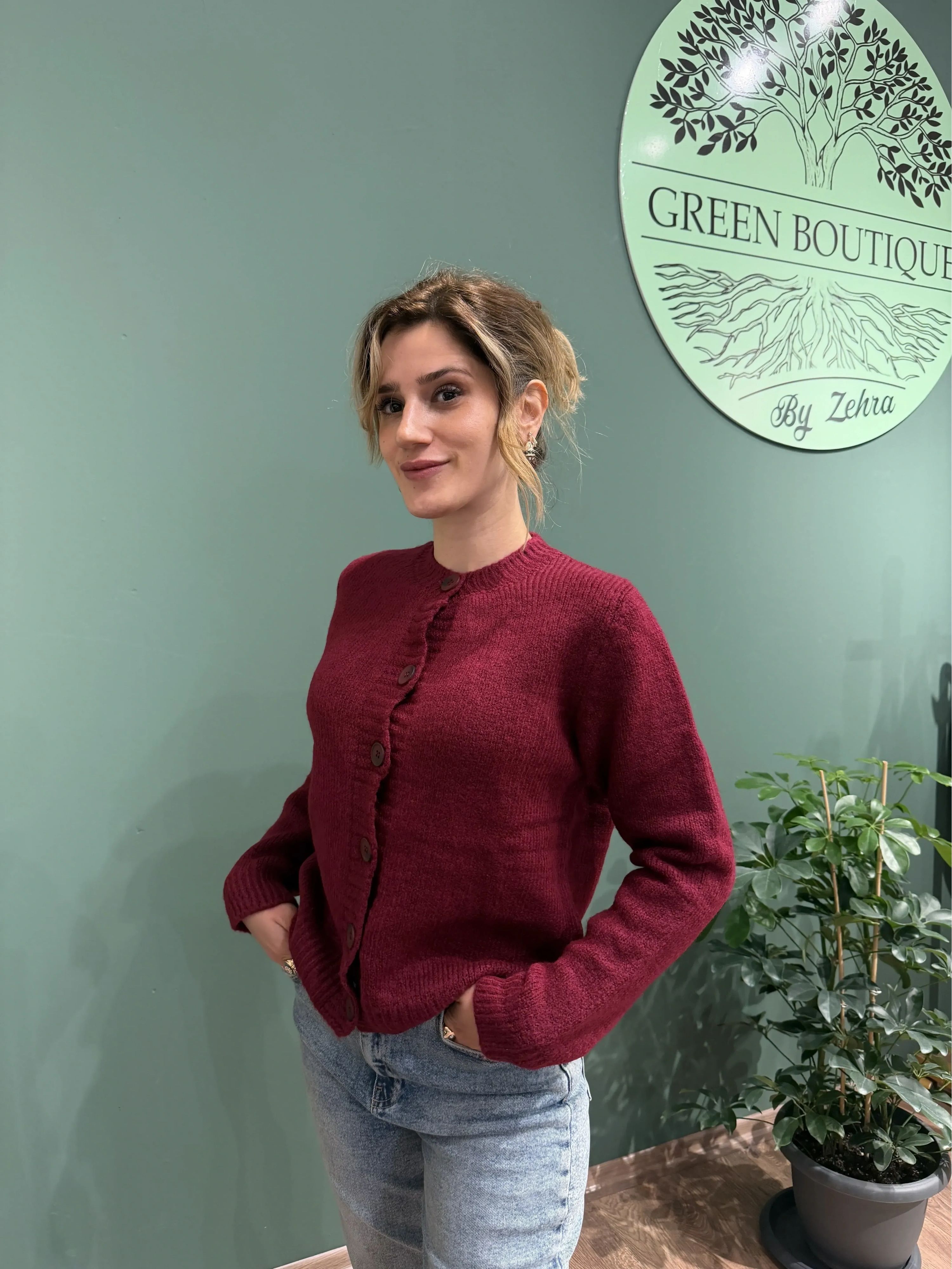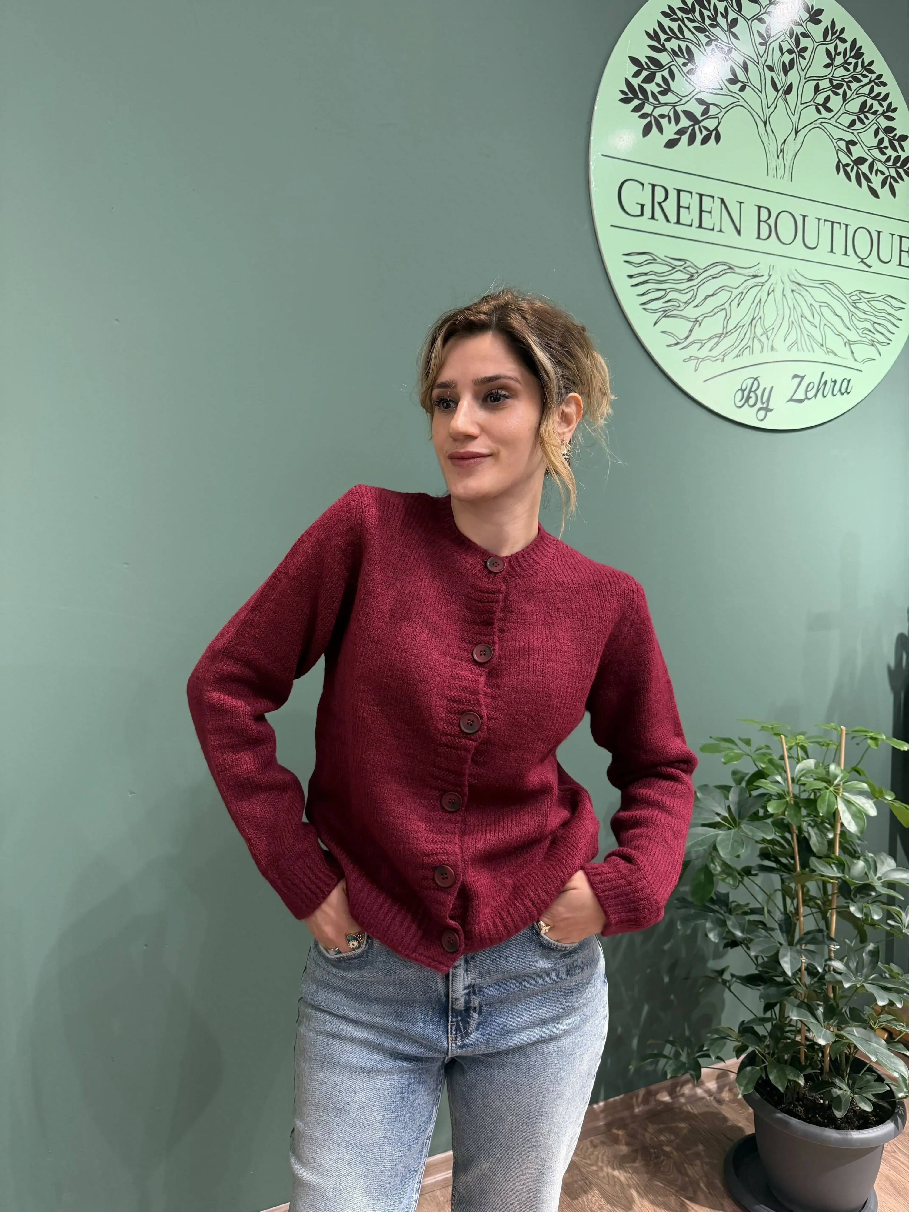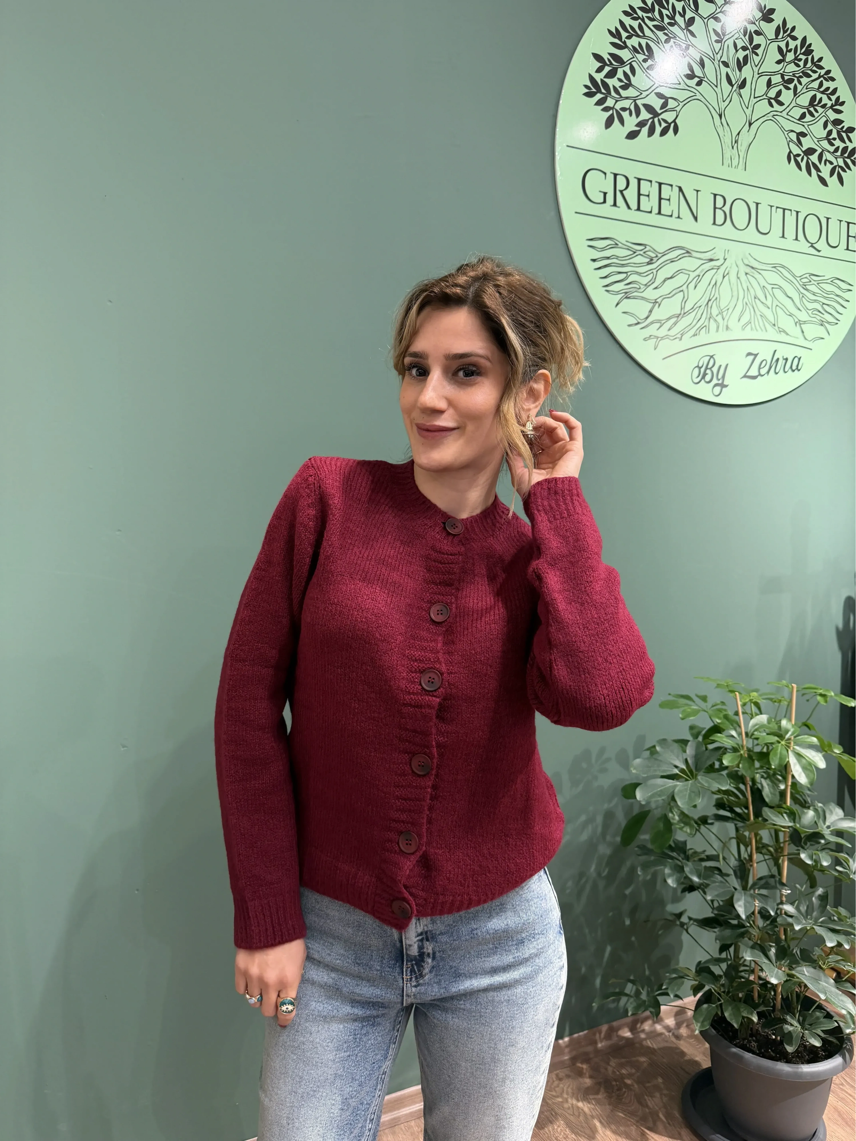 Zarif tasarımı ve yumuşacık dokusuyla öne çıkan Düğmeli Triko Hırka – bordo, her mevsim kullanıma uygun yapısıyla gardırobunun vazgeçilmez parçalarından biri olacak. Modern ve sade çizgileriyle rahat şıklığı bir araya getiren bu hırka, düğme detaylarıyla hem şık hem de kullanışlı bir stil sunar.