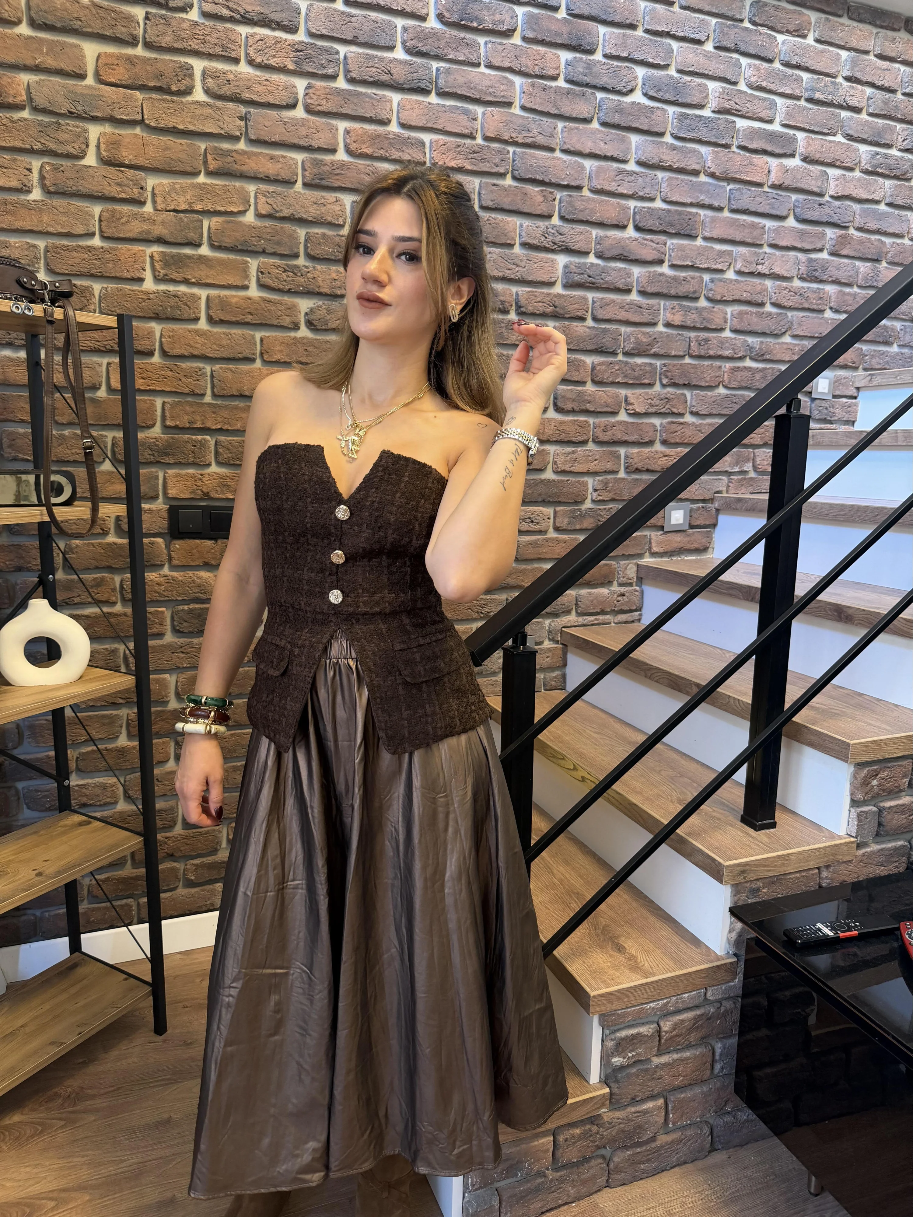 Düğmeli Tüvit Straplez Büstiyer Bluz – Kahverengi
