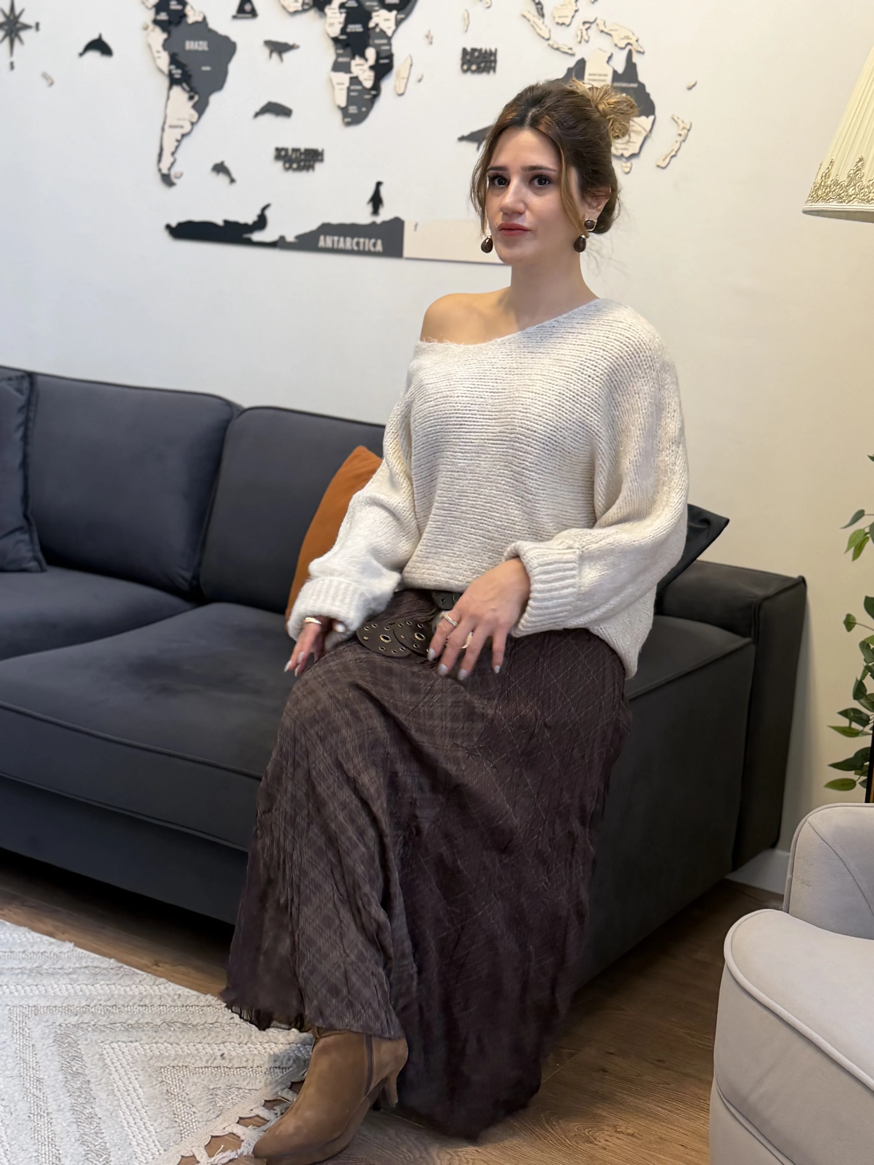 Doğal dokusu ve zamansız deseniyle öne çıkan kahverengi ekose desenli kırışık görünümlü etek, rahat şıklığı benimseyen kadınlar için tasarlandı. Kırışık dokulu kumaş yapısı, eteğe modern ve özgzGünlük kombinlerden şehir stiline kadar geniş bir kullanım alanına sahip olan bu ekose etek, triko kazaklar, basic tişörtler veya gömleklerle kolayca kombinlenebilir. Kahverengi tonunun sıcak ve sofistike duruşu, sezon trendleriyle uyumlu bir stil sunar.