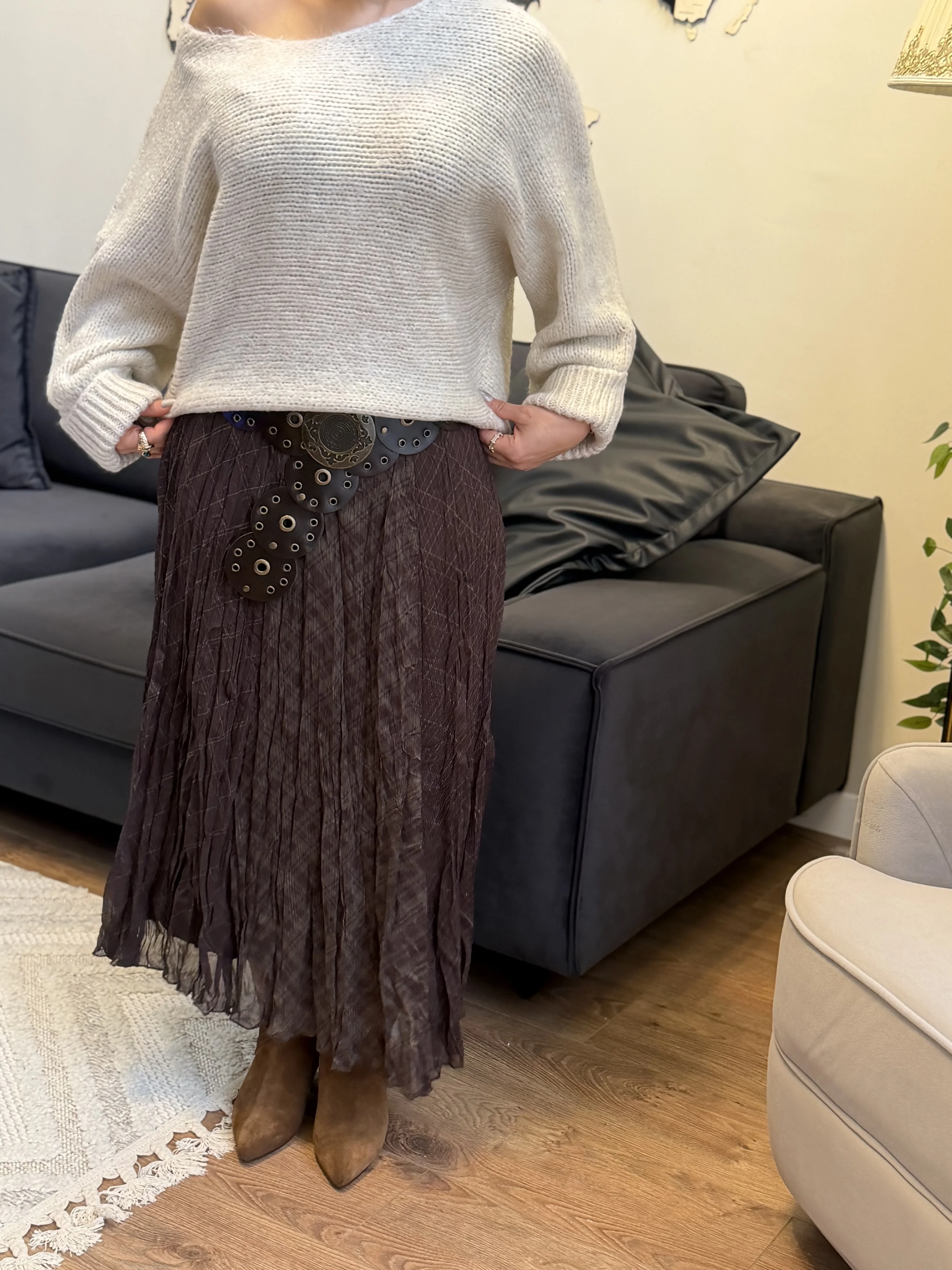 Bu kahverengi ekose kırışık görünümlü etek, zahmetsiz şıklık arayanların gardırobunun vazgeçilmez parçası olacaktır.
