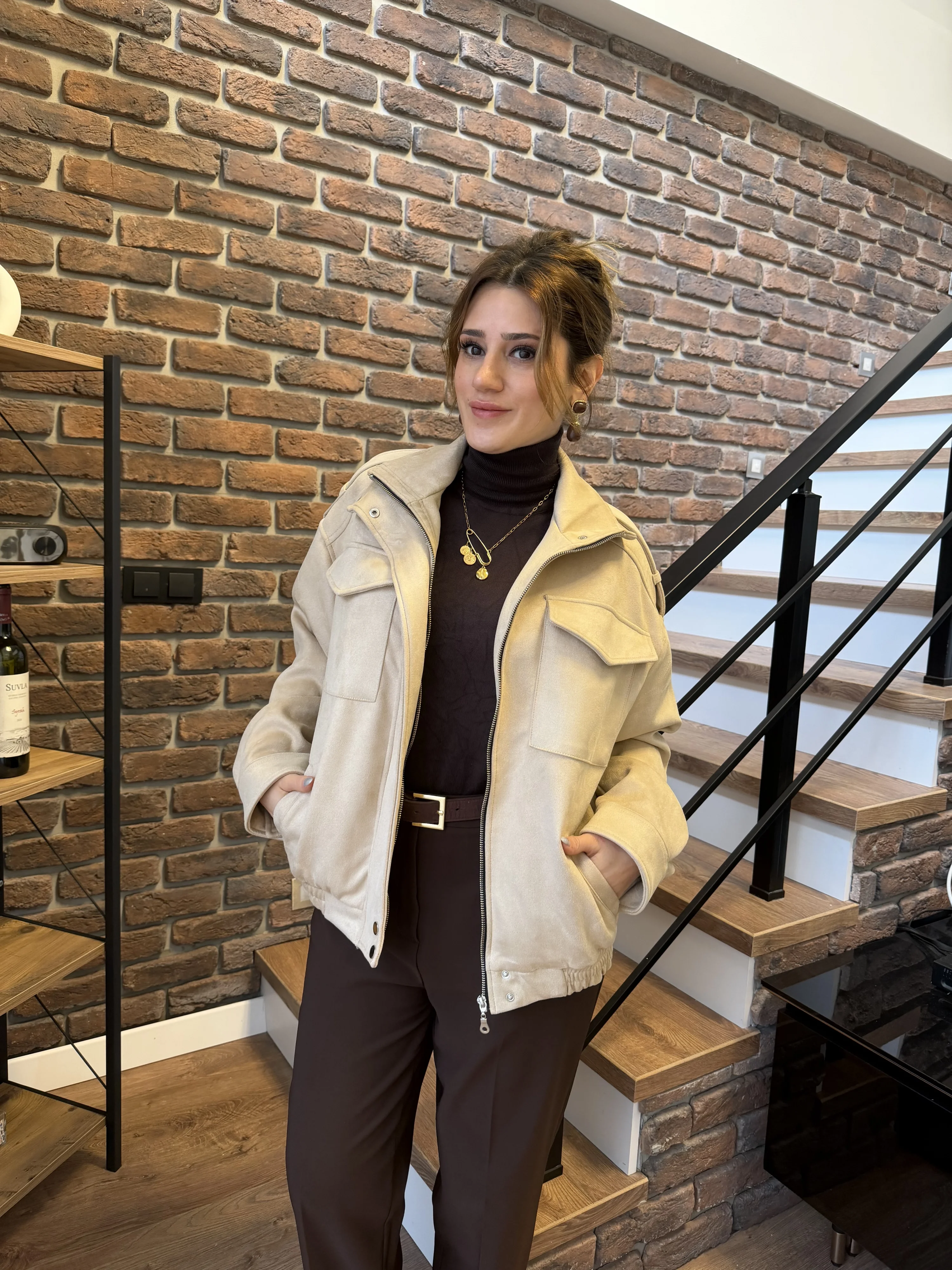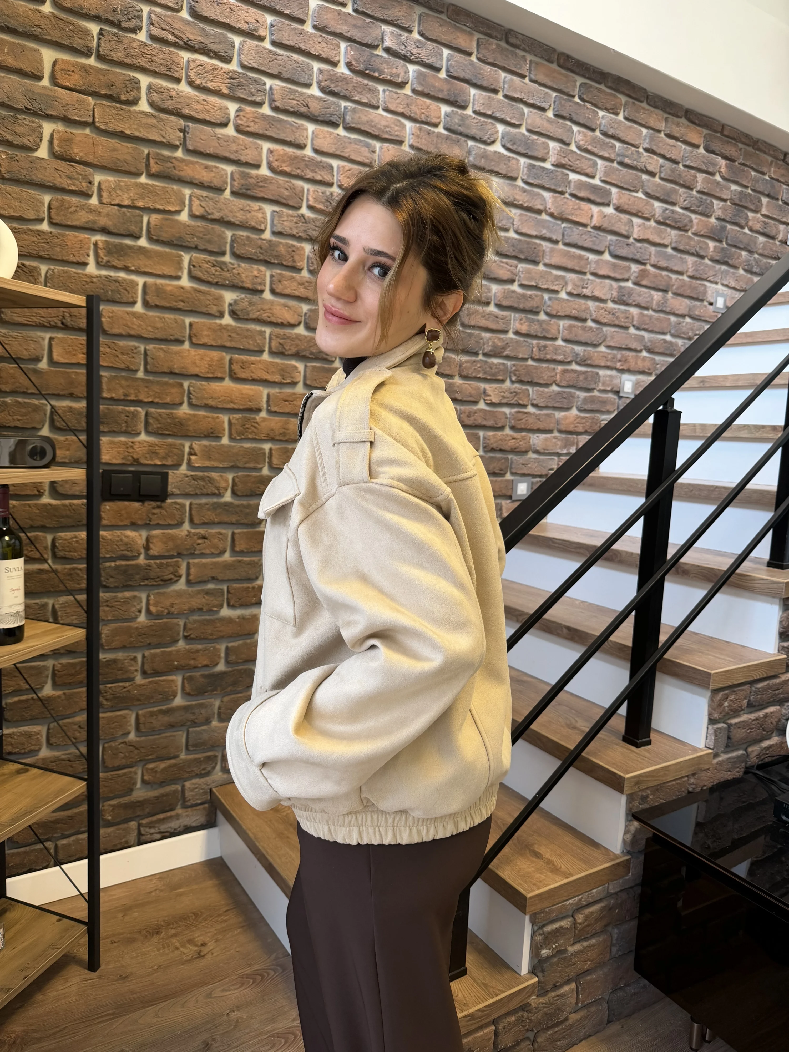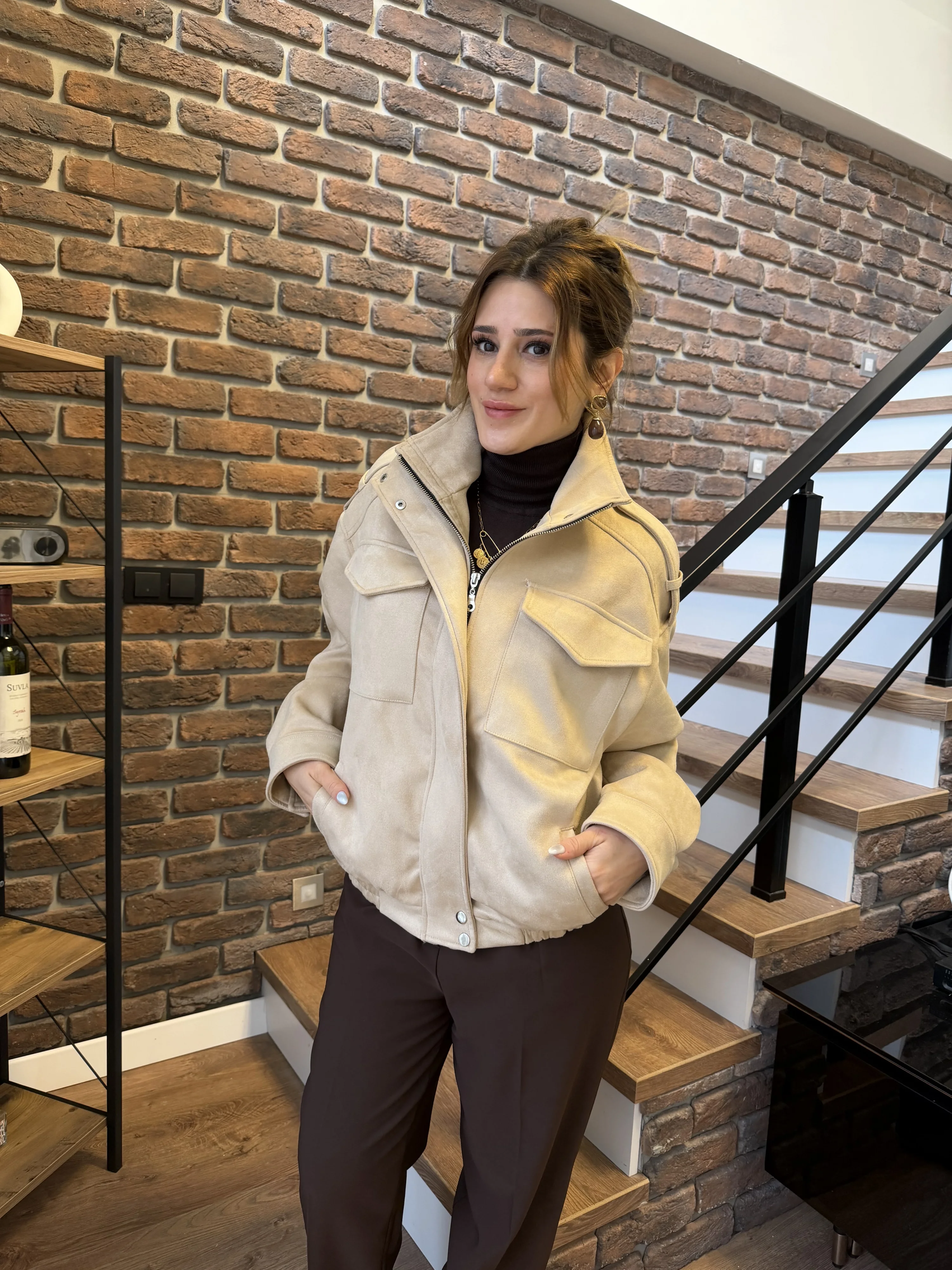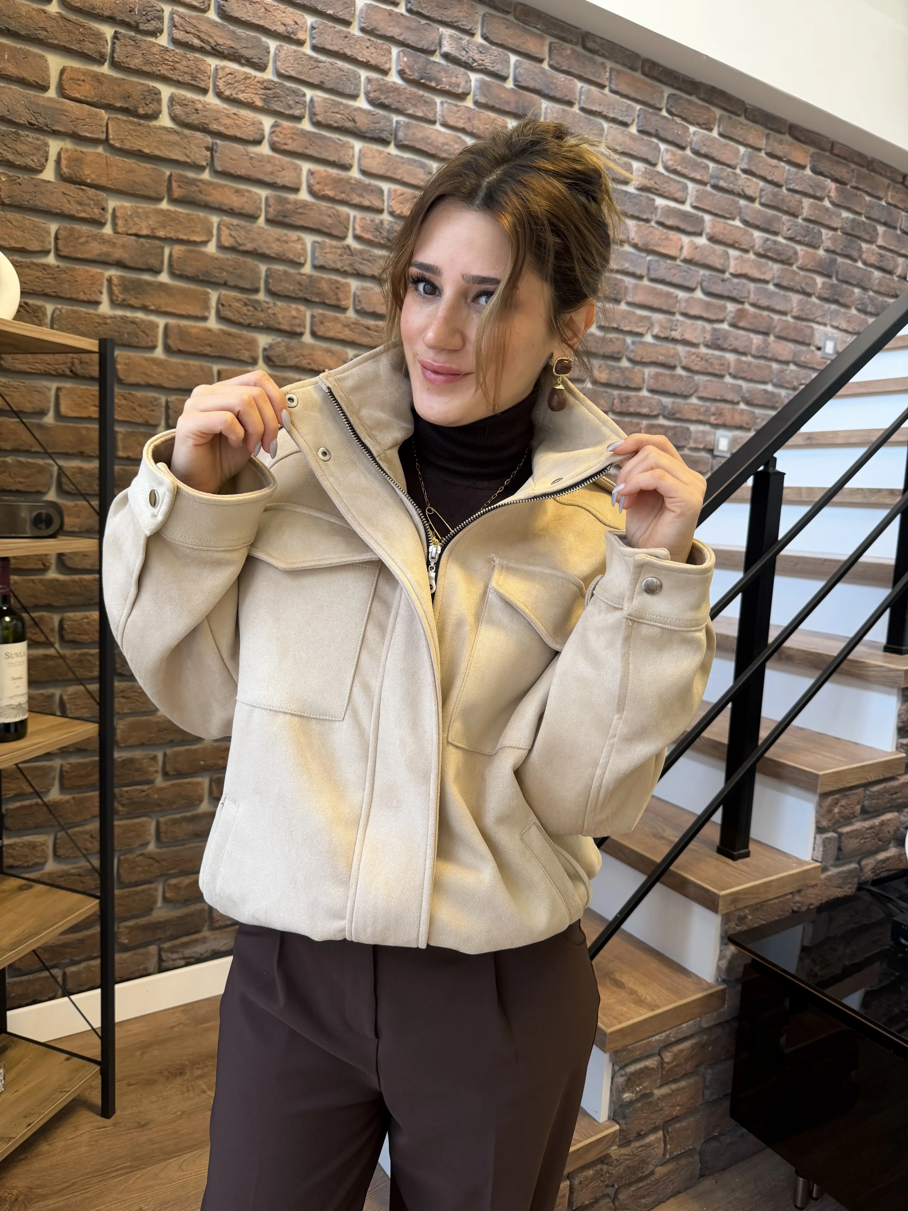 Geniş Cep Detaylı Süet Bomber Ceket – Bej