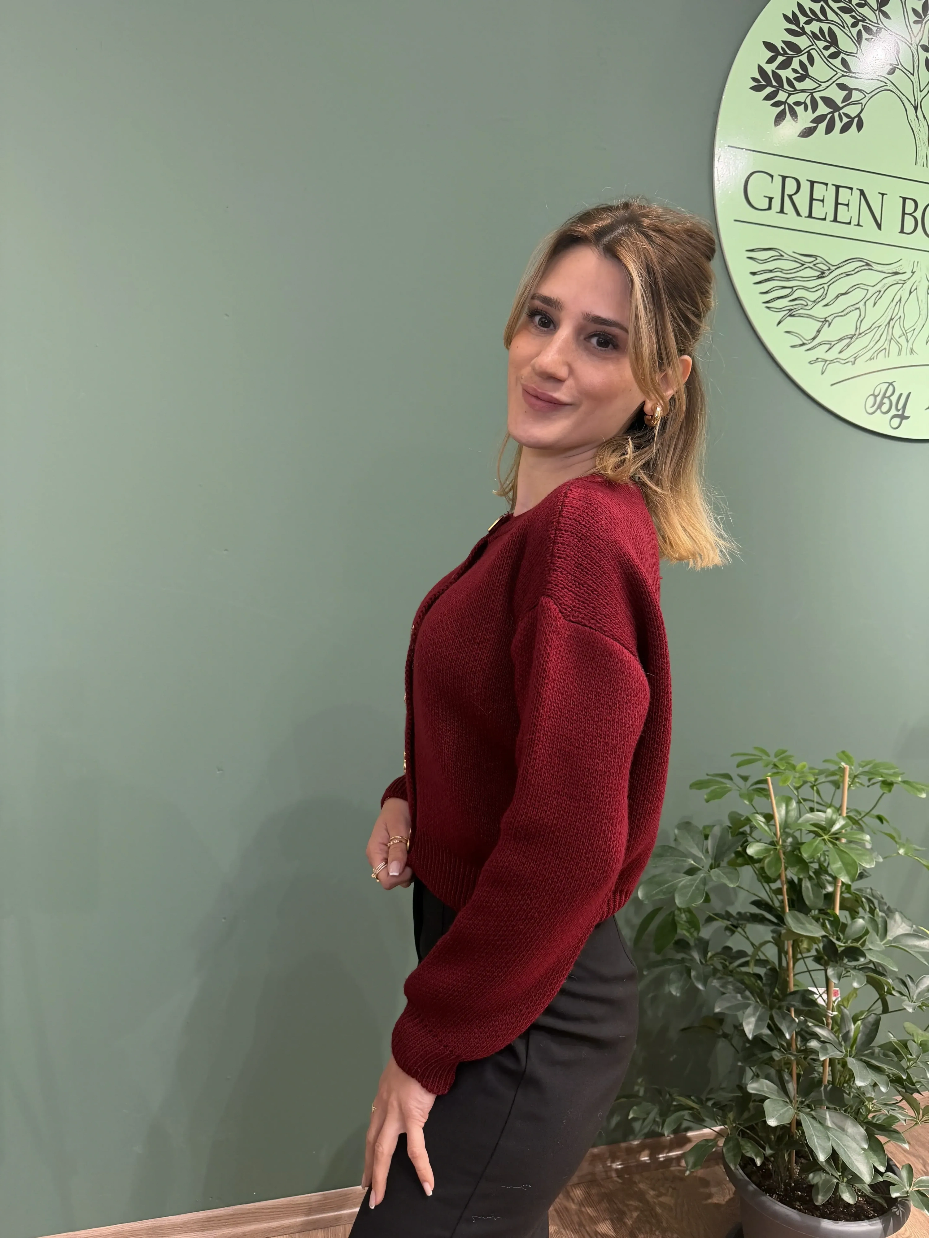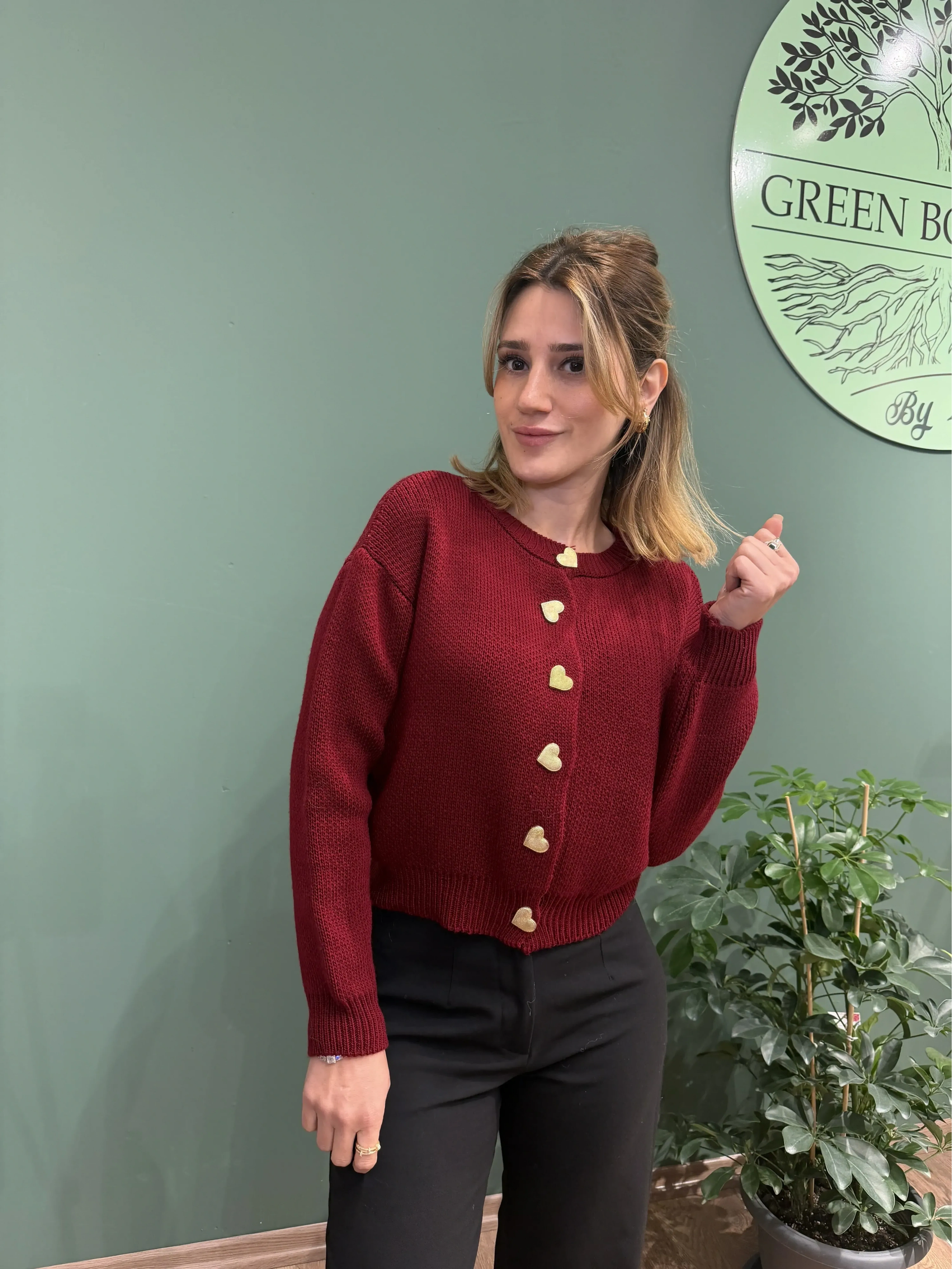 Bu hırka, hem şık hem de rahat olmayı isteyenler için ideal bir seçimdir. Minimal detayları ve sıcak bordo rengi ile her mevsime uyum sağlar. Kombinlerinizi tamamlayacak zarif bir parça arıyorsanız, Gold Kalp Düğmeli Bisiklet Yaka Hırka tam size göre!