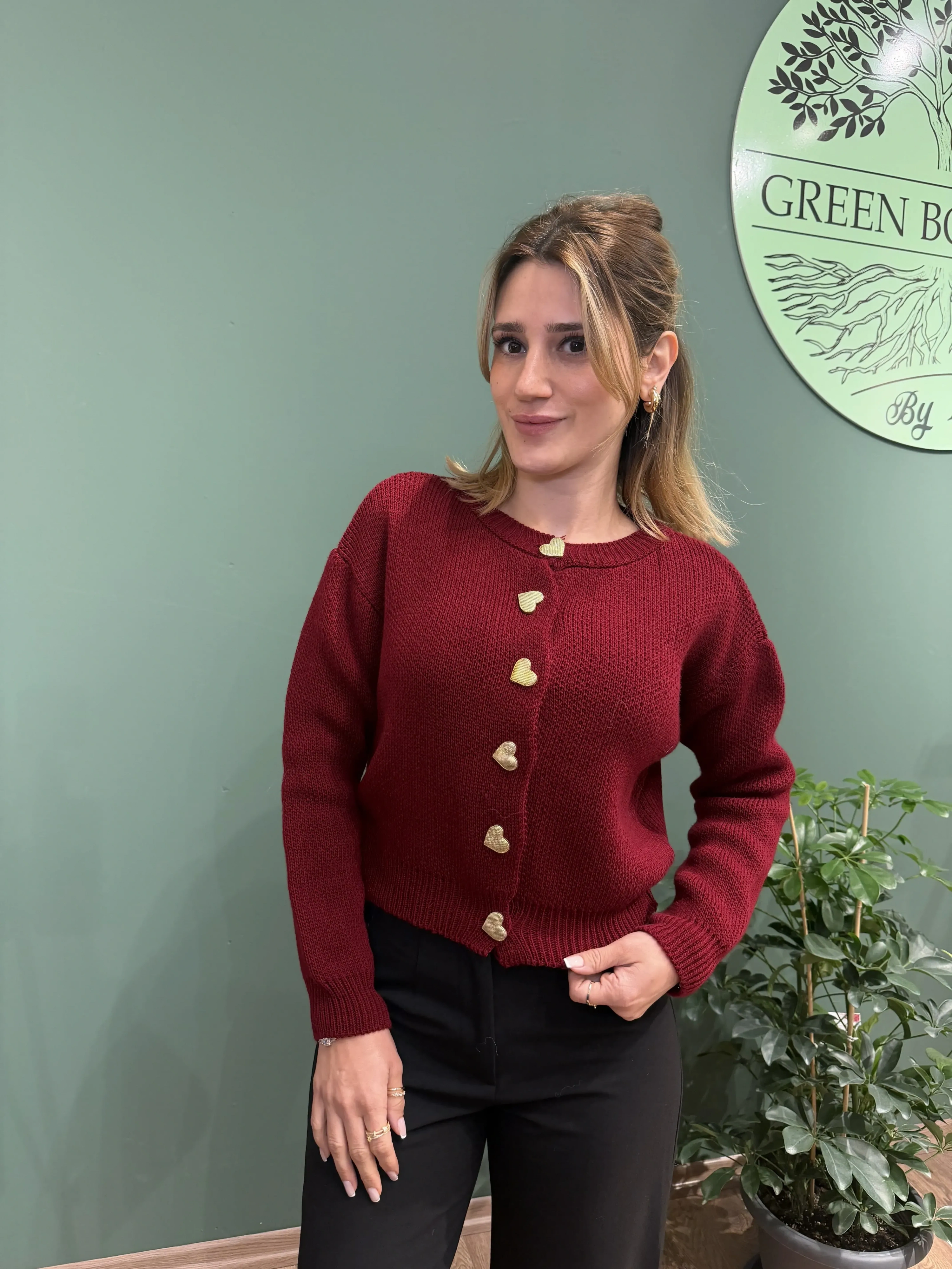 Gold Kalp Düğmeli Bisiklet Yaka Hırka – Bordo