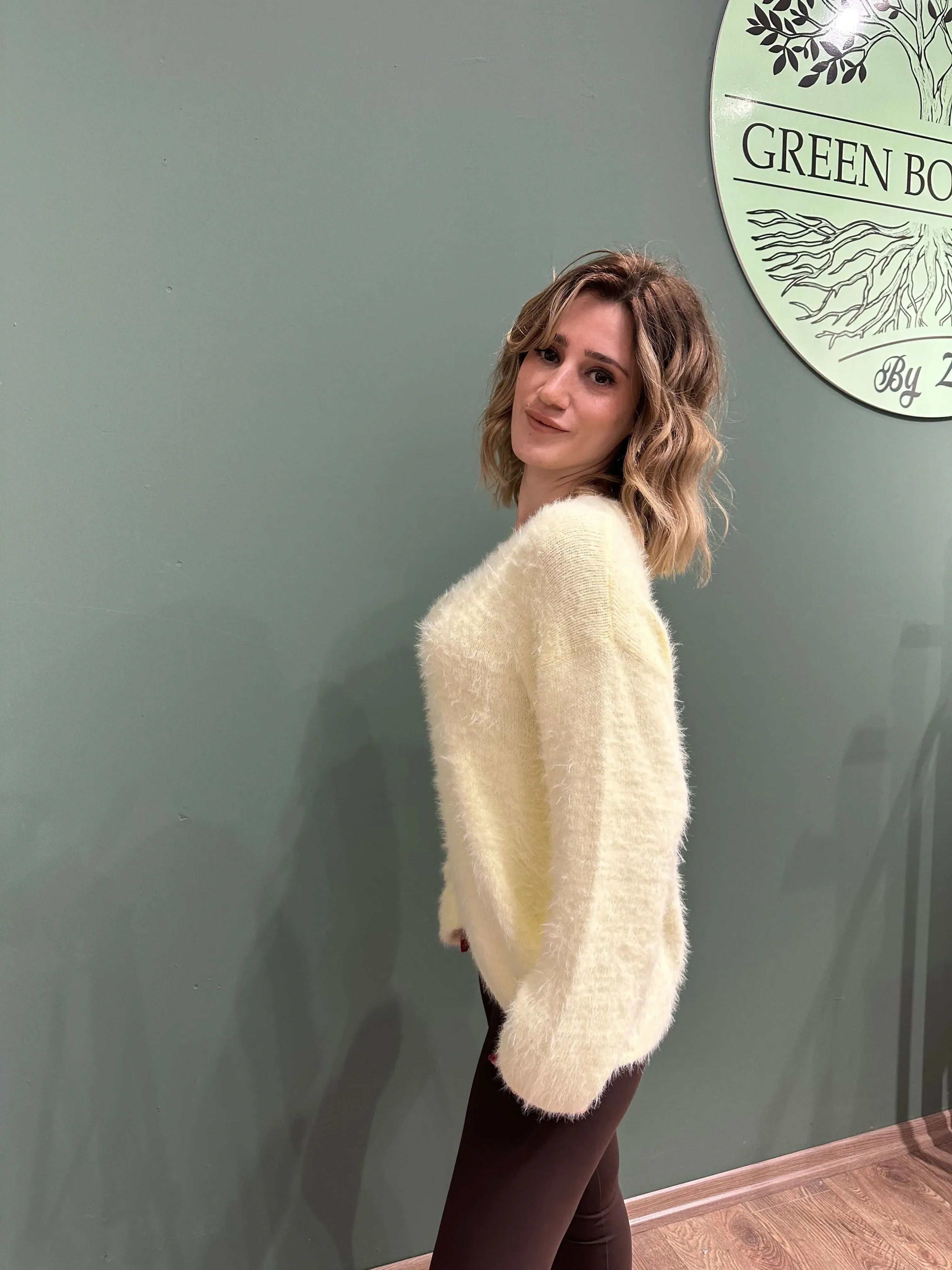 Sarı tonların sıcaklığını stilinize taşıyan kayık yaka triko kazak, hem şık hem de rahat bir görünüm sunar. Hafif ve yumuşak dokulu kumaşı sayesinde cildinize nazikçe dokunur, gün boyu konfor sağlar. İnce ancak dolgun örme yapısıyla hem serin bahar ve sonbahar günlerinde hem de kat kat giyimde ideal bir parçadır.