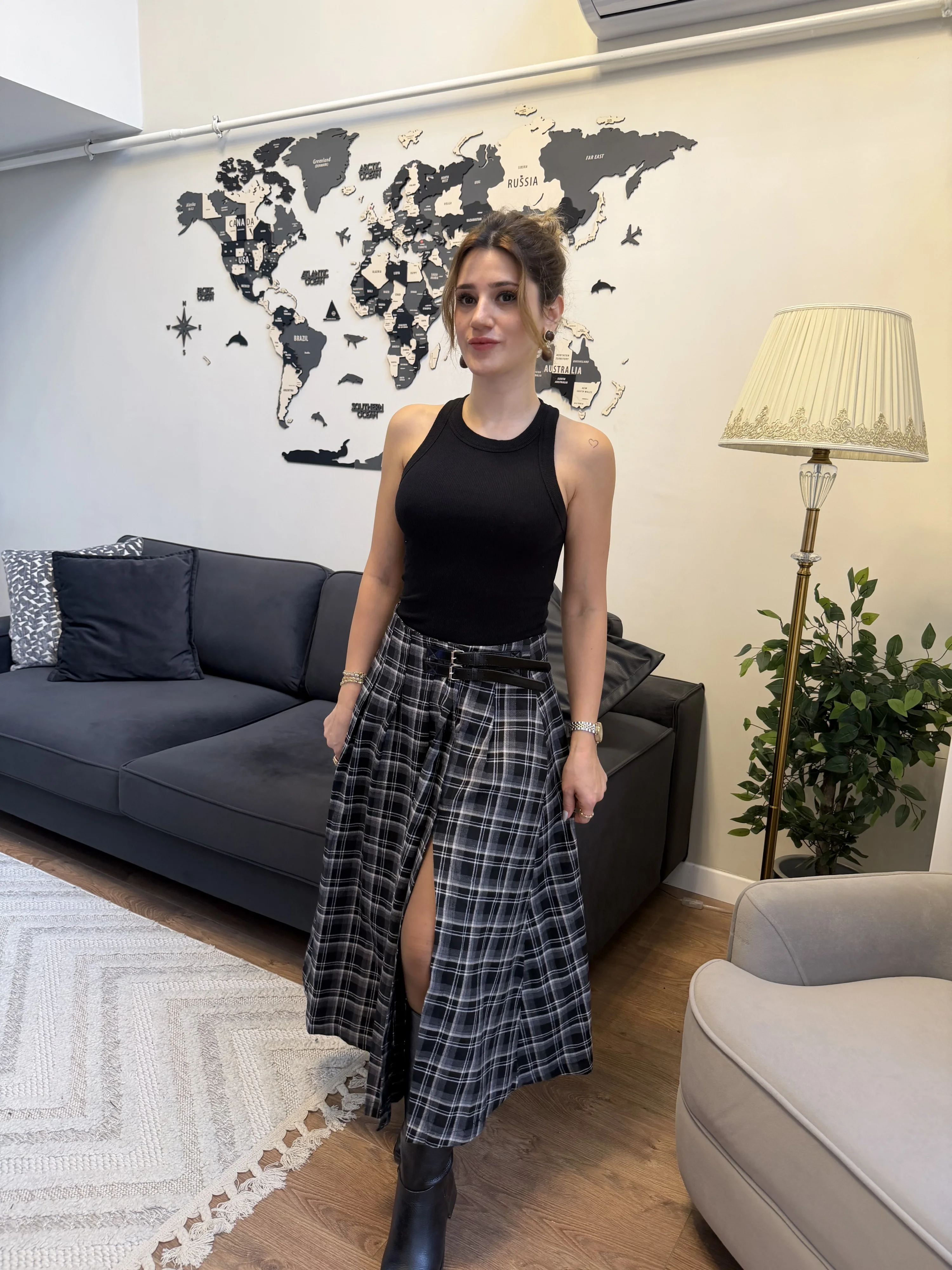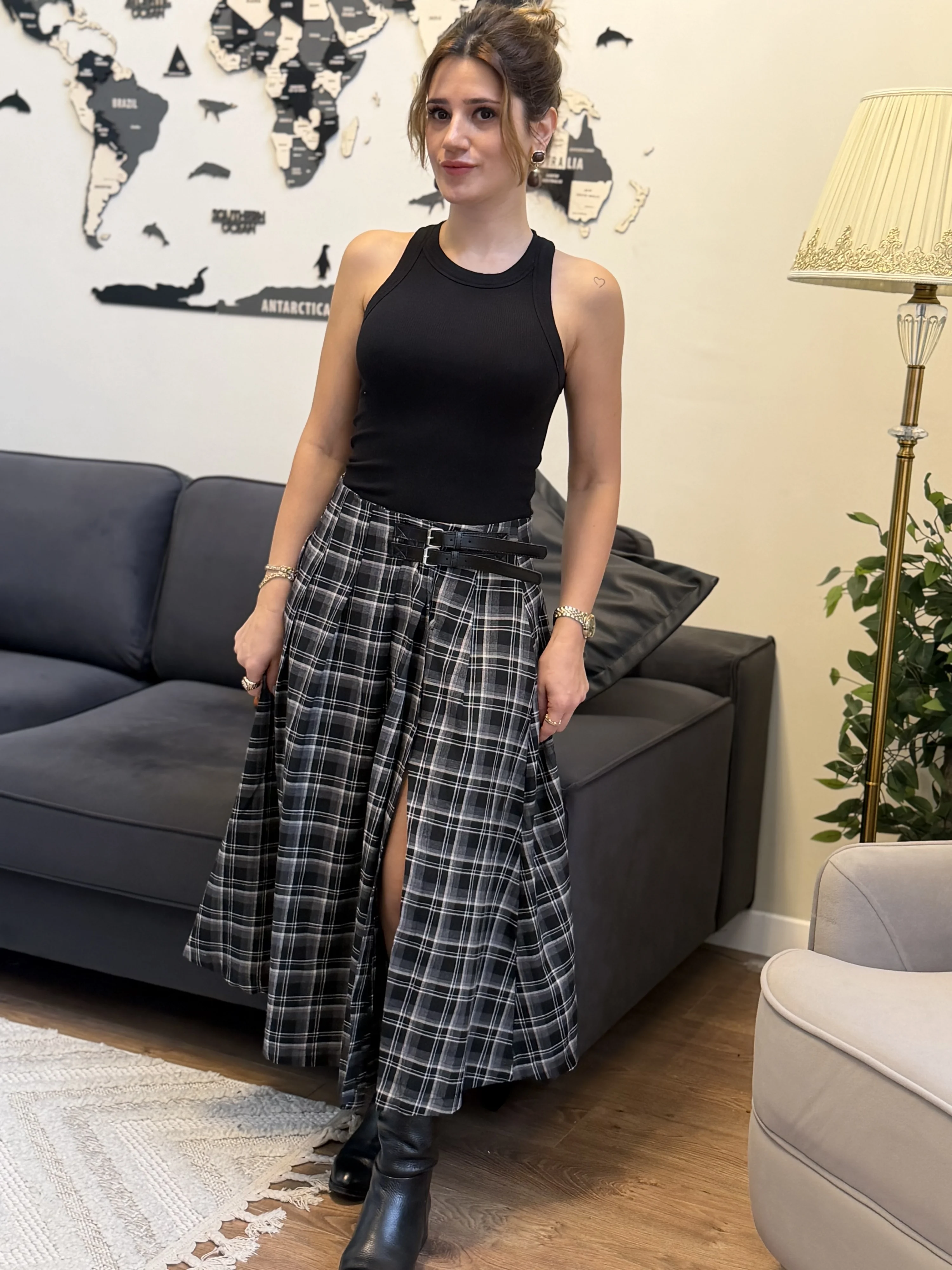 Antrasit Ekose Desenli Yırtmaçlı Etek – Kemer Detaylı Kadın Etek