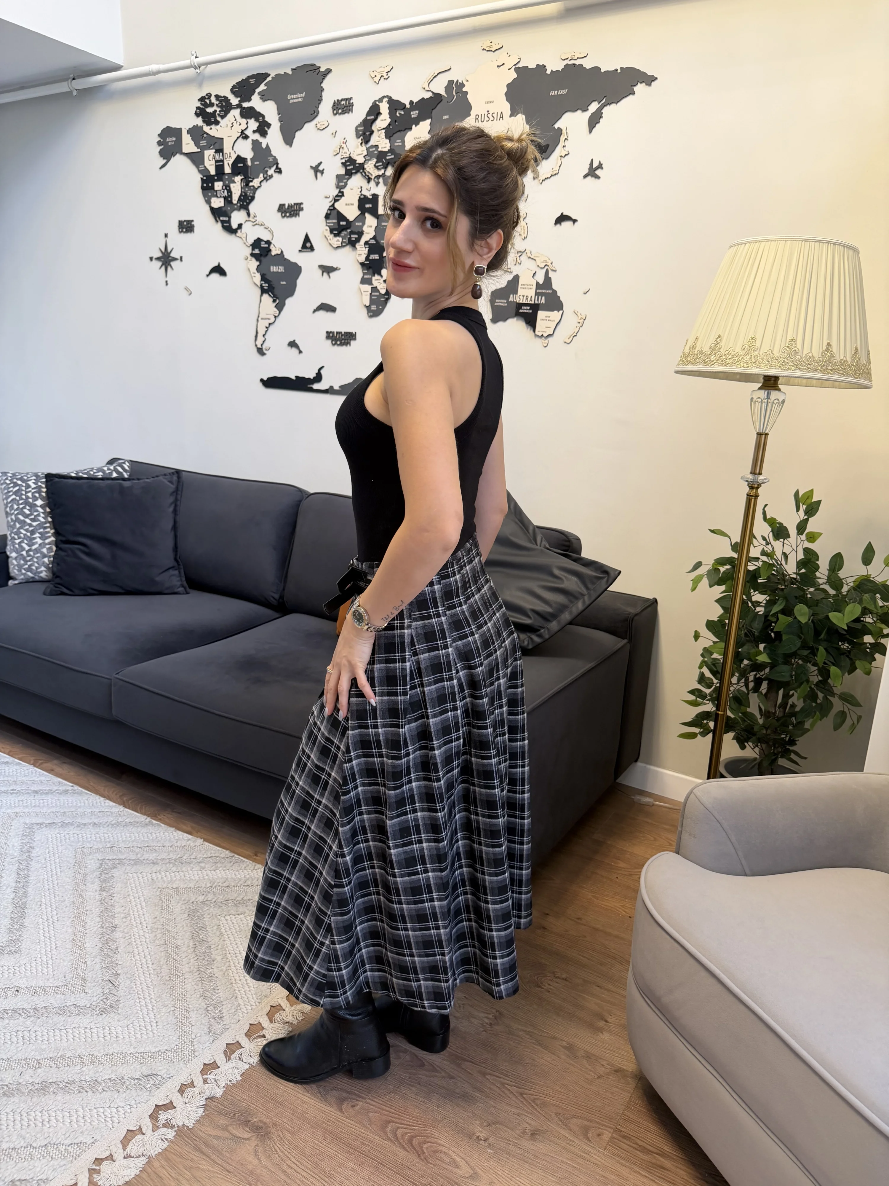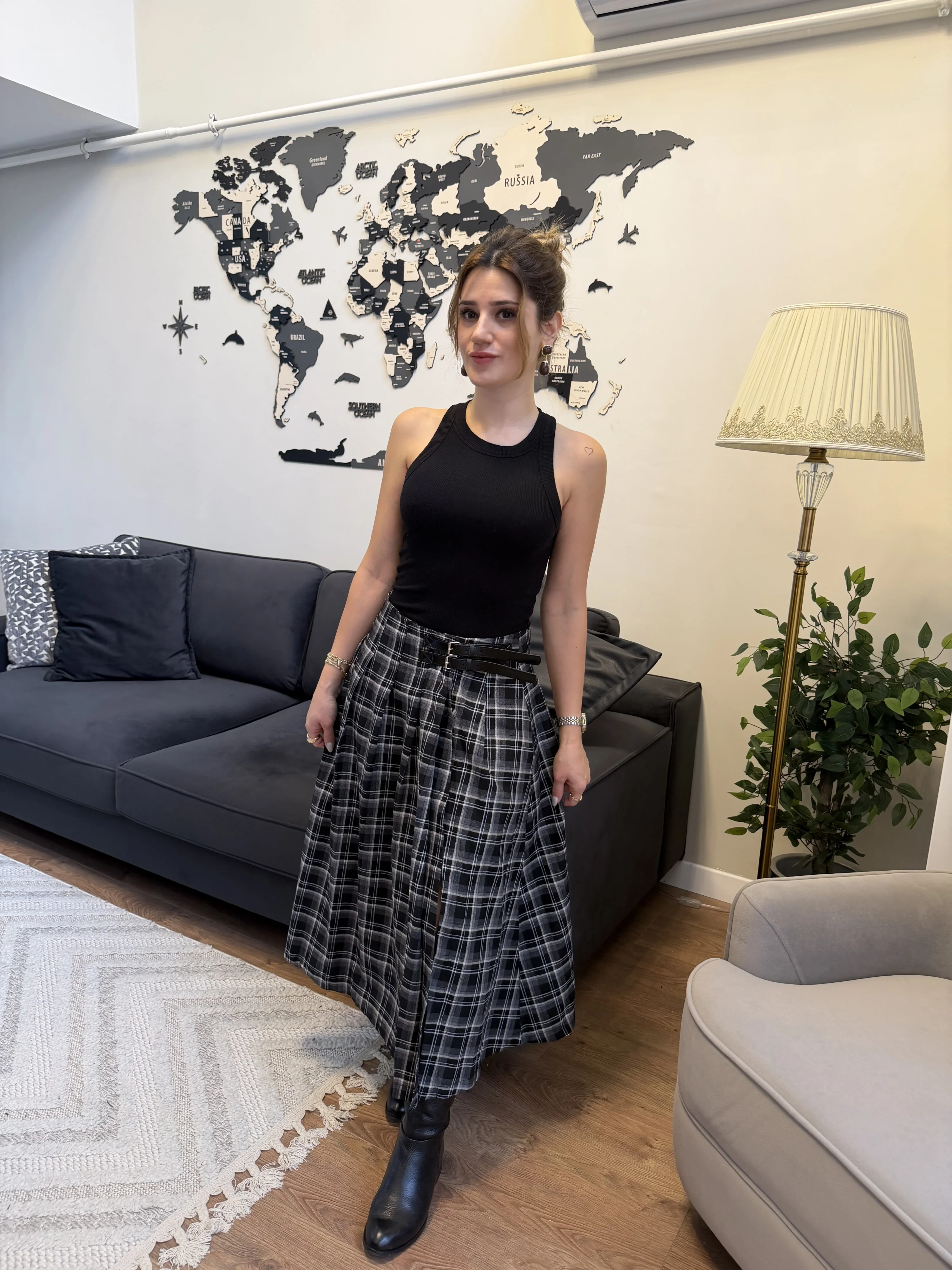 Bu kemer detaylı antrasit ekose etek, sade ama etkileyici bir stil arayan kadınlar için ideal bir seçimdir.