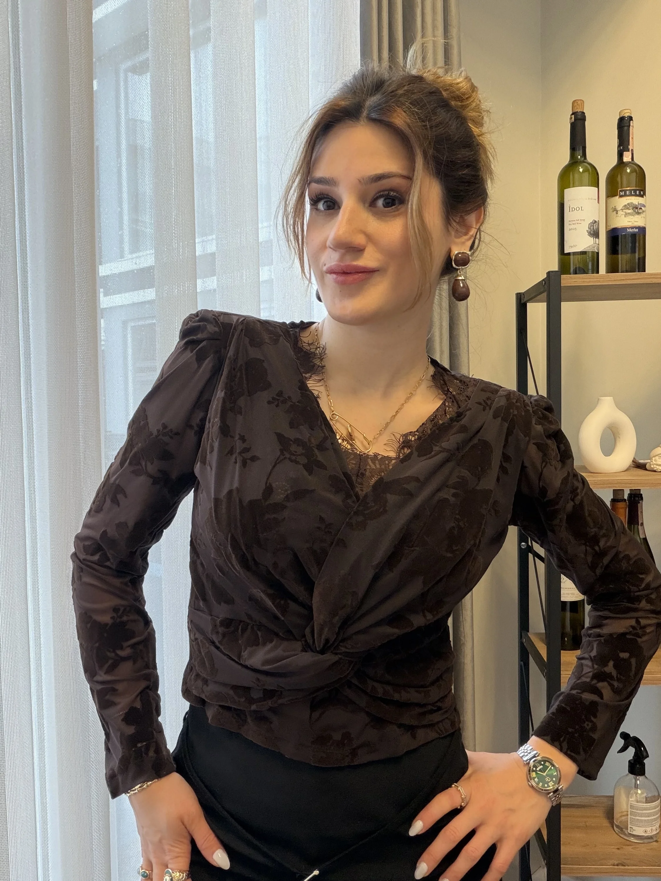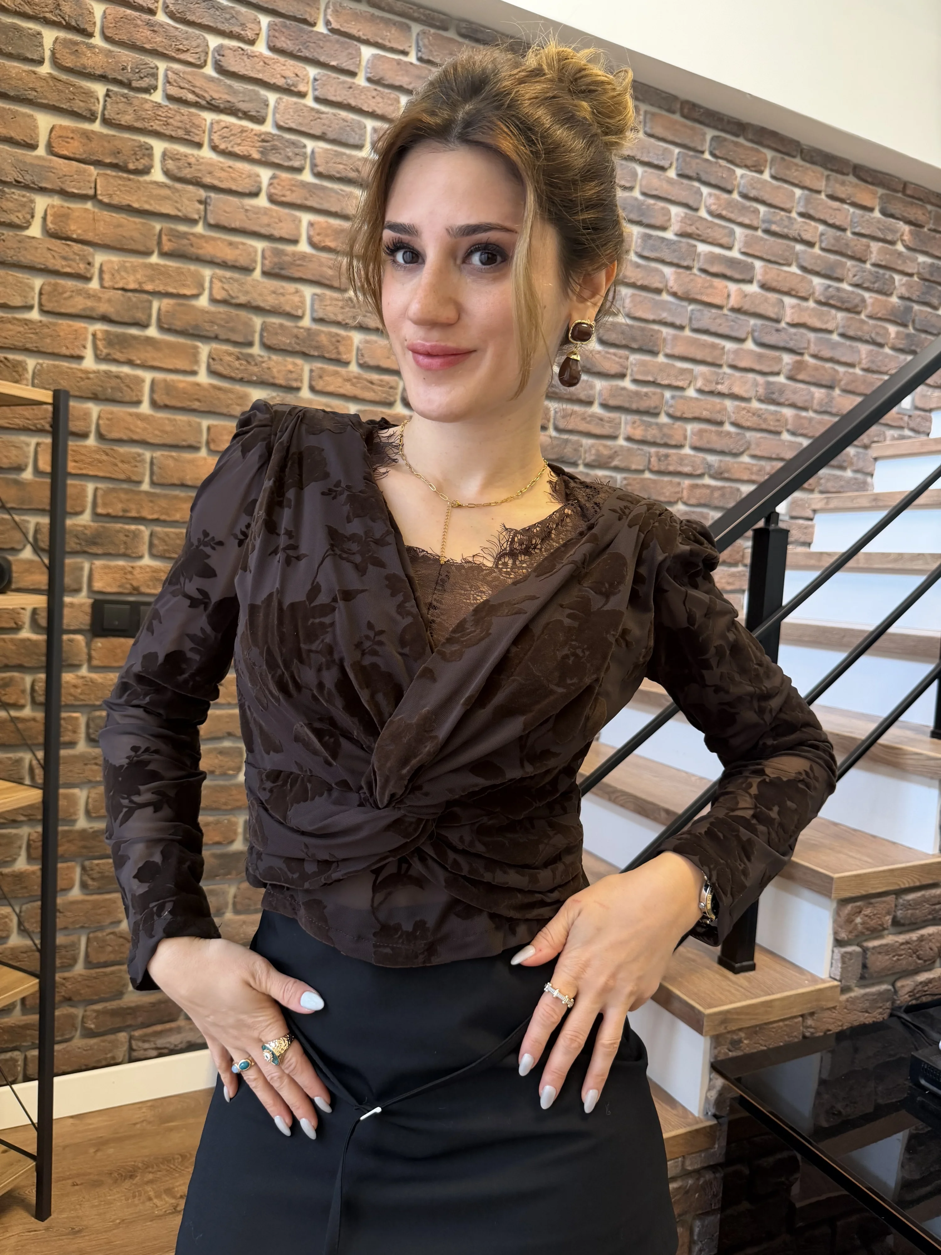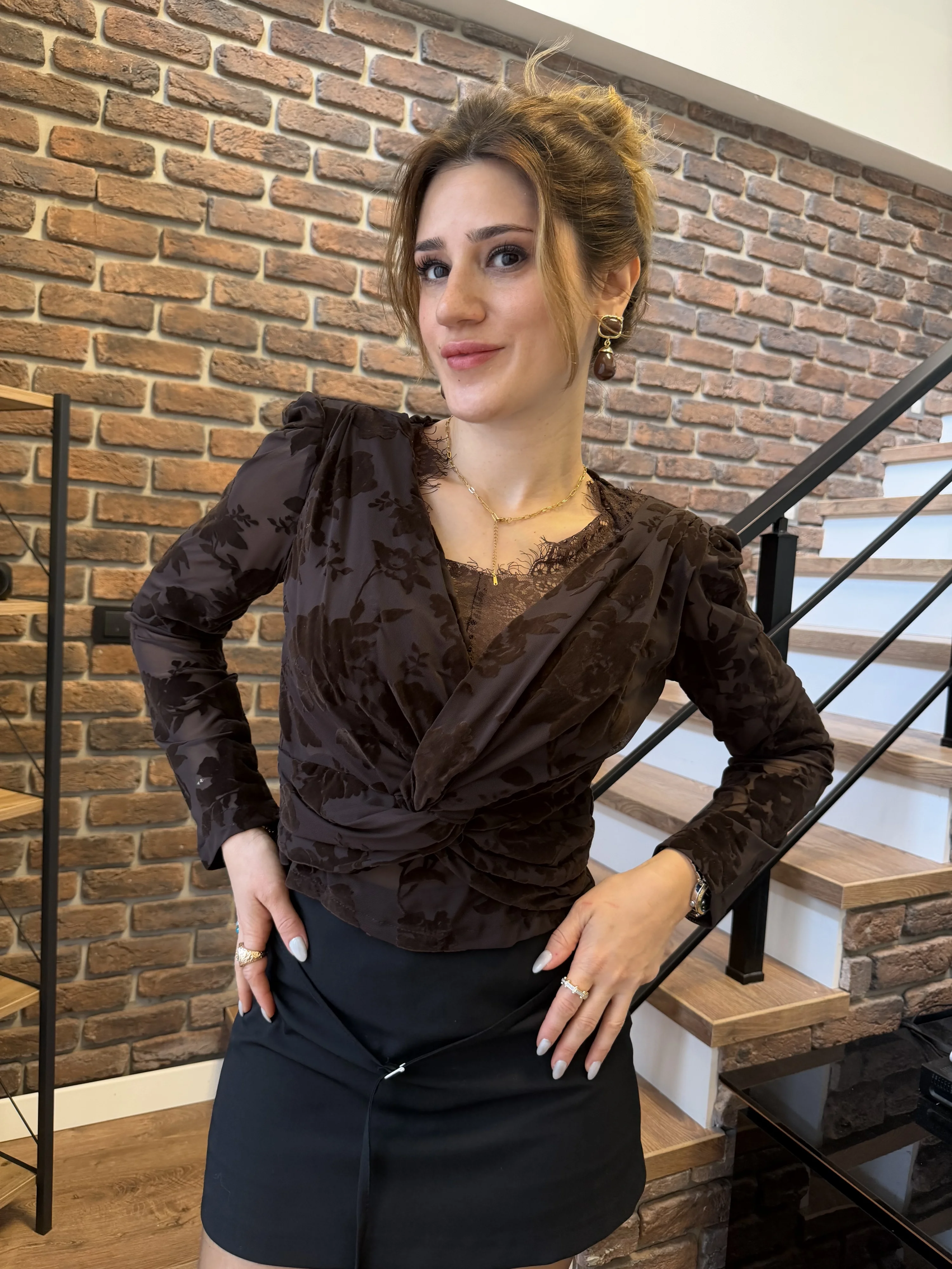 Kruvaze Yaka Kadife Desenli Bluz – Kahverengi