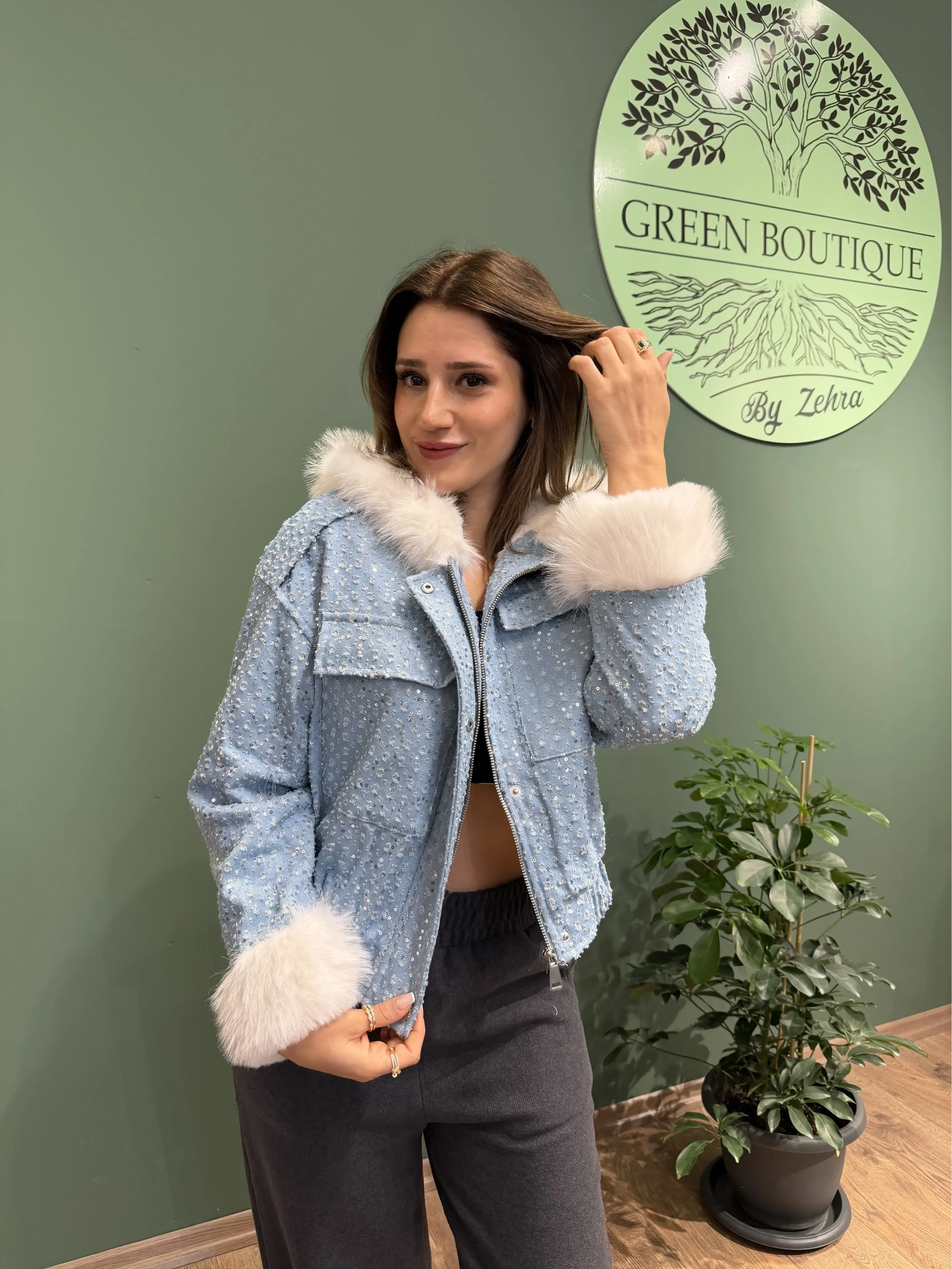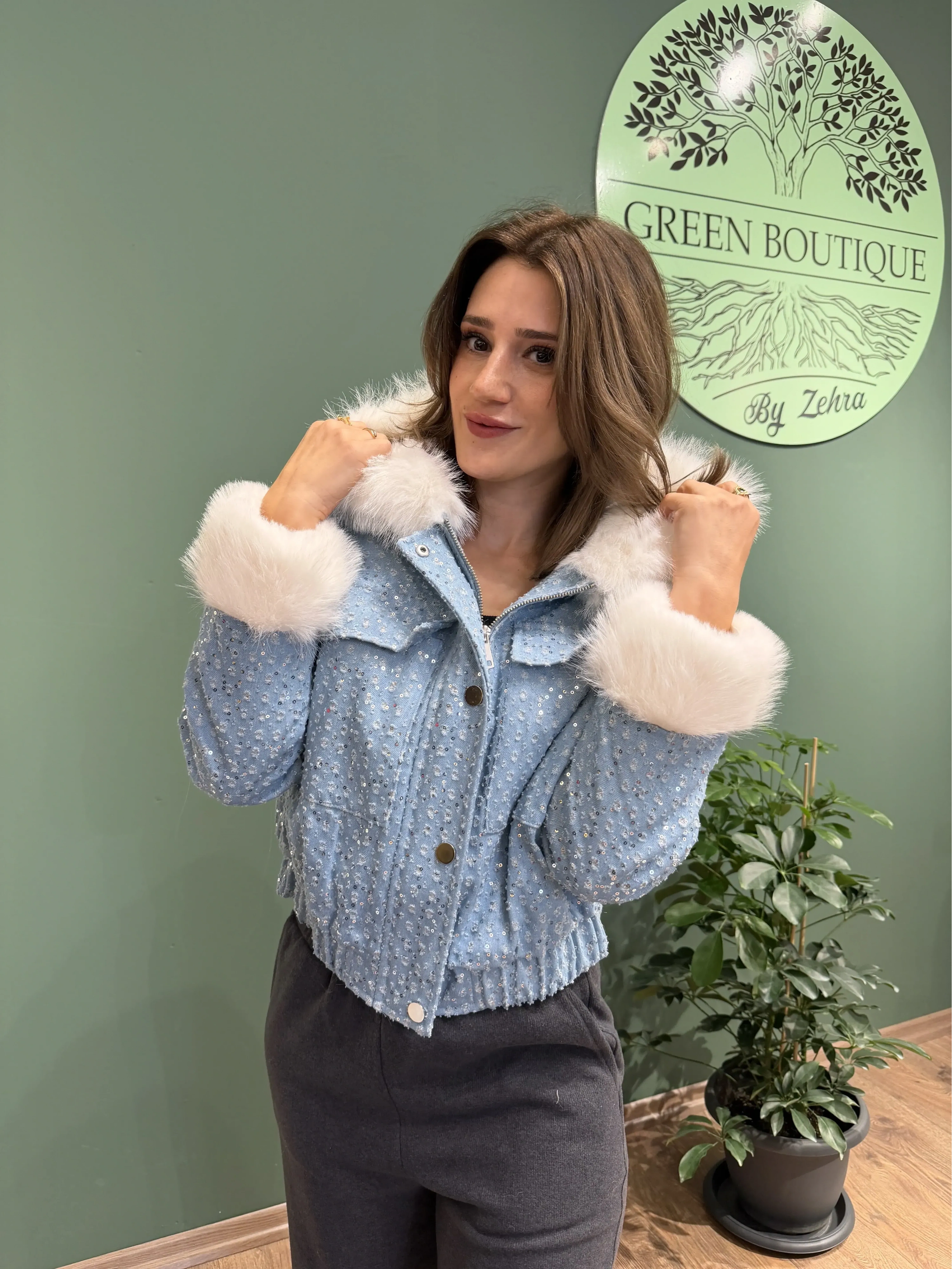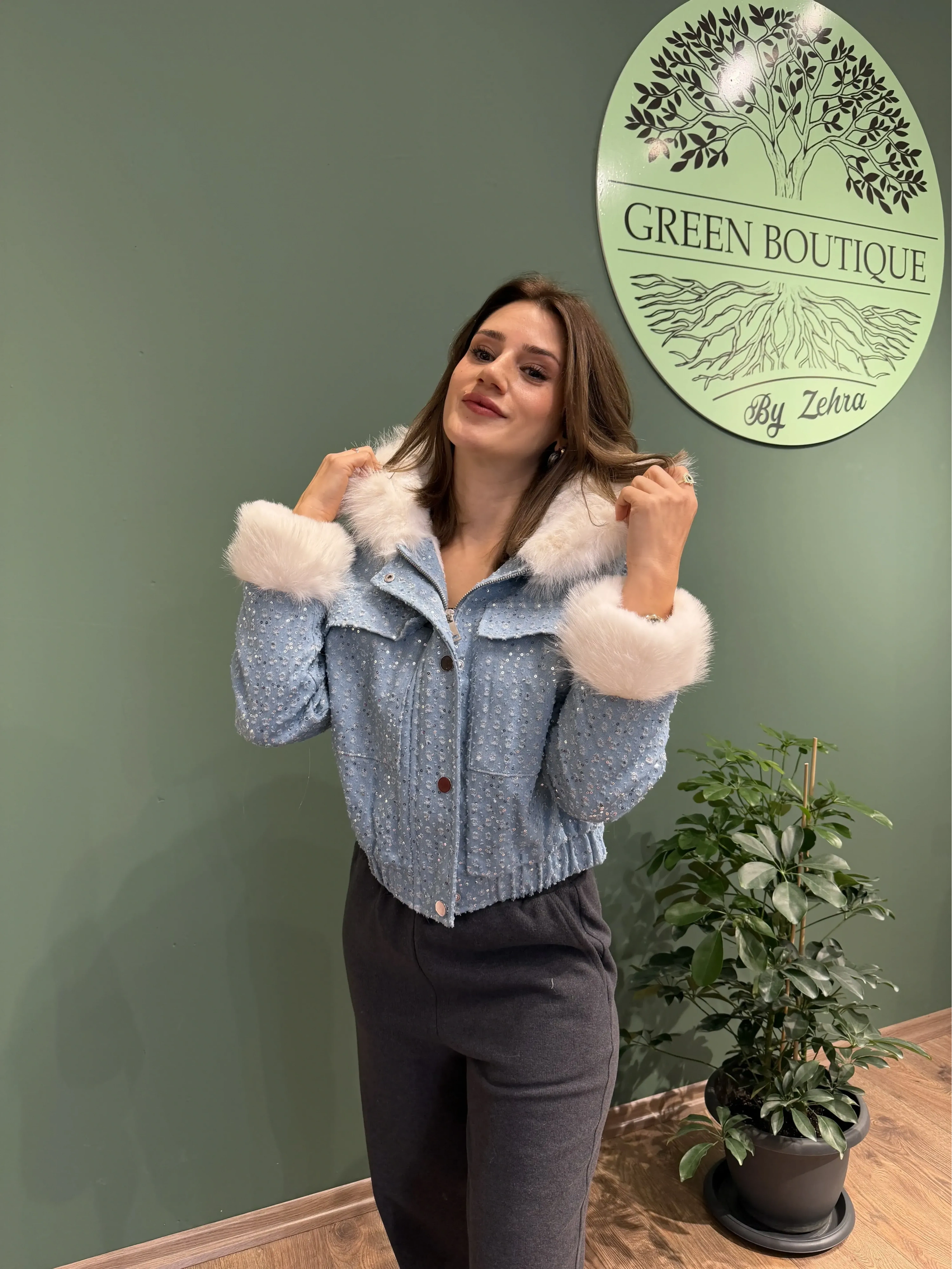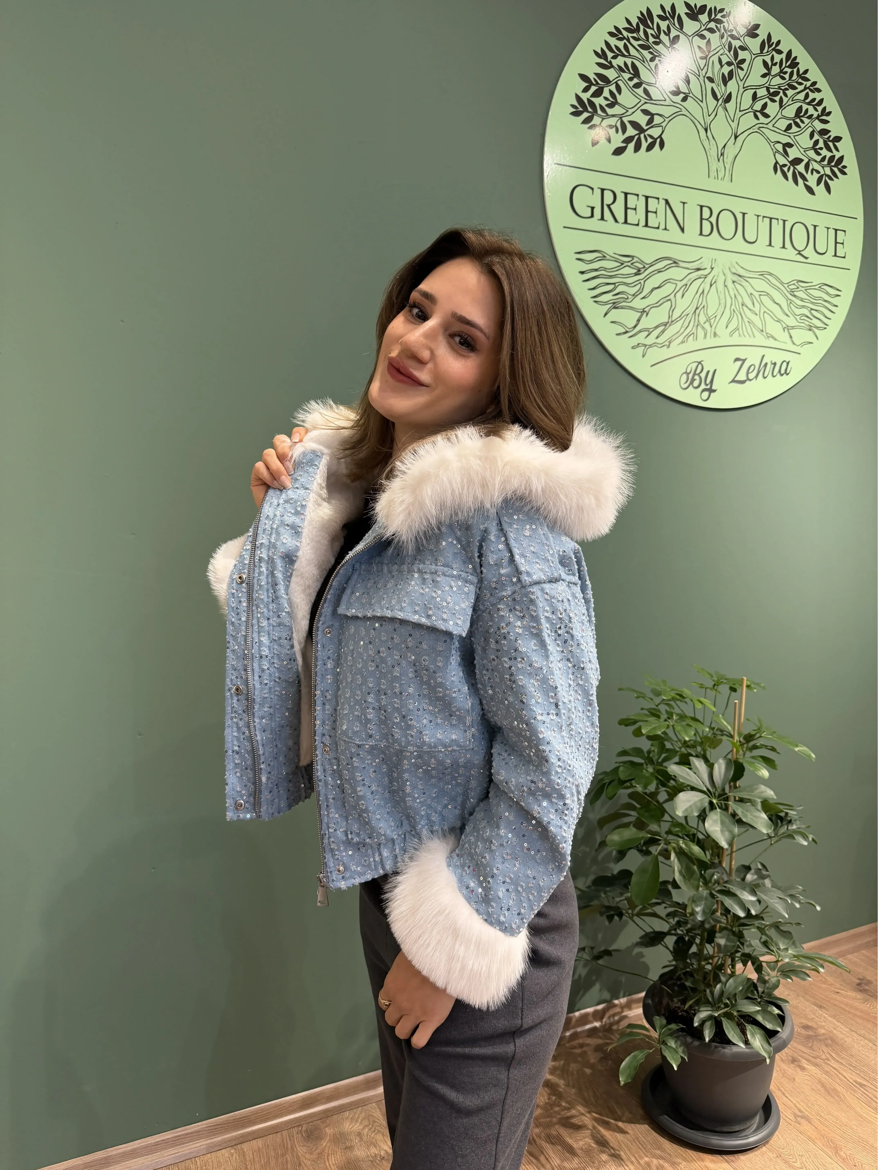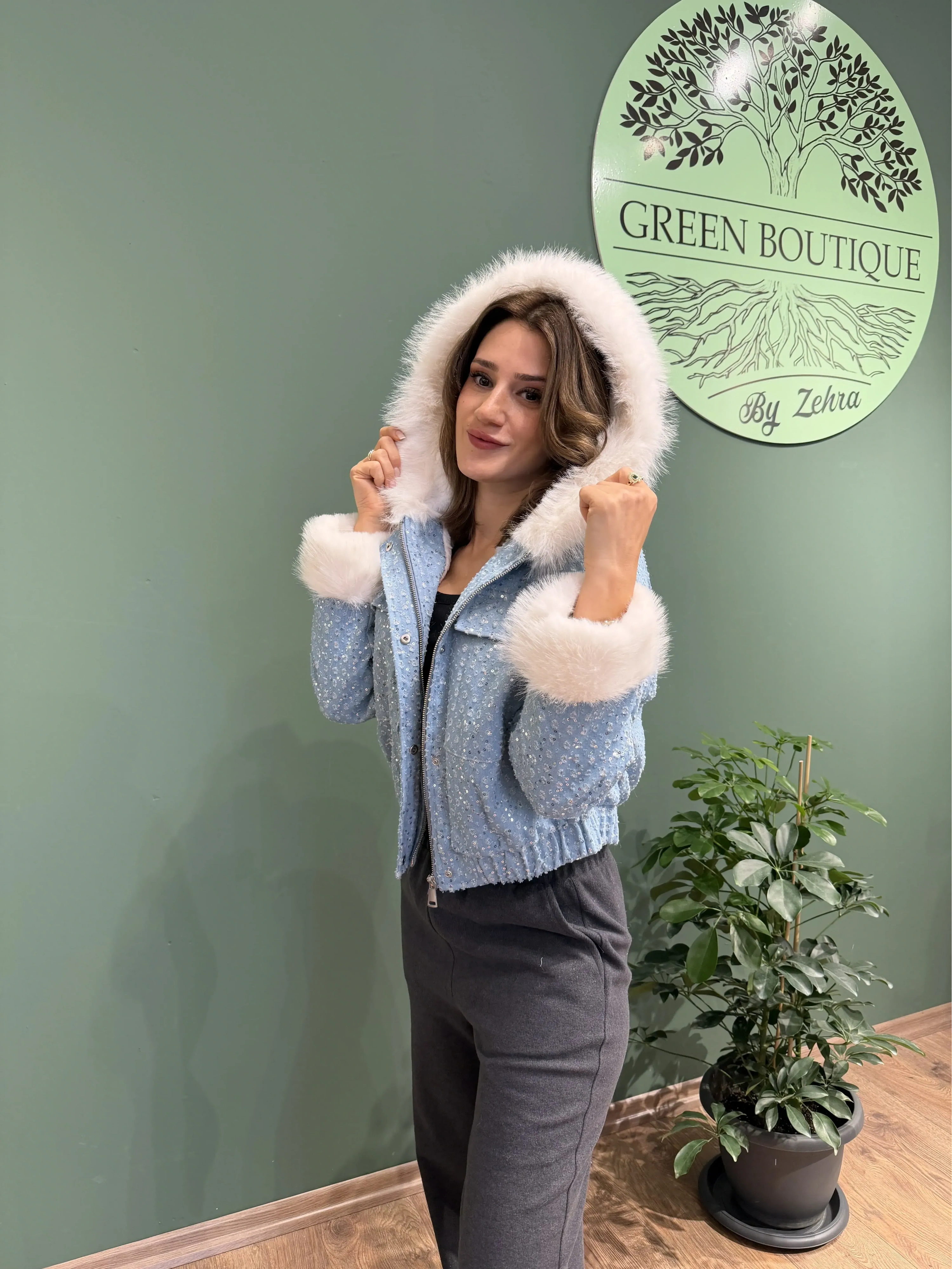 Kürk Kapşonlu İçi Tay Tüyü Pullu Ceket – Mavi, soğuk havalarda hem şıklığı hem de sıcaklığı bir arada sunan özel tasarımıyla dikkat çeker. Yumuşacık tay tüyü iç astarı, gün boyu konforlu bir kullanım sağlarken, dış kısmındaki ışıltılı pul detayları modern ve göz alıcı bir tarz oluşturur.