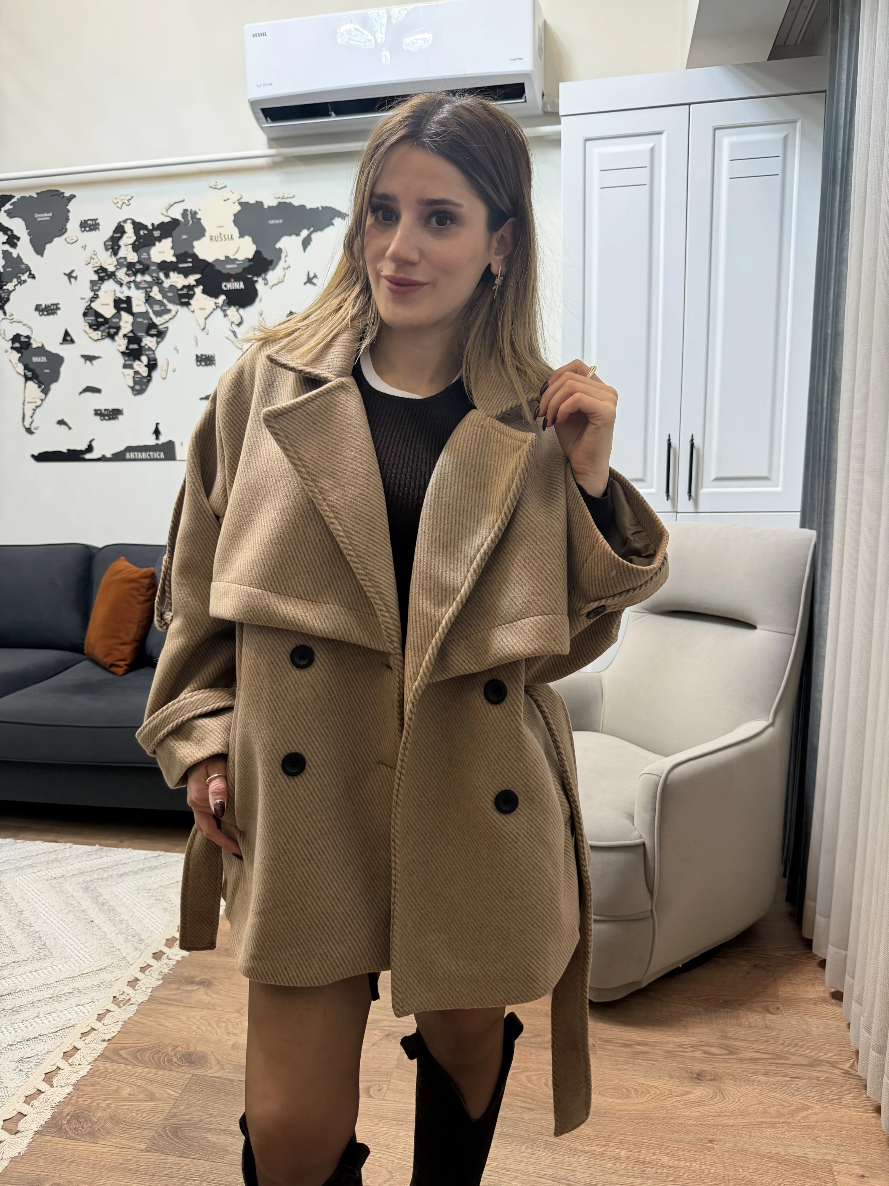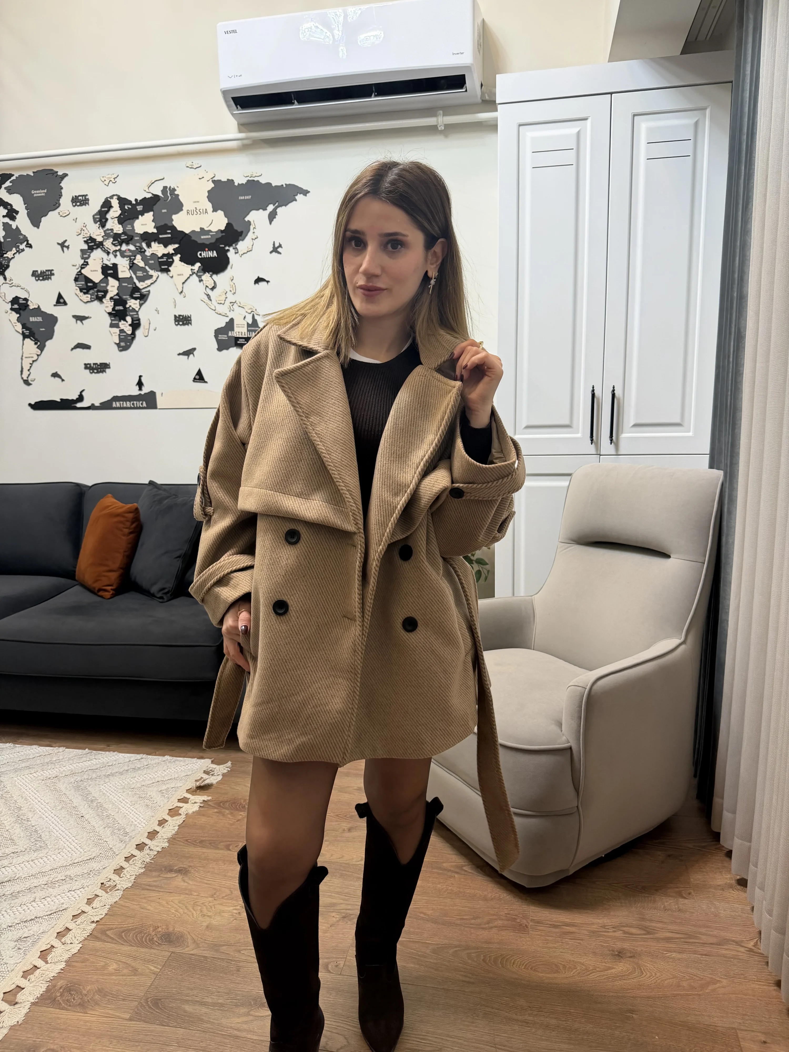 Bu kahverengi kaşe kaban, gündelik jean’lerle rahat bir hafta sonu stilinden, ofiste şık bir kombine kadar geniş bir kullanım yelpazesi sunar. Bot ve triko kazaklarla tamamlandığında sonbahar-kış sezonunun vazgeçilmezi olur.