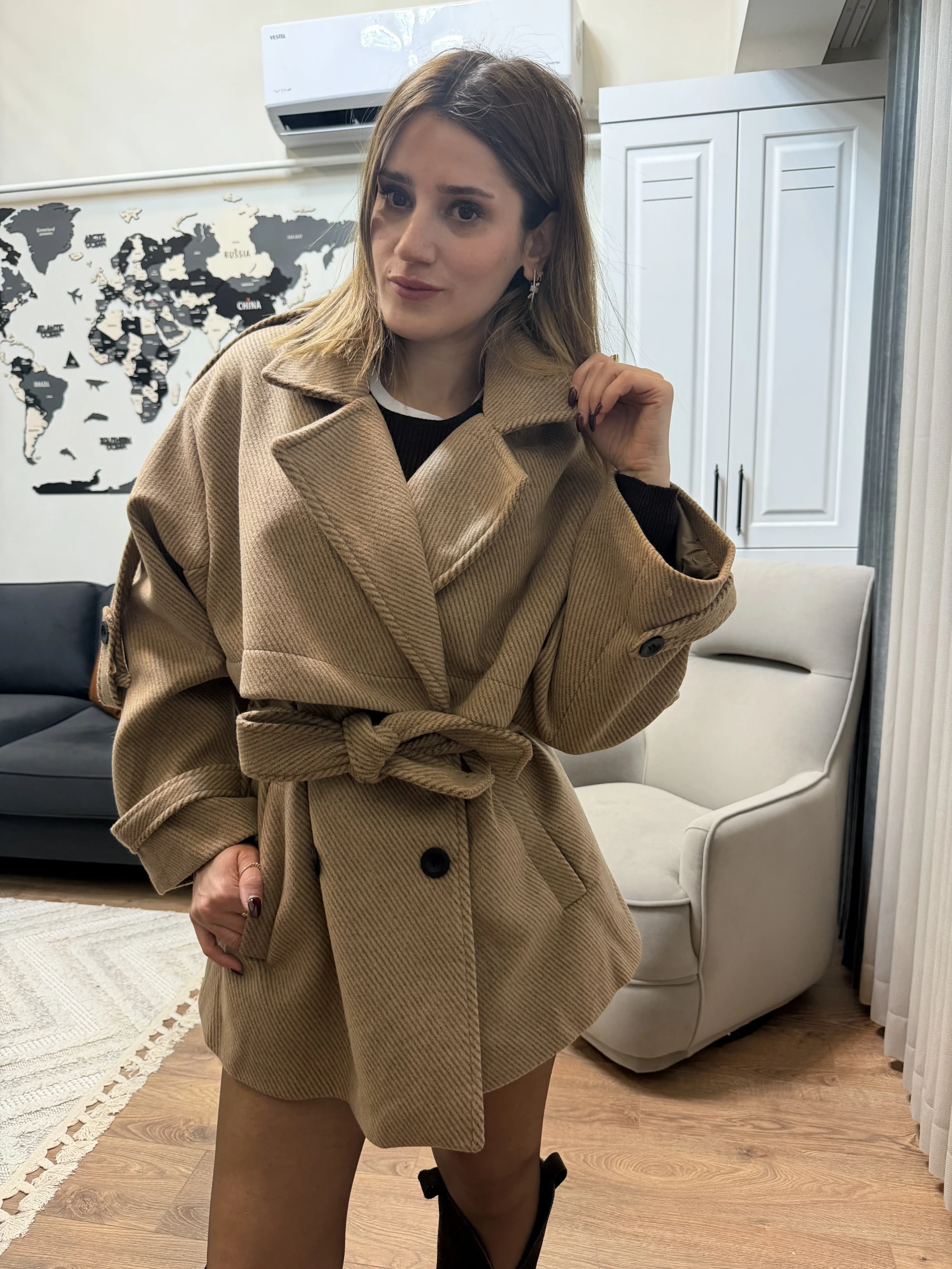 Ön kısmı düğmeli veya kuşaklı kapamalı tasarımıyla hem modern hem klasik bir duruş yakalar.