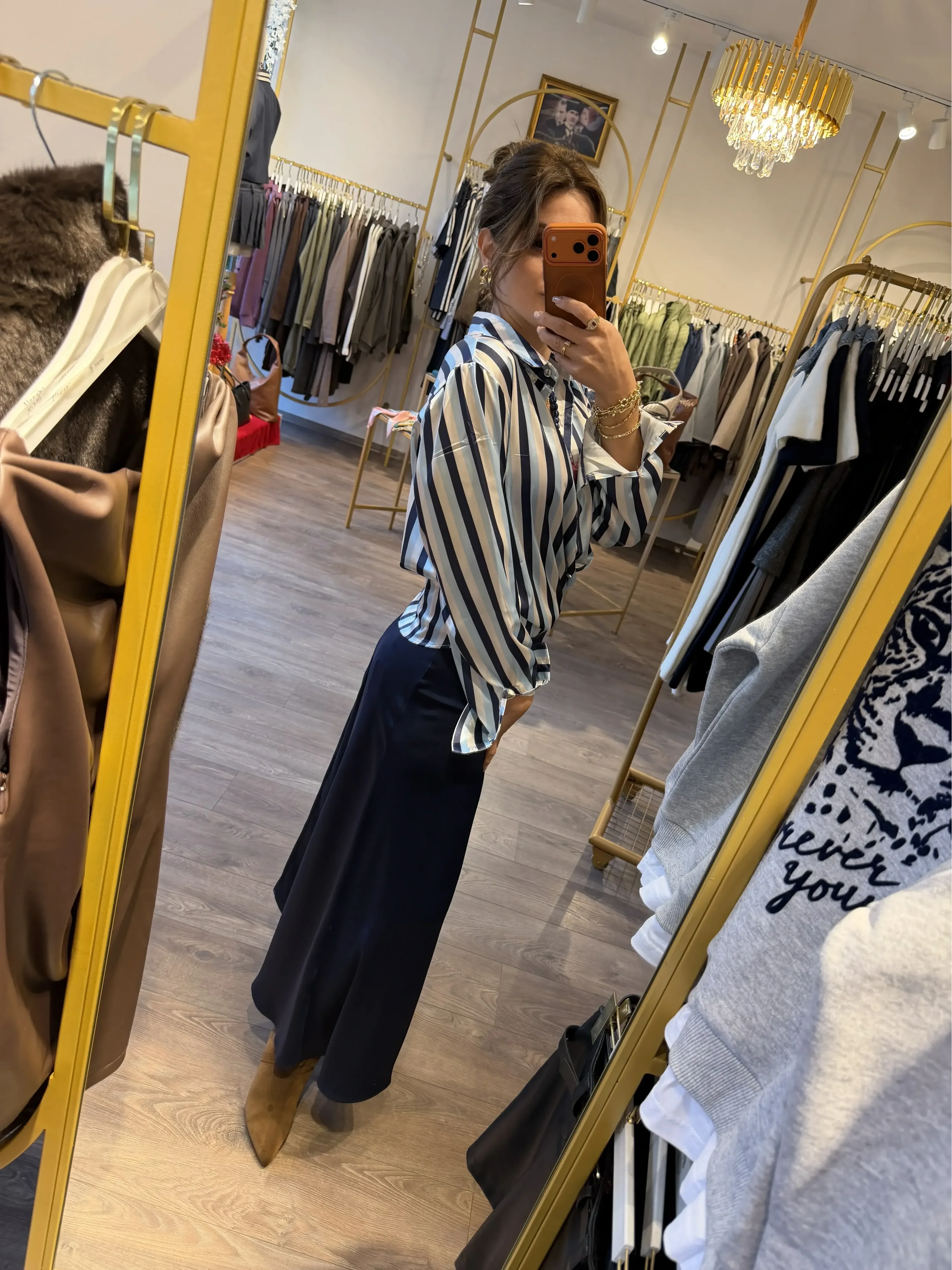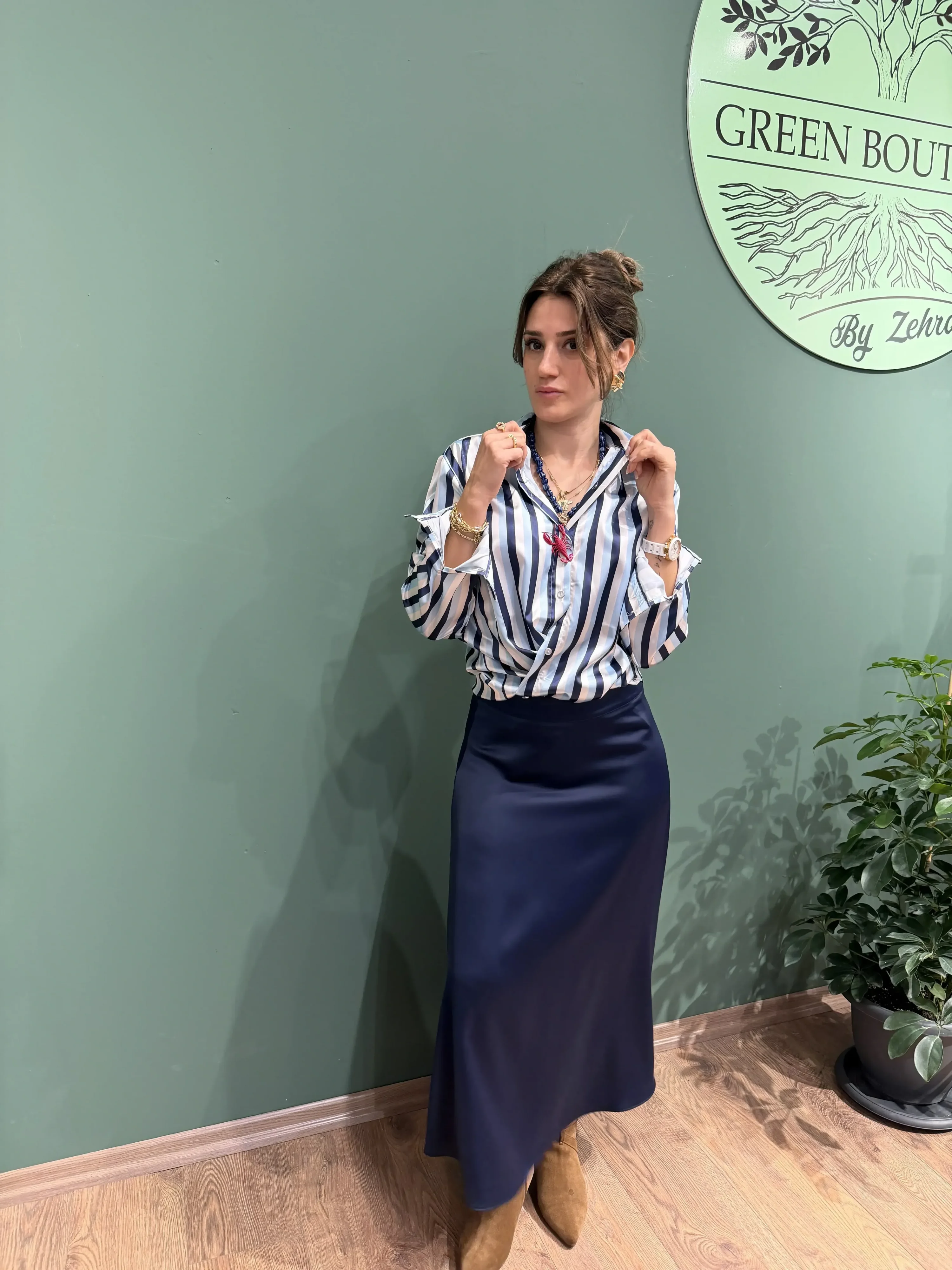 Zarafetin en modern haliyle buluştuğu midi boy saten lacivert etek, akıcı dokusu ve hafif parlak yüzeyiyle hem günlük şıklıkta hem de özel davetlerde stilinizi yükseltir. Lacivert rengin asil ve zamansız duruşu, saten kumaşın lüks hissiyle birleşerek feminen, akıcı ve sofistike bir görünüm oluşturur. Yumuşak dokusu sayesinde gün boyu konfor sunan bu etek, dolabınızın en kullanışlı ve etkileyici parçalarından biri olmaya adaydır.