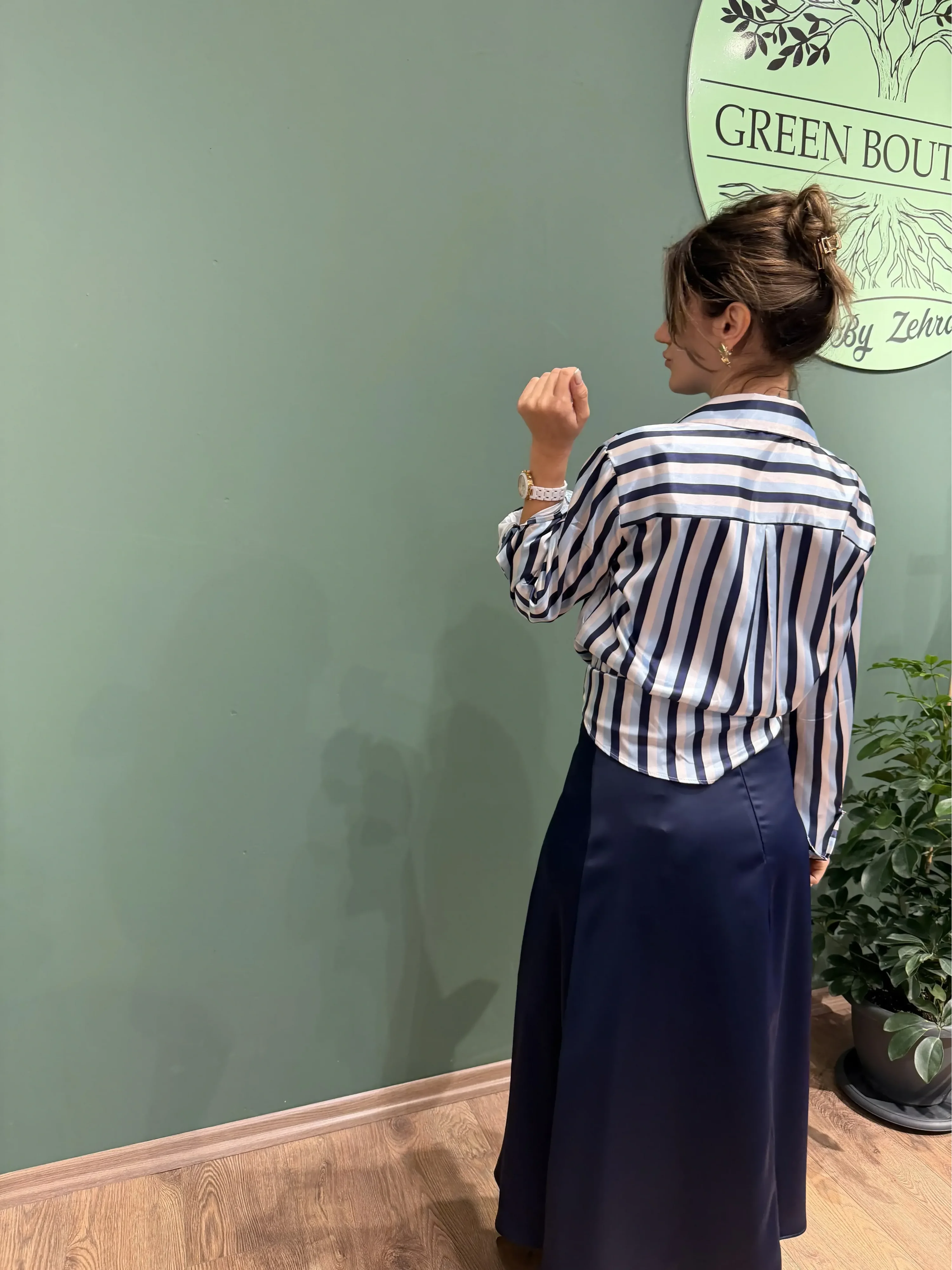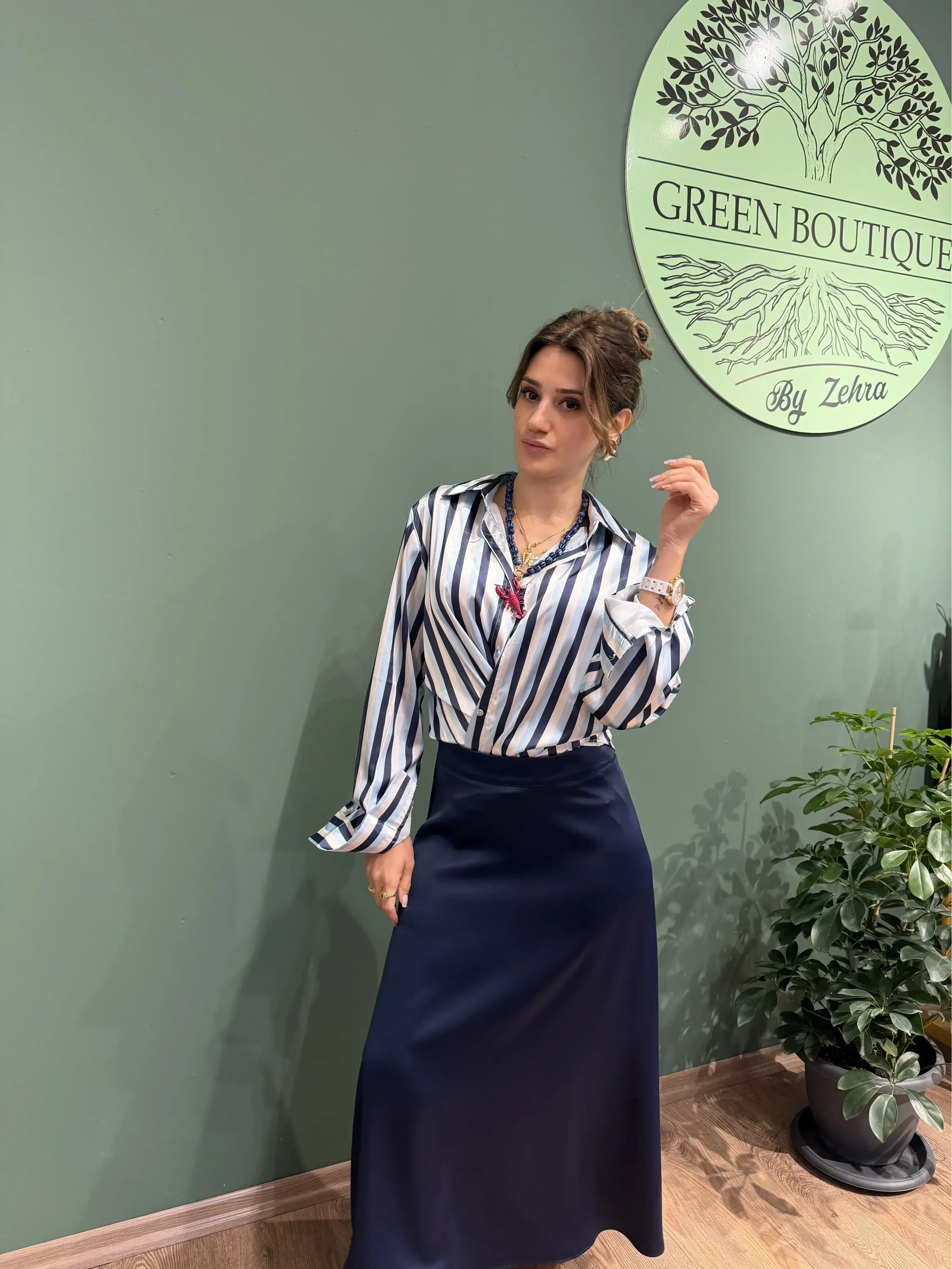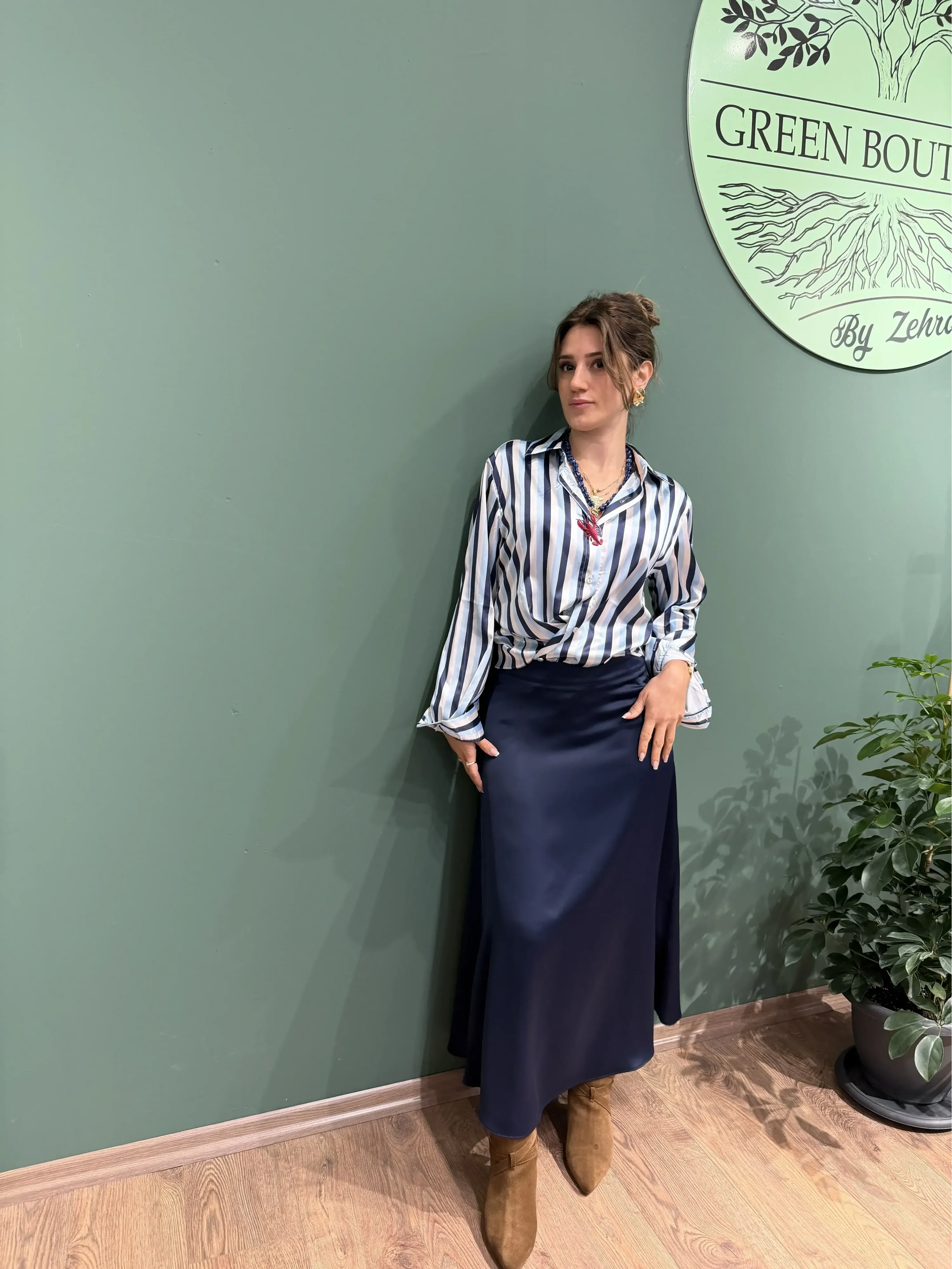 Midi Boy Saten Etek – Lacivert | Zarif Parlaklık ve Modern Şıklık