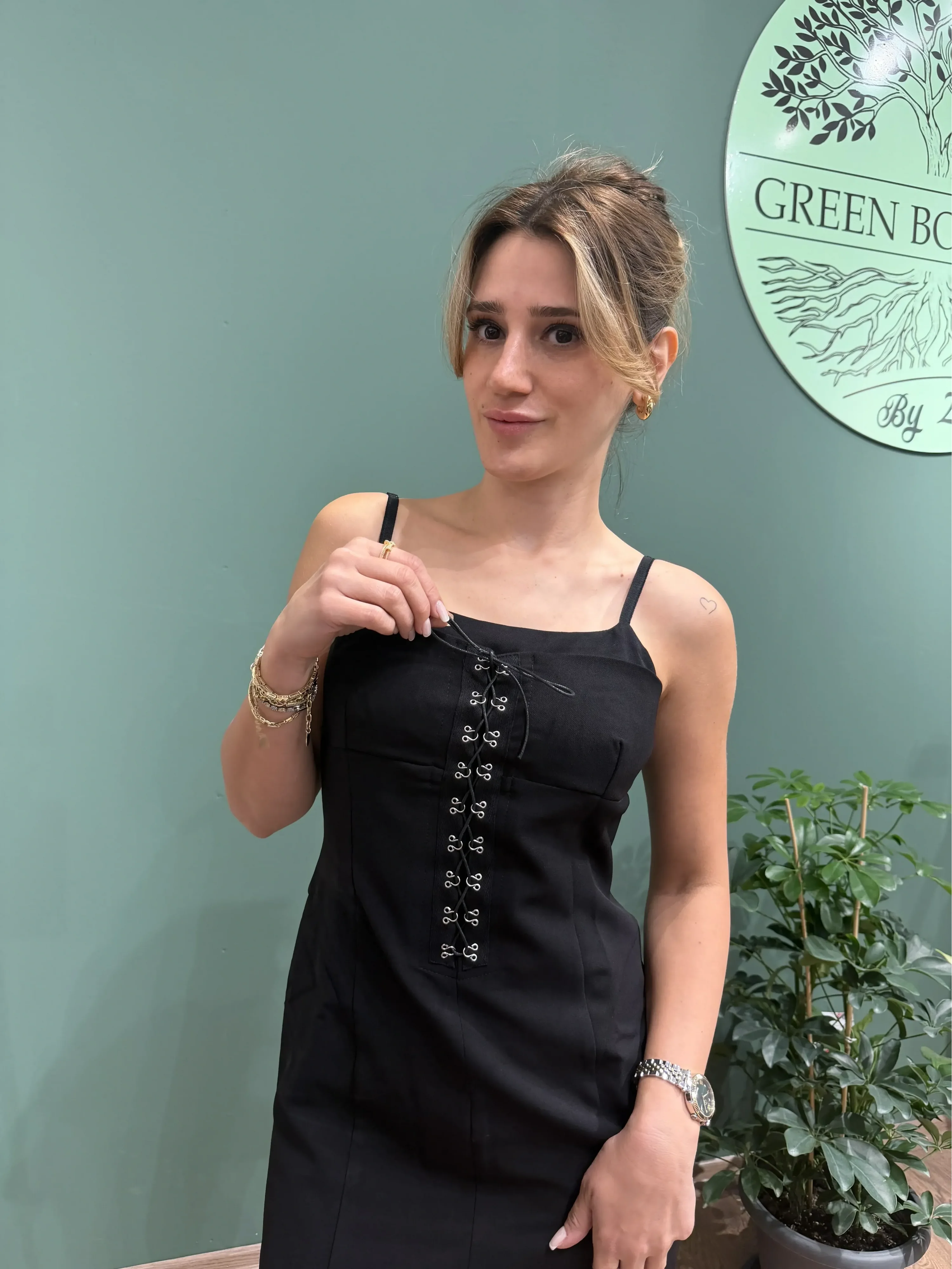 Minimalist çizgilere sahip olmasına rağmen bağcık detayıyla karakter kazanan bu elbise, gardırobunuzun en kurtarıcı parçalarından biri olacak. Günlük gezilerde rahatlık arayanlar, akşam dışarı çıkarken göz kamaştırmak isteyenler için ideal bir seçim.