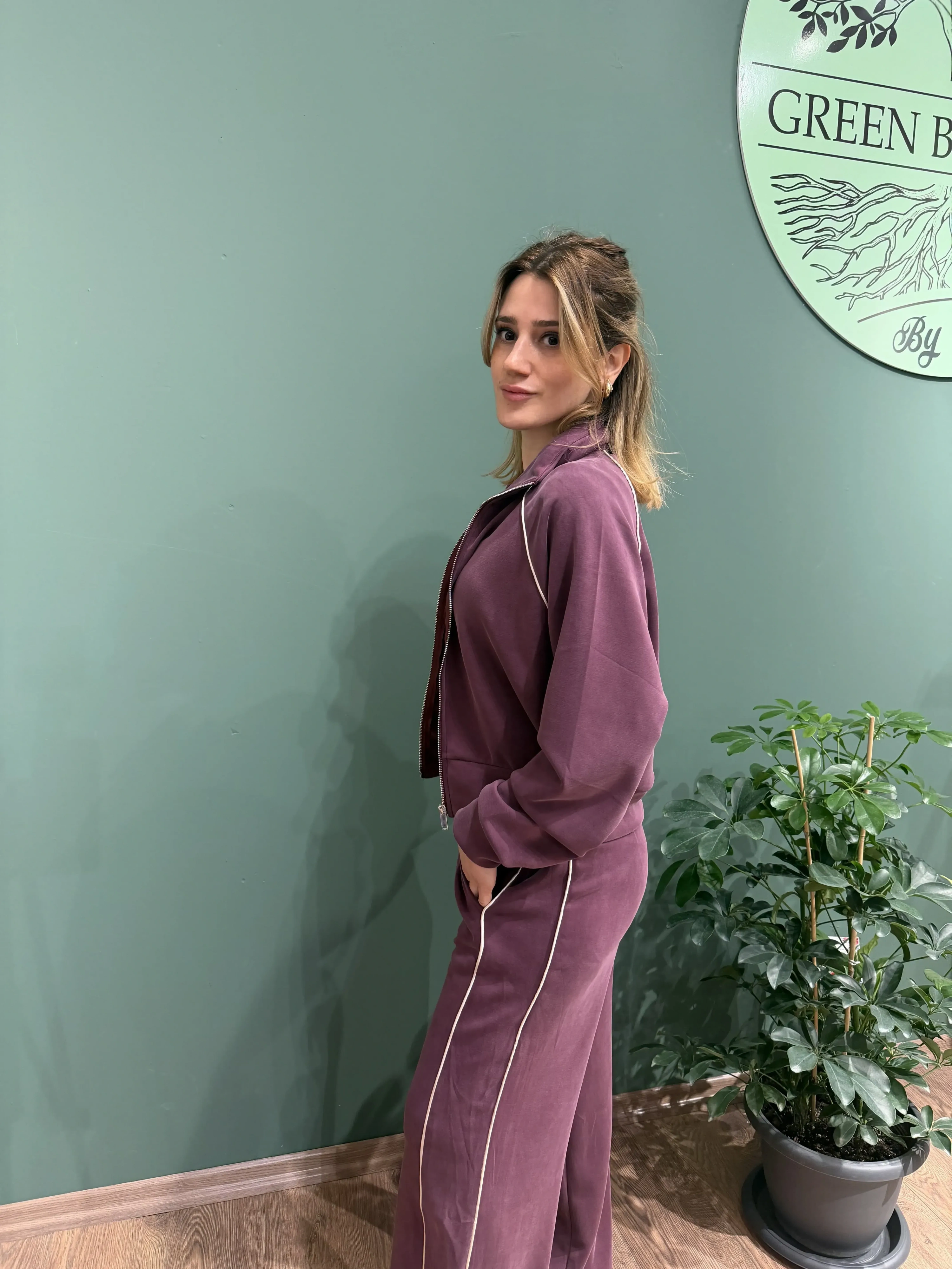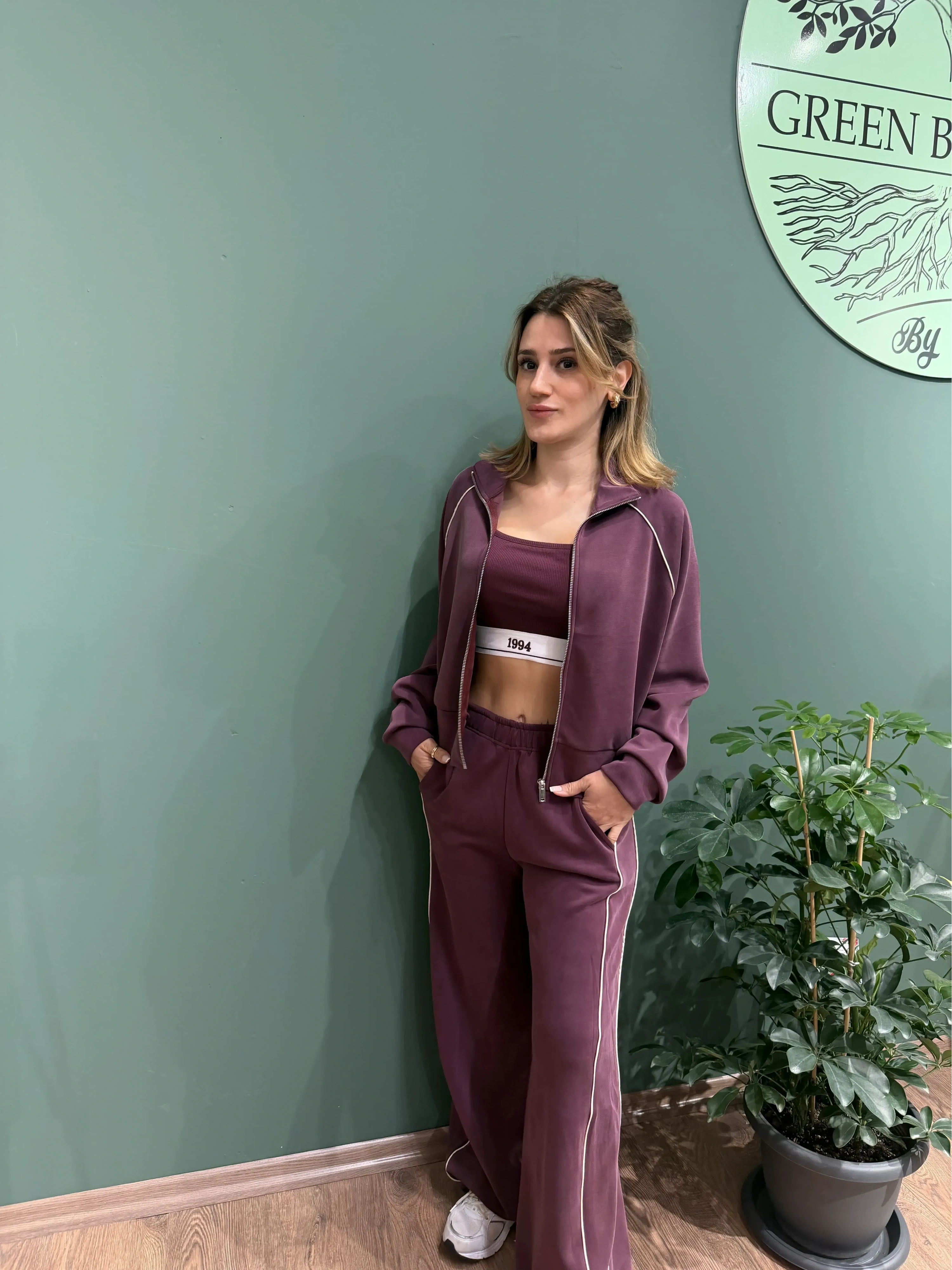 Bordo modal eşofman takımını spor ayakkabılar, oversize hırkalar veya minimal aksesuarlarla tamamlayarak hem sportif hem de modern bir görünüm elde edebilirsiniz.