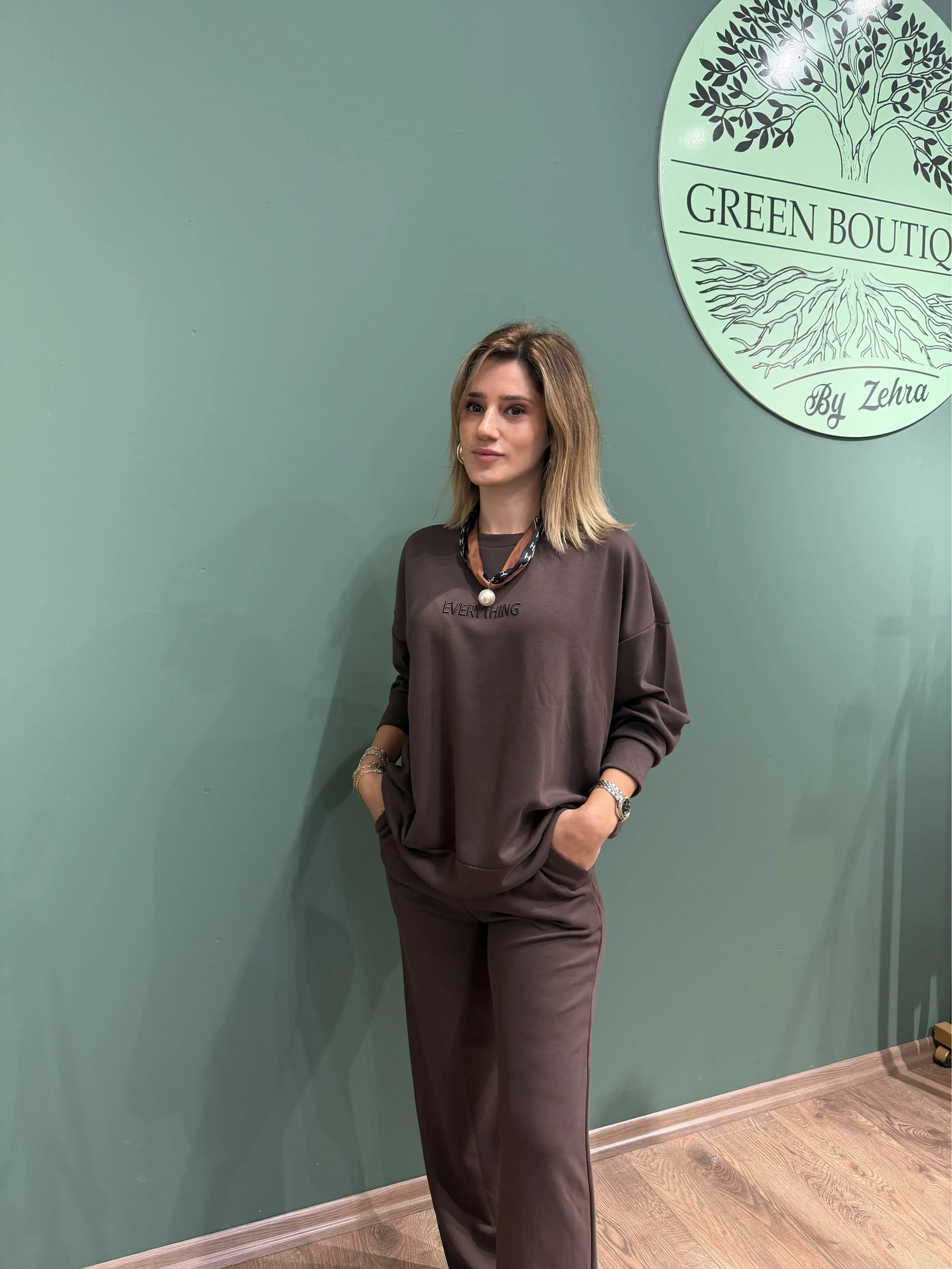 Modal Kumaş Fularlı Açık Kahve Yazı Detaylı Eşofman Takım – Şıklığı ve Konforu Bir Arada Yaşayın