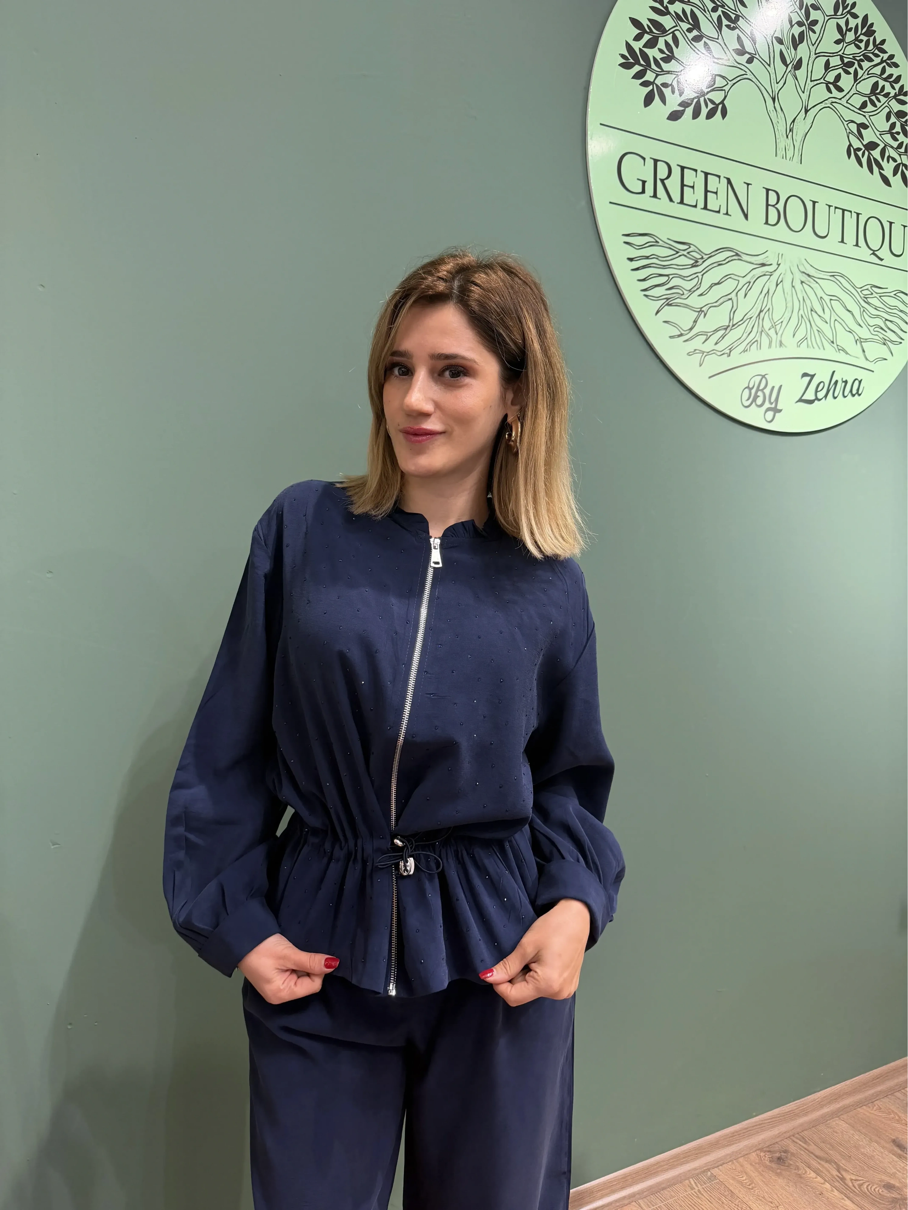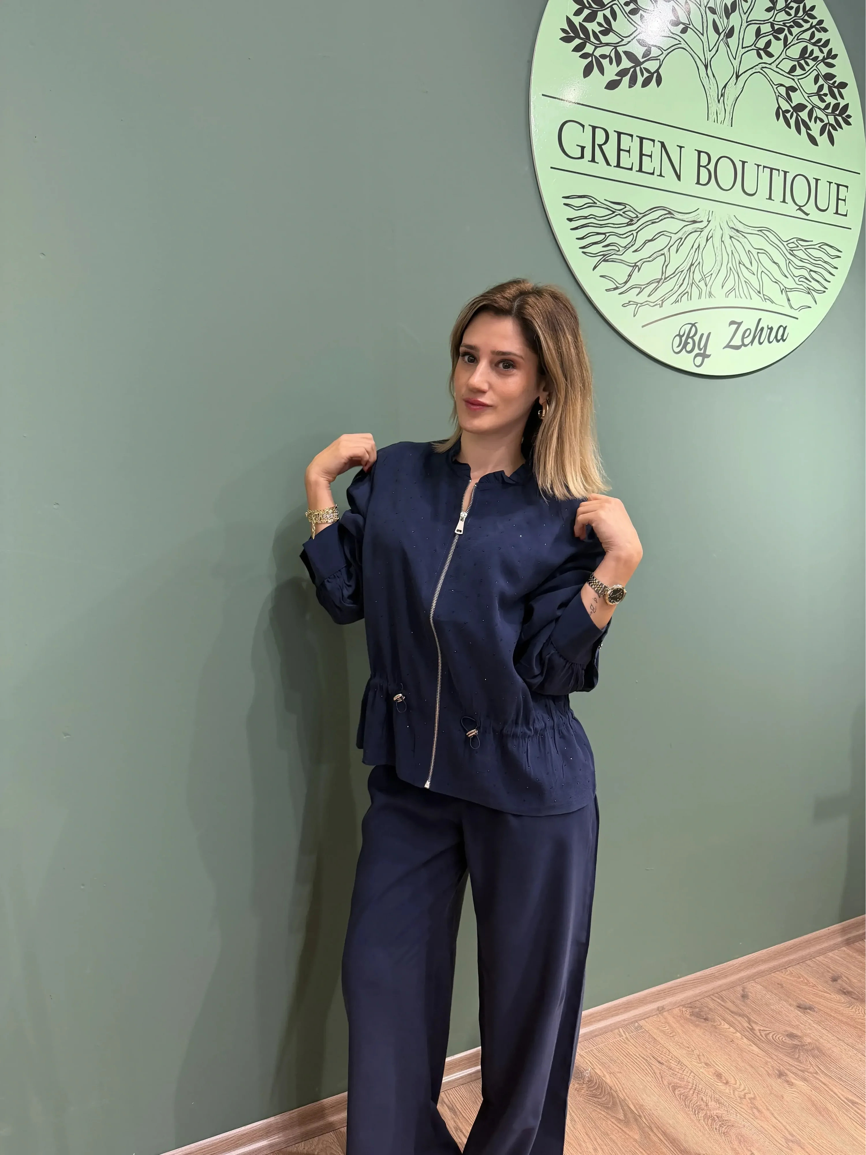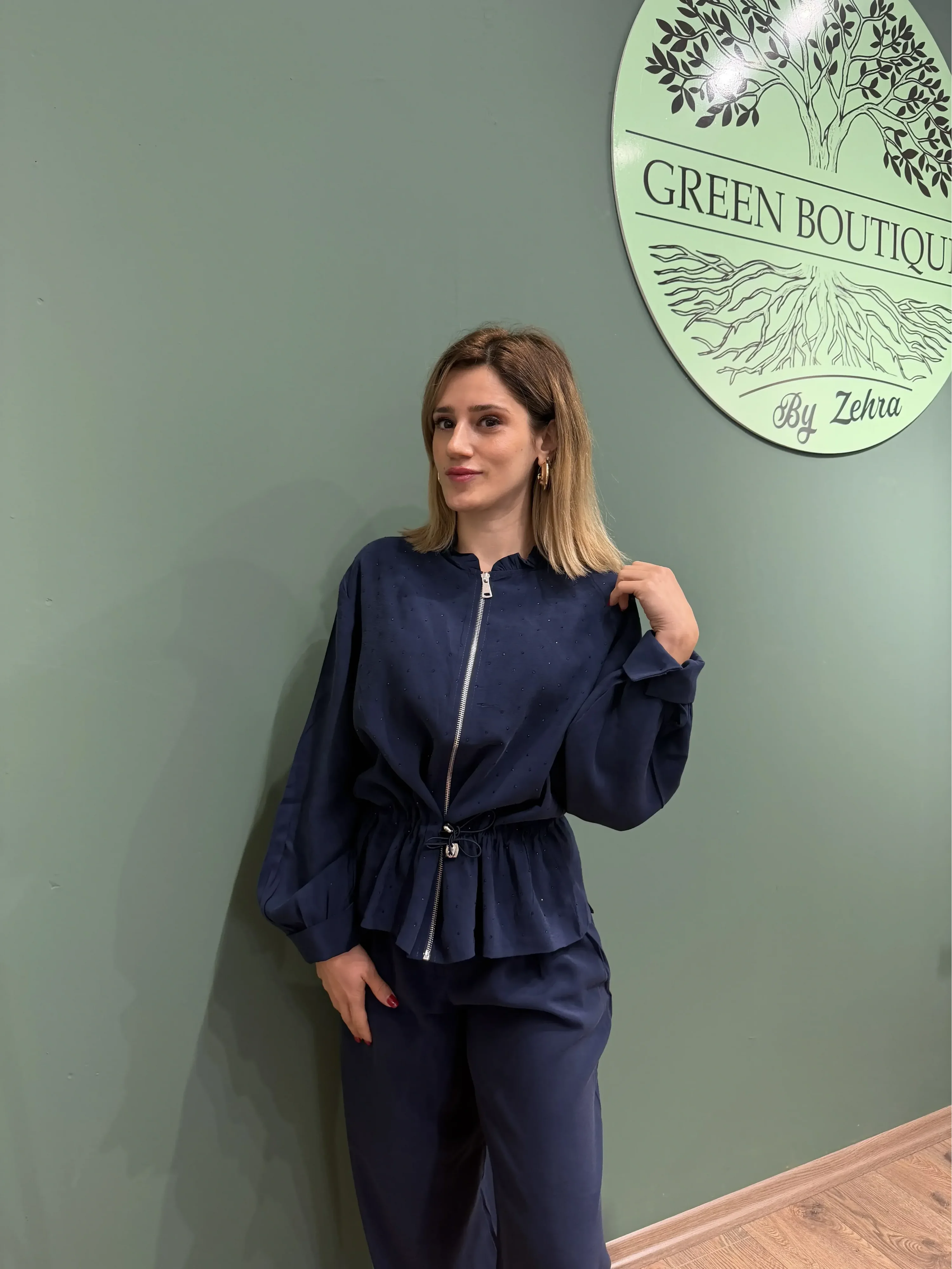 Ürün Adı: Önden Fermuarlı Pullu Belden Bağlamalı Lacivert Takım