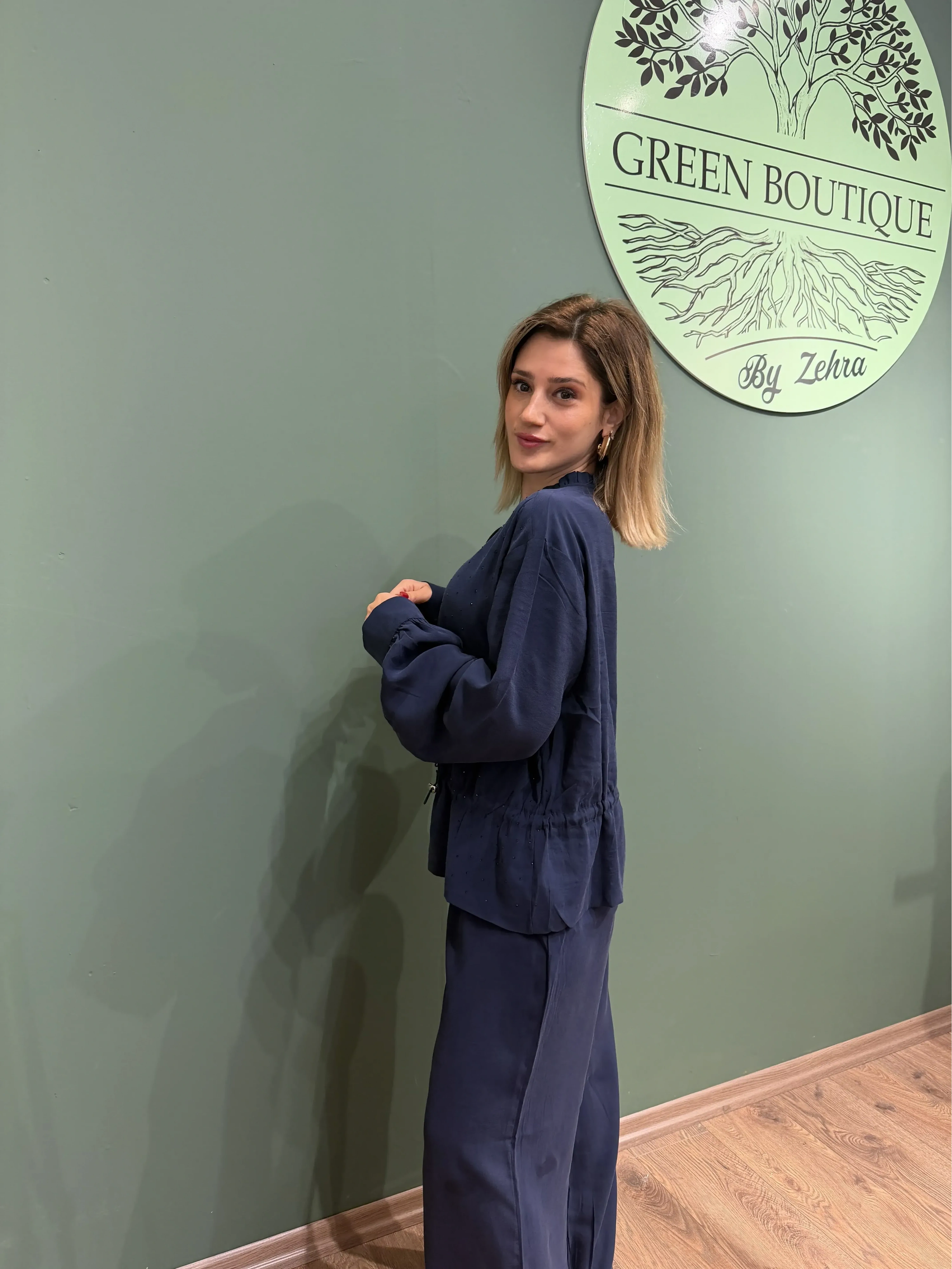 Şıklığı ve konforu bir arada sunan önden fermuarlı, pul detaylı belden bağlamalı lacivert takım, modern ve zarif tasarımıyla dikkat çeker. Hem özel günlerde hem de günlük kullanımda rahatlıkla tercih edilebilir.