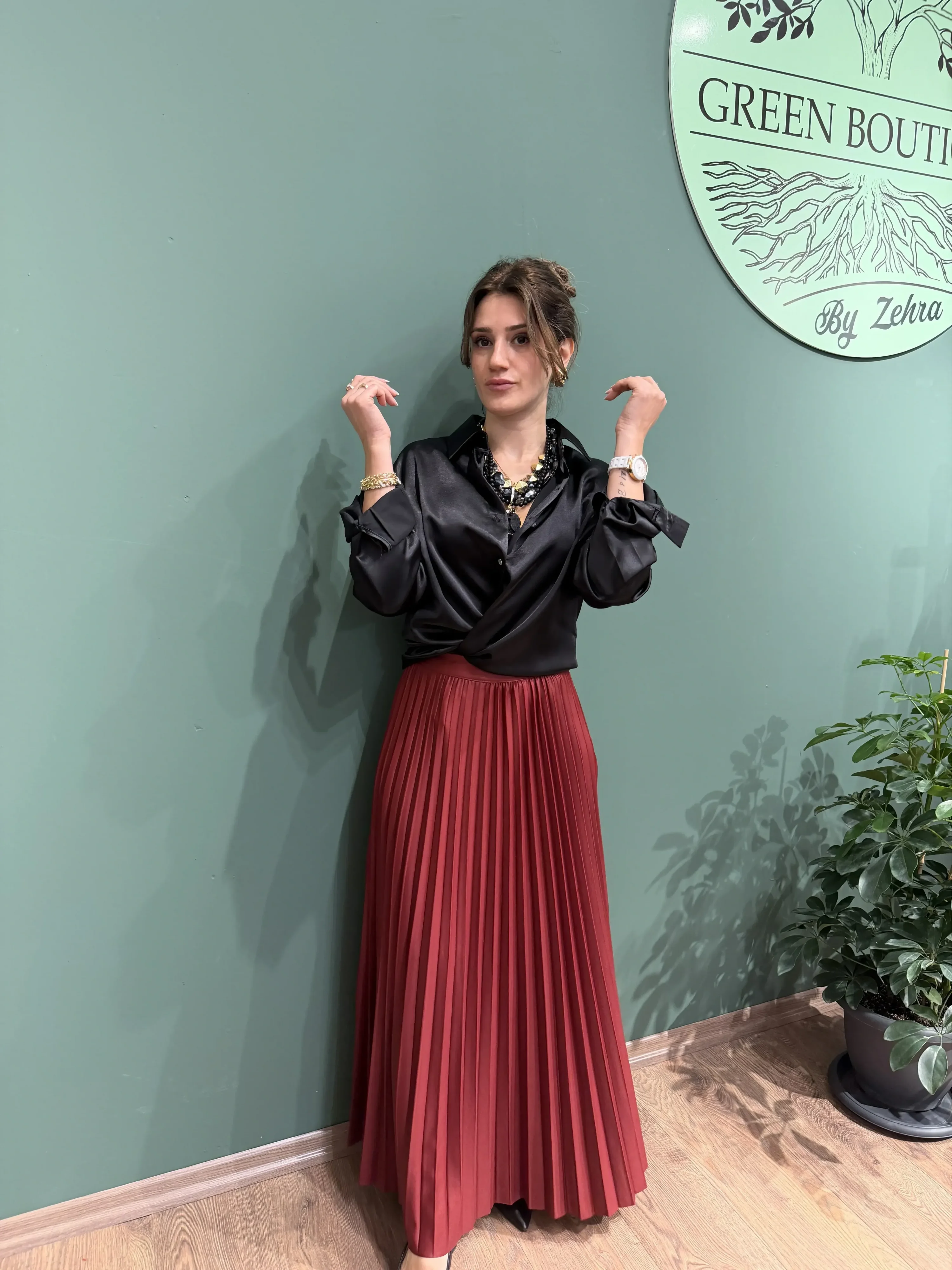 Şıklığı güçlü bir renkle buluşturan pileli uzun parlak bordo etek, ışıltılı yüzeyi ve akıcı pile detaylarıyla hem modern hem de feminen bir görünüm sunar. Bordo rengin asil tonuyla birleşen parlak dokusu, hareket ettikçe ışığı yansıtarak dikkat çekici bir siluet oluşturur. Günlük kombinlerden özel davetlere kadar geniş bir kullanım alanı sunan bu etek, stilinizi zahmetsizce bir üst seviyeye taşır.
