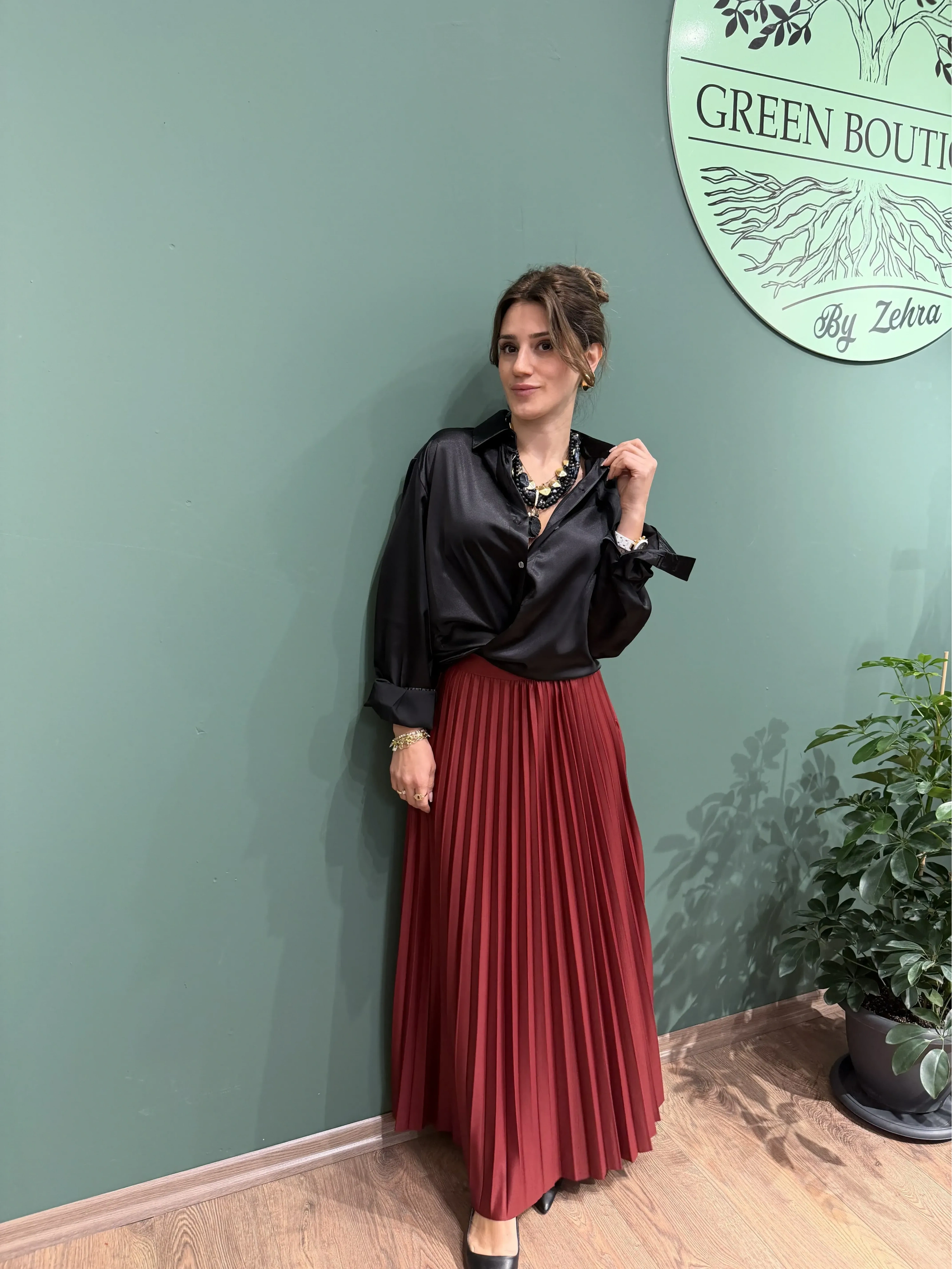 Pileli Uzun Parlak Etek – Bordo | Zarif Işıltı ve Feminen Duruş
