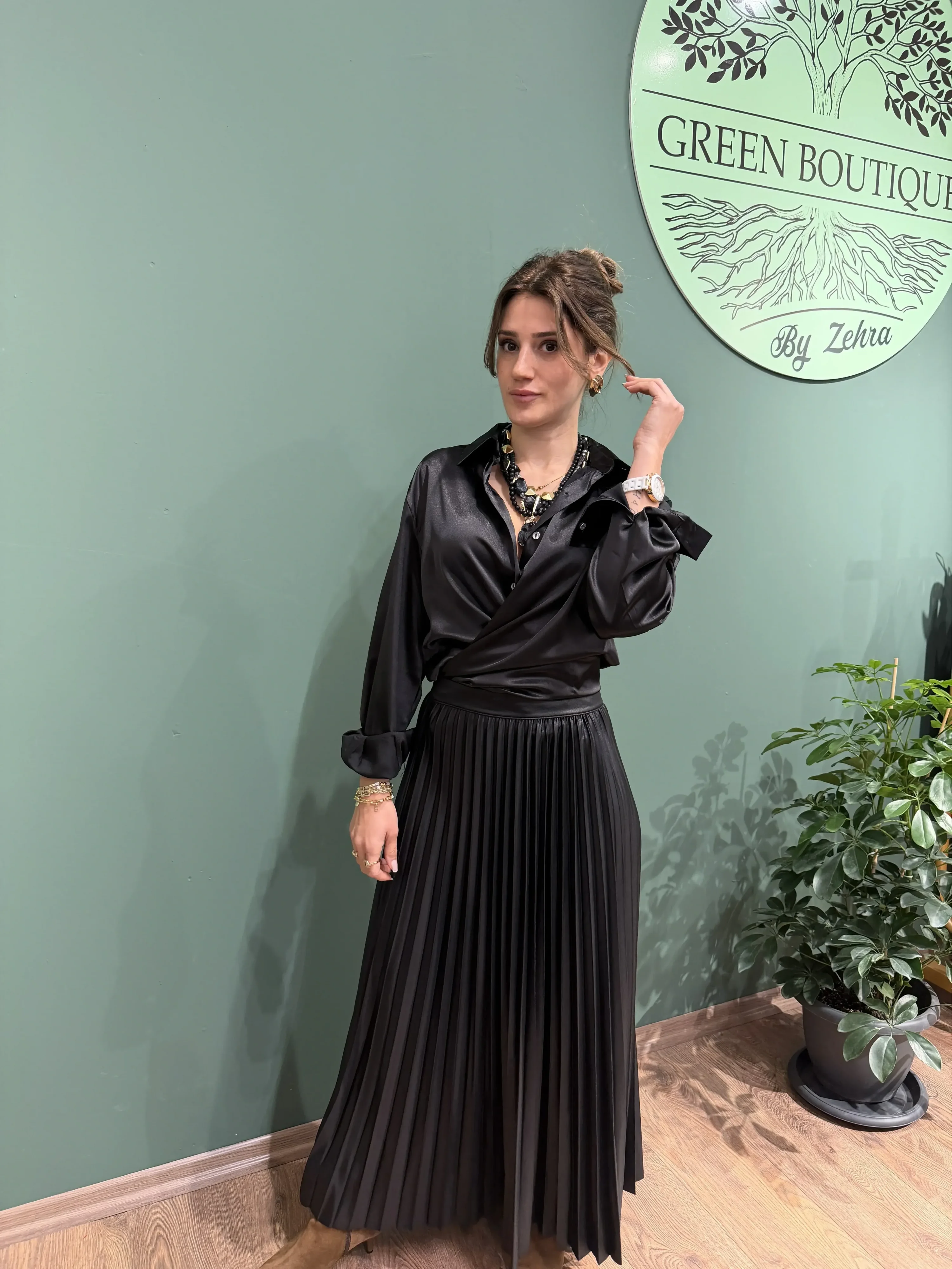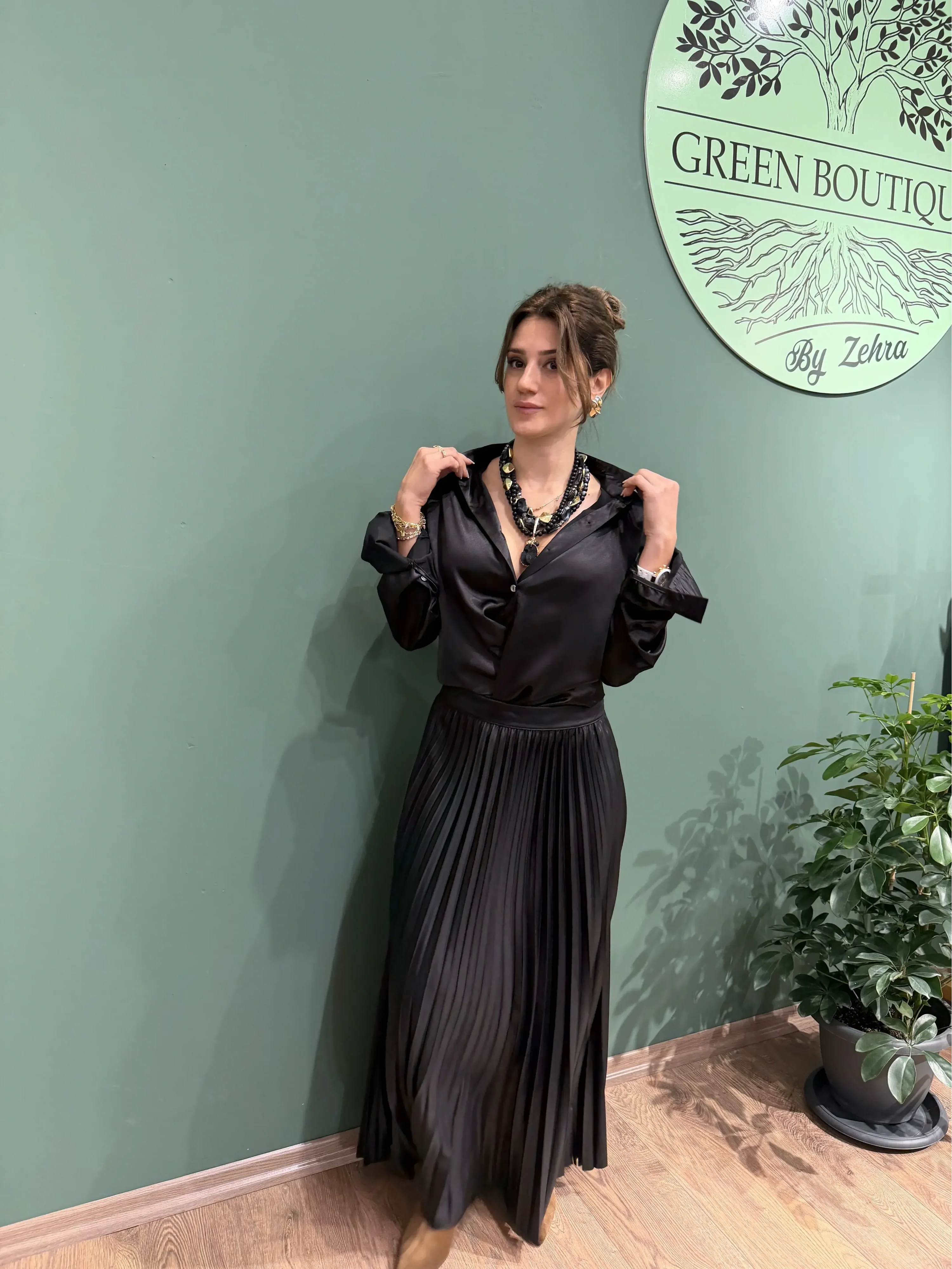 Şıklığı ve zarafeti bir araya getiren pileli uzun parlak siyah etek, hareket ettikçe ışığı yansıtan özel dokusu sayesinde dikkat çekici bir görünüm sunar. Hem gece kombinlerinde hem de günlük stilinizde modern bir ışıltı katmak için ideal bir parça olan bu etek, pileli yapısıyla feminen ve akıcı bir siluet oluşturur.