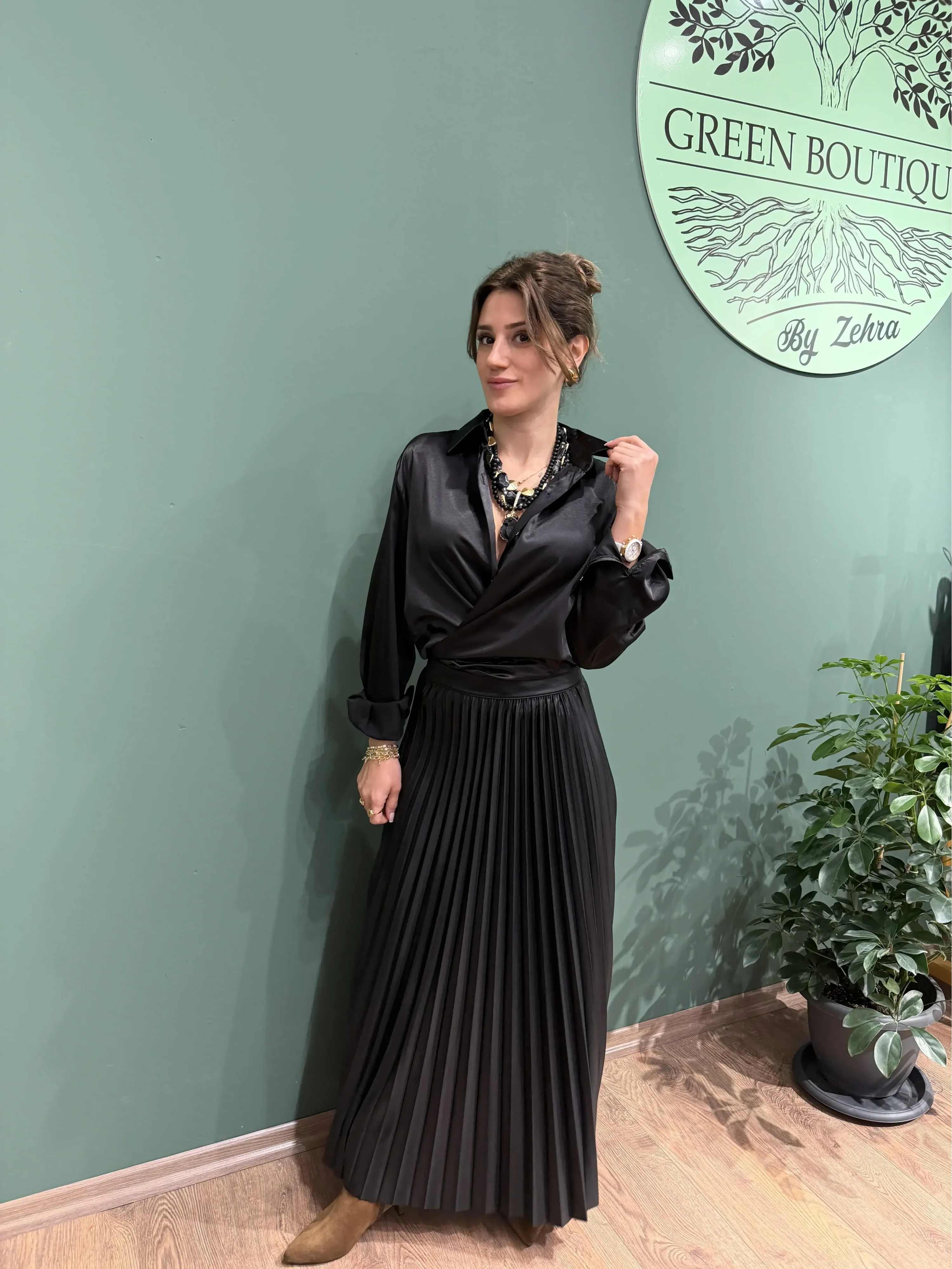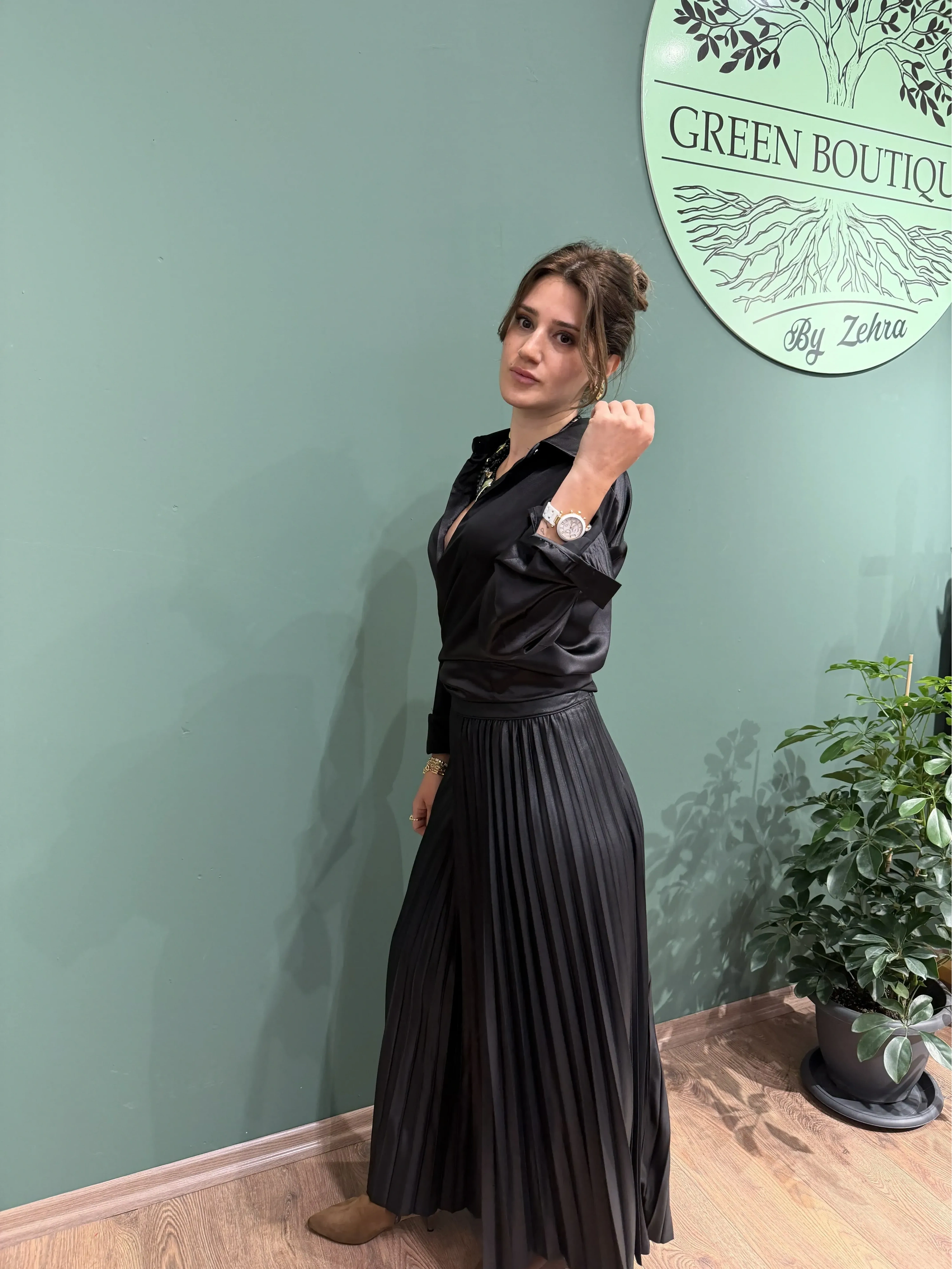 Pileli Uzun Parlak Etek – Siyah | Işıltılı, Zarif ve Modern Bir Stil