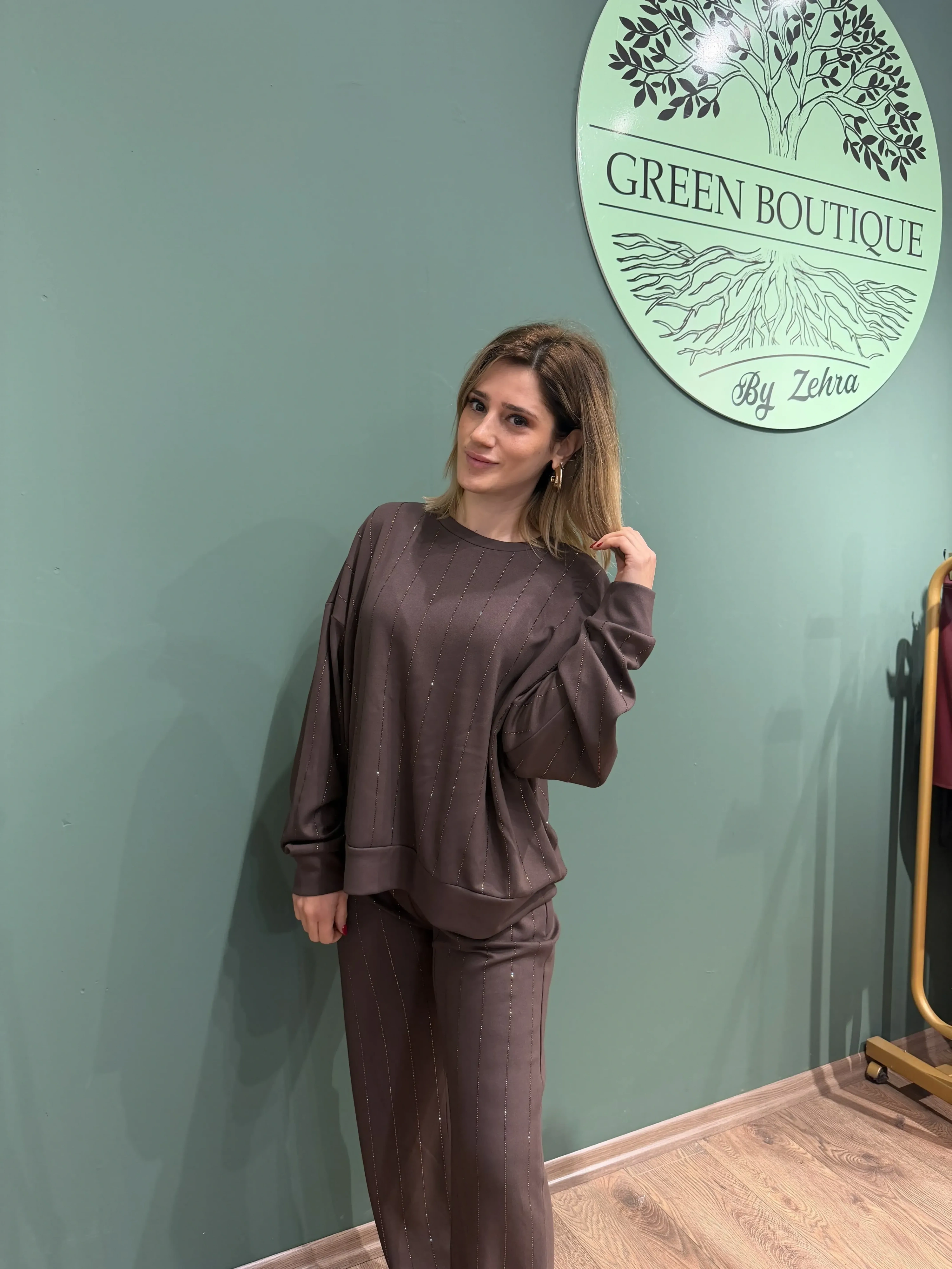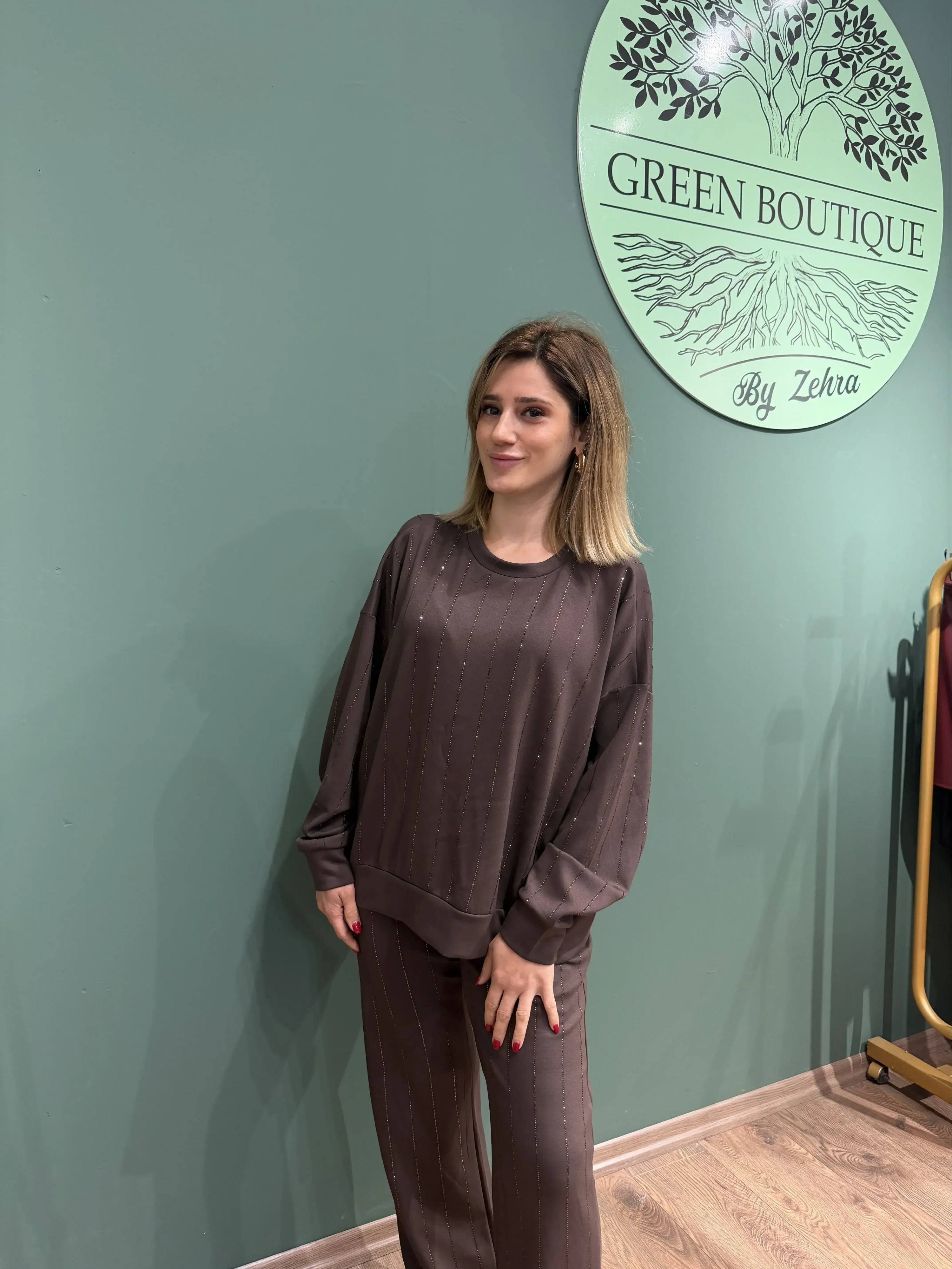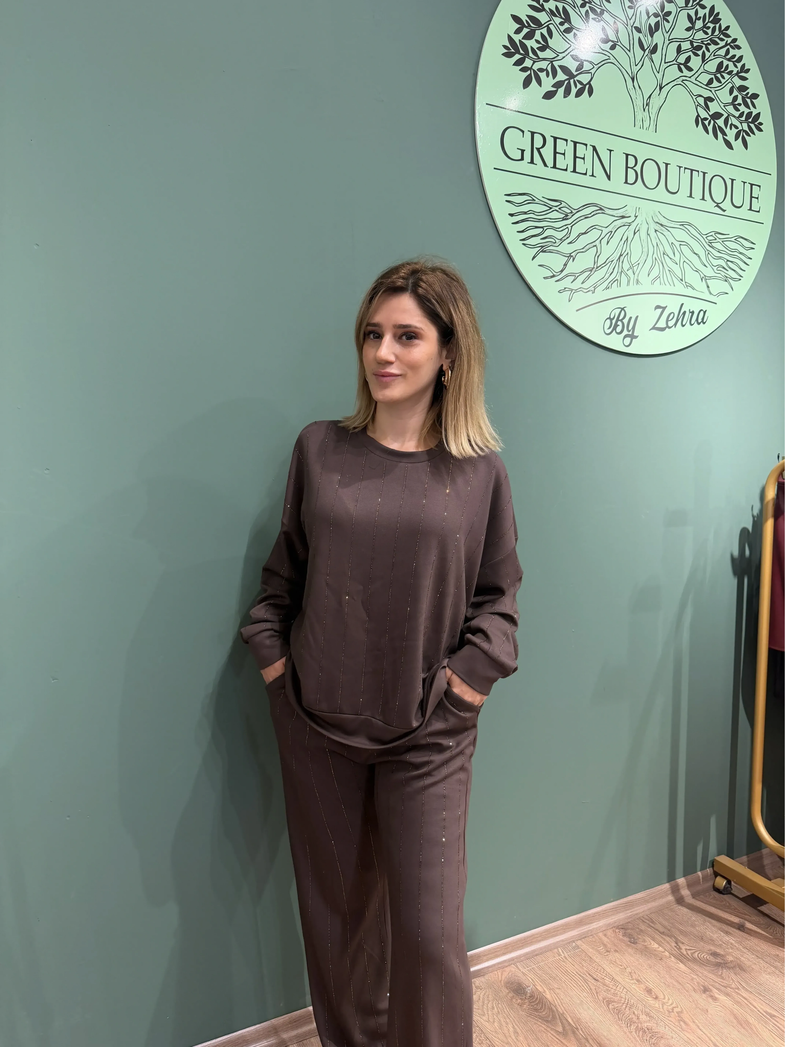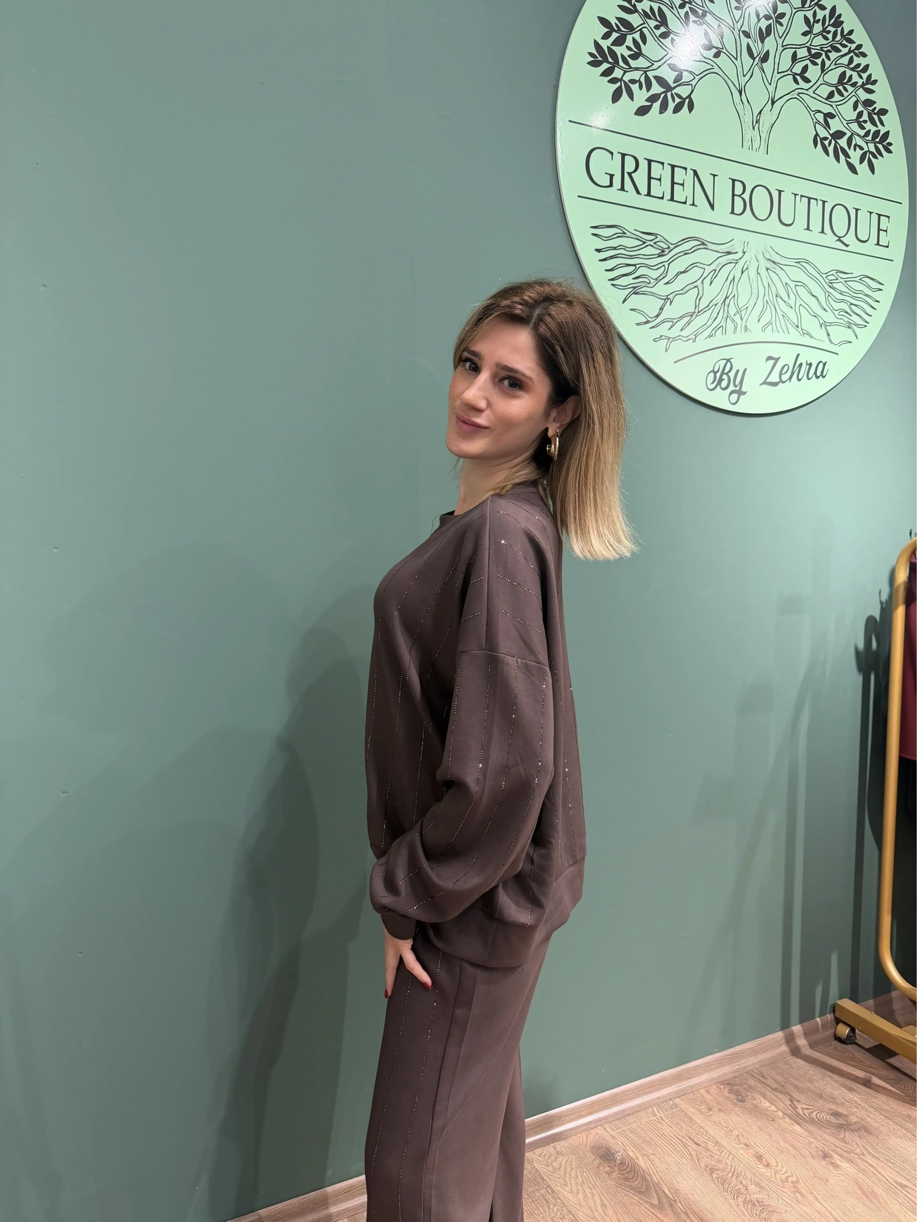 Günlük stilinizde hem rahatlığı hem de ışıltıyı bir arada görmek istiyorsanız, Pul Detaylı Kahverengi Eşofman Takım tam size göre! Yumuşak dokulu kaliteli kumaşı sayesinde gün boyu konfor sunarken, üzerindeki ışıltılı pul işlemeleri ile sıradan eşofman takımlarından ayrılır.