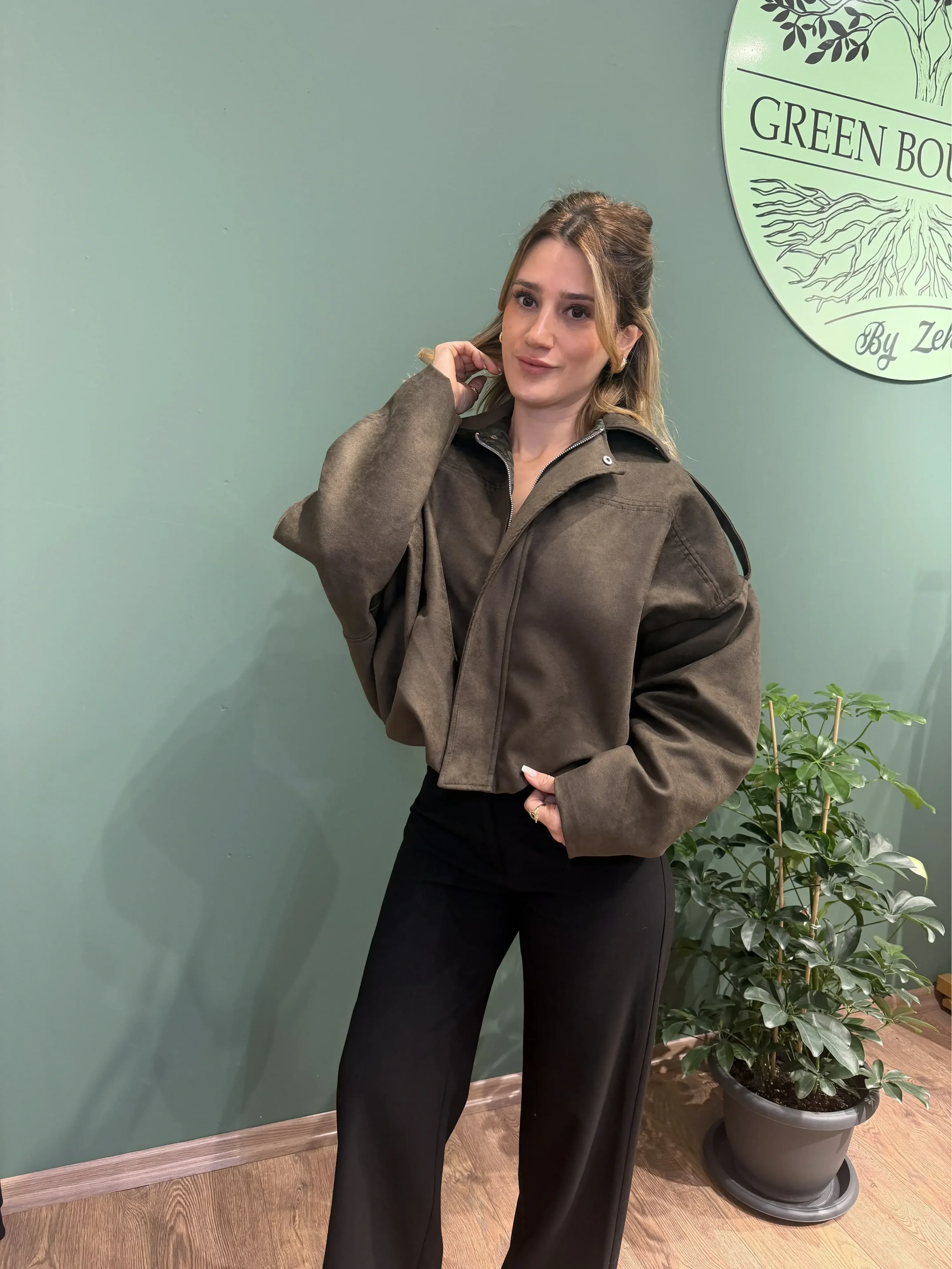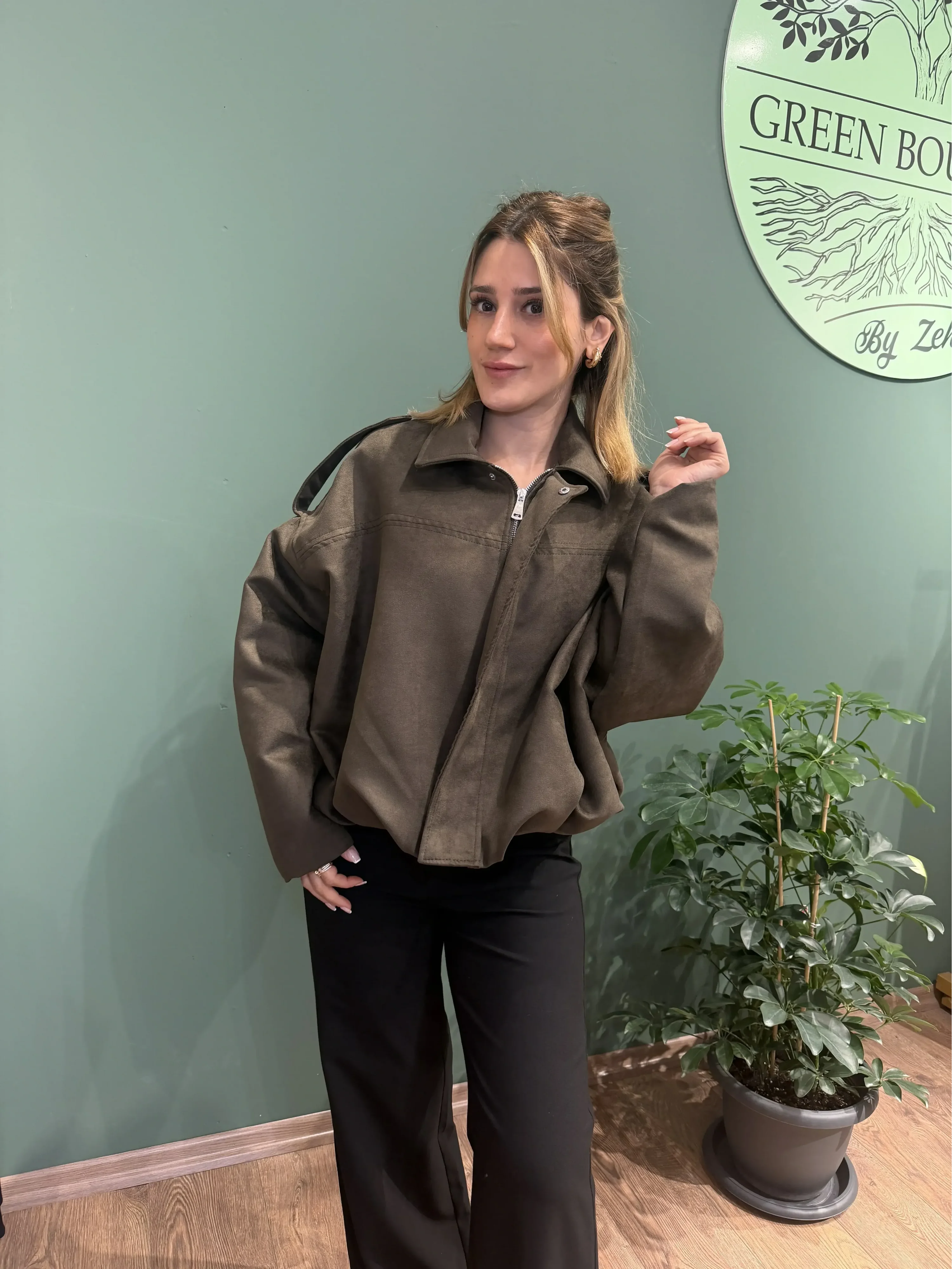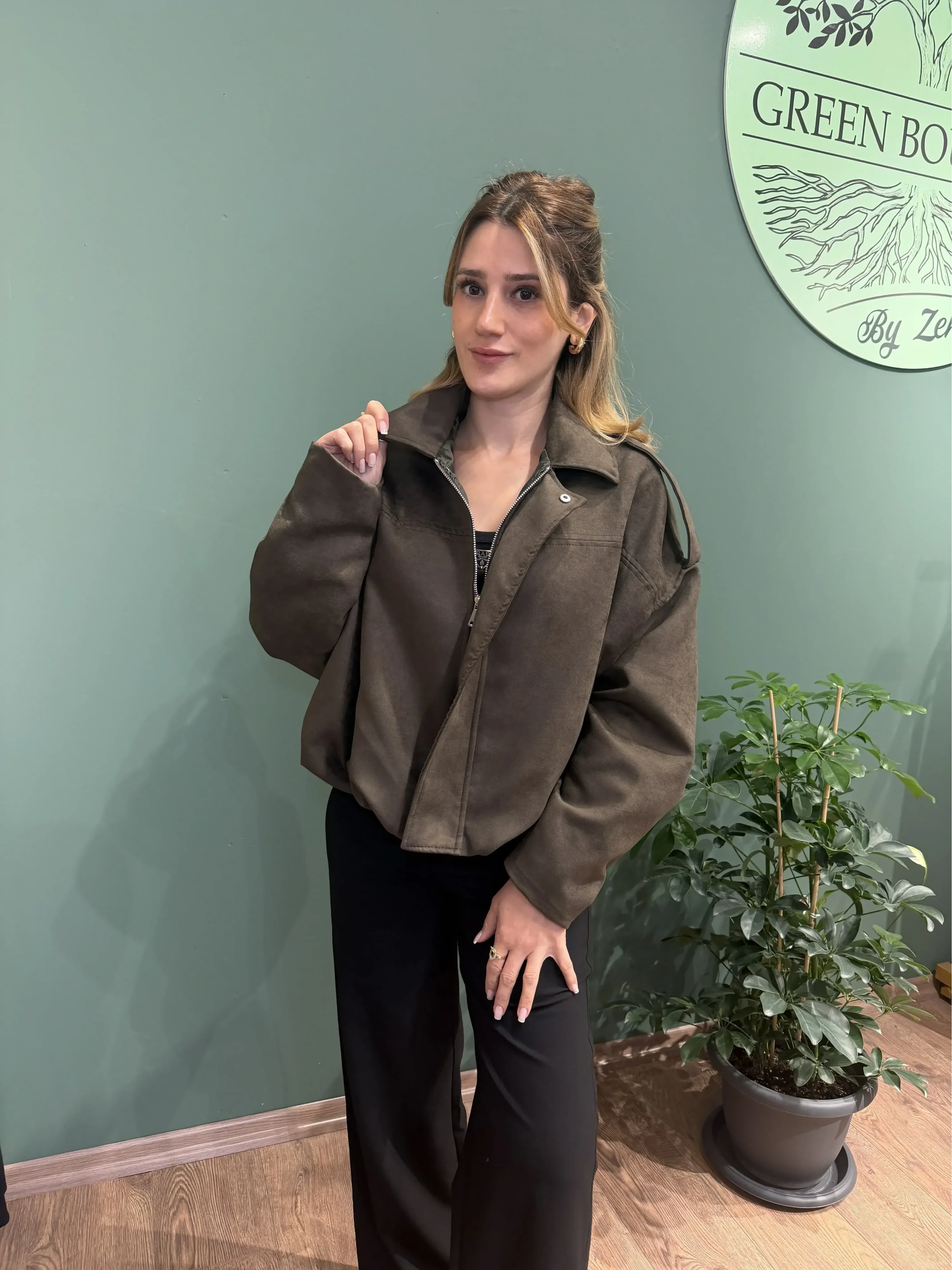Süet kumaş, dayanıklı ve şık yapısıyla öne çıkar. Hafif ve rahat yapısı ile klasik bomber kesimi birleşerek modern ve sportif şıklığı bir araya getirir. Haki rengi, nötr ve toprak tonlarla kolay kombinlenebilir, her mevsim tarzınızı tamamlar.