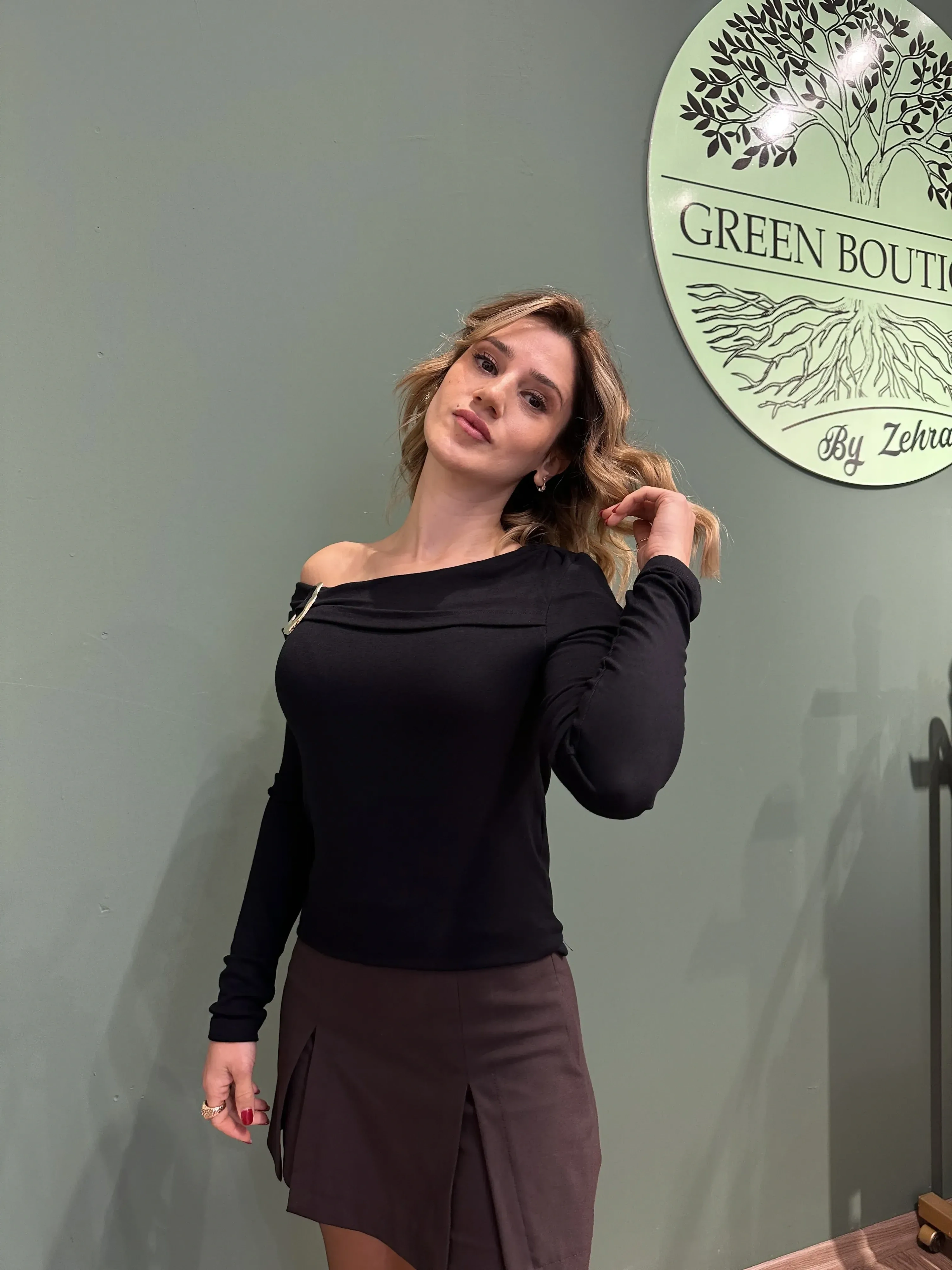 Şıklığın cesur ve modern hâliyle buluşturan Tek Omuz Açık Tokalı Bluz, zarif kesimi ve dikkat çeken detaylarıyla göz alıcı bir stil sunar. Siyah rengin asaletini taşıyan tasarım, omuz kısmındaki metal toka detayı ile bluzu daha iddialı ve trend bir görünüme kavuşturur.
