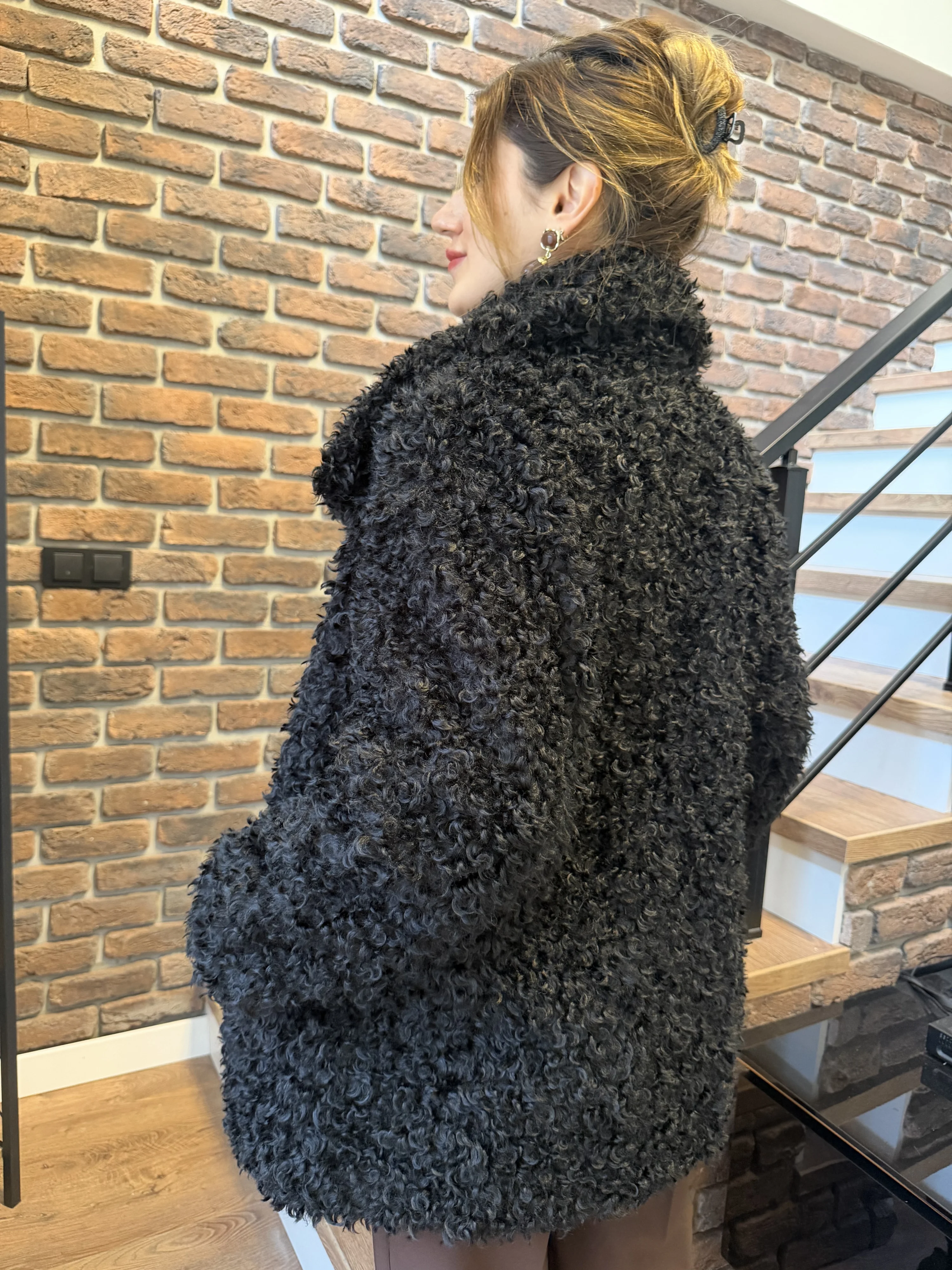 Bu siyah peluş mont; triko kazaklar, jean pantolonlar, etekler ve botlarla mükemmel uyum sağlar. Minimal aksesuarlarla tamamlandığında sofistike ve modern bir stil yaratır. Kış aylarında hem sıcak kalmak hem de şıklığından ödün vermemek isteyenler için ideal bir parçadır.