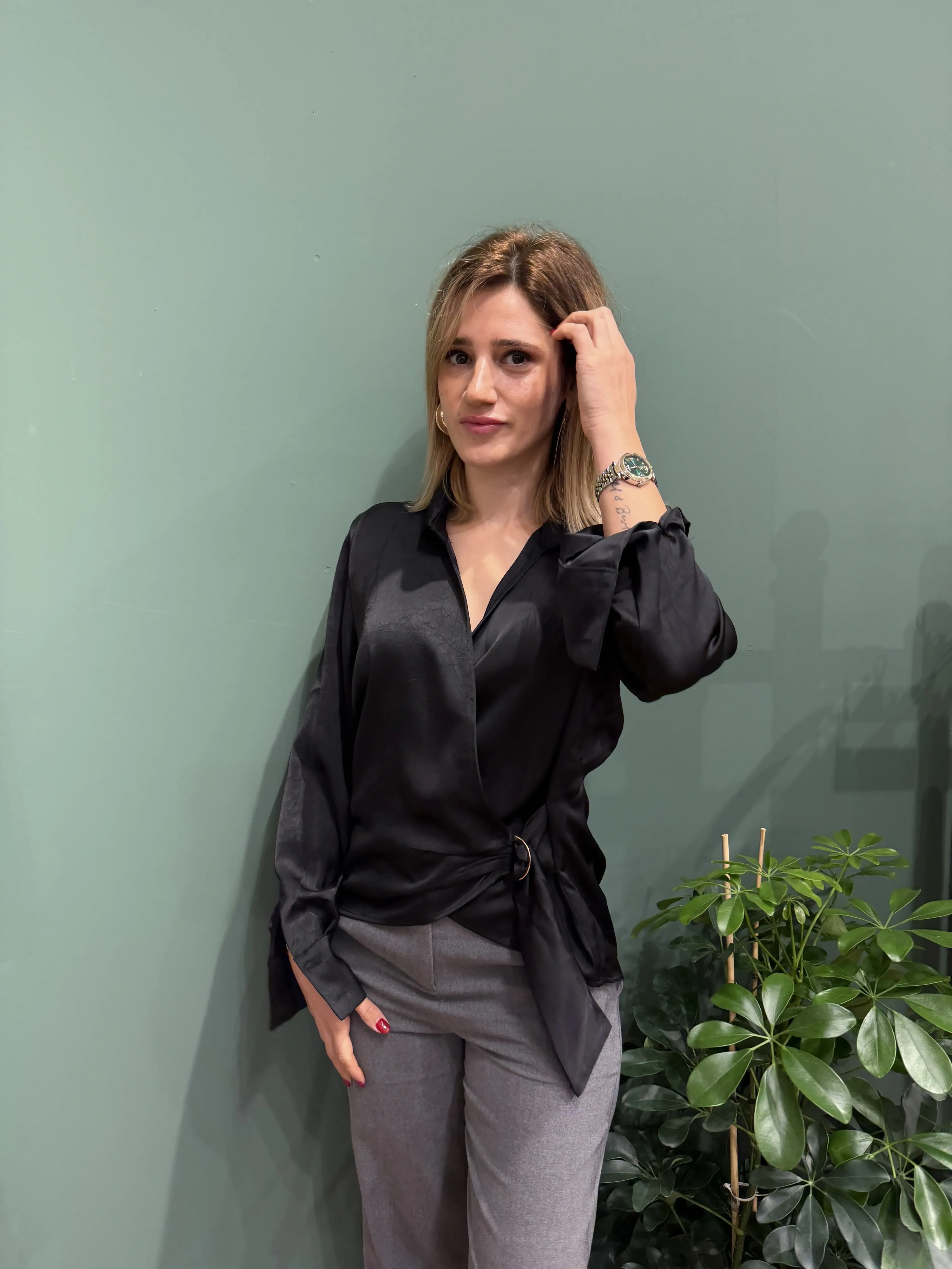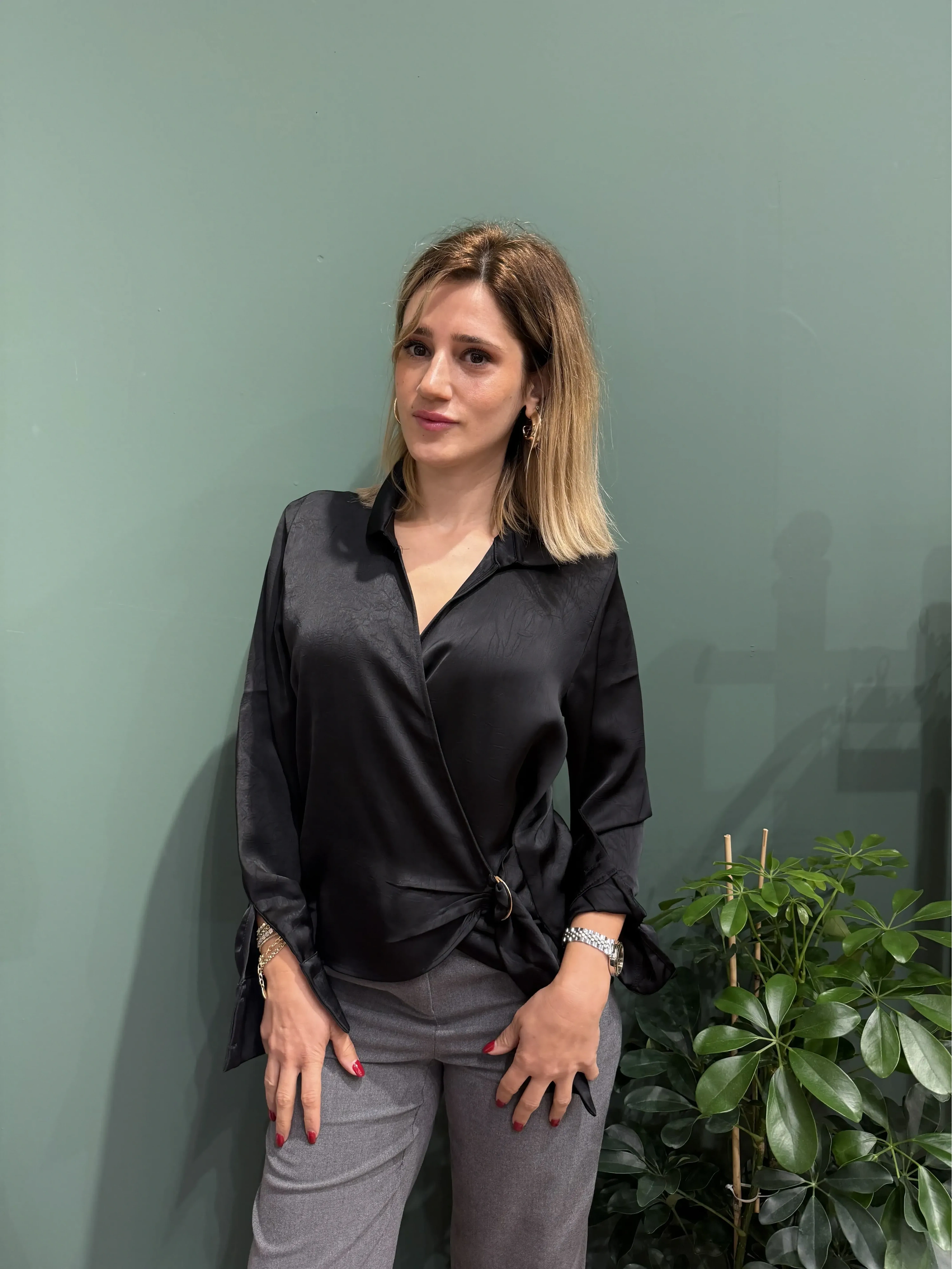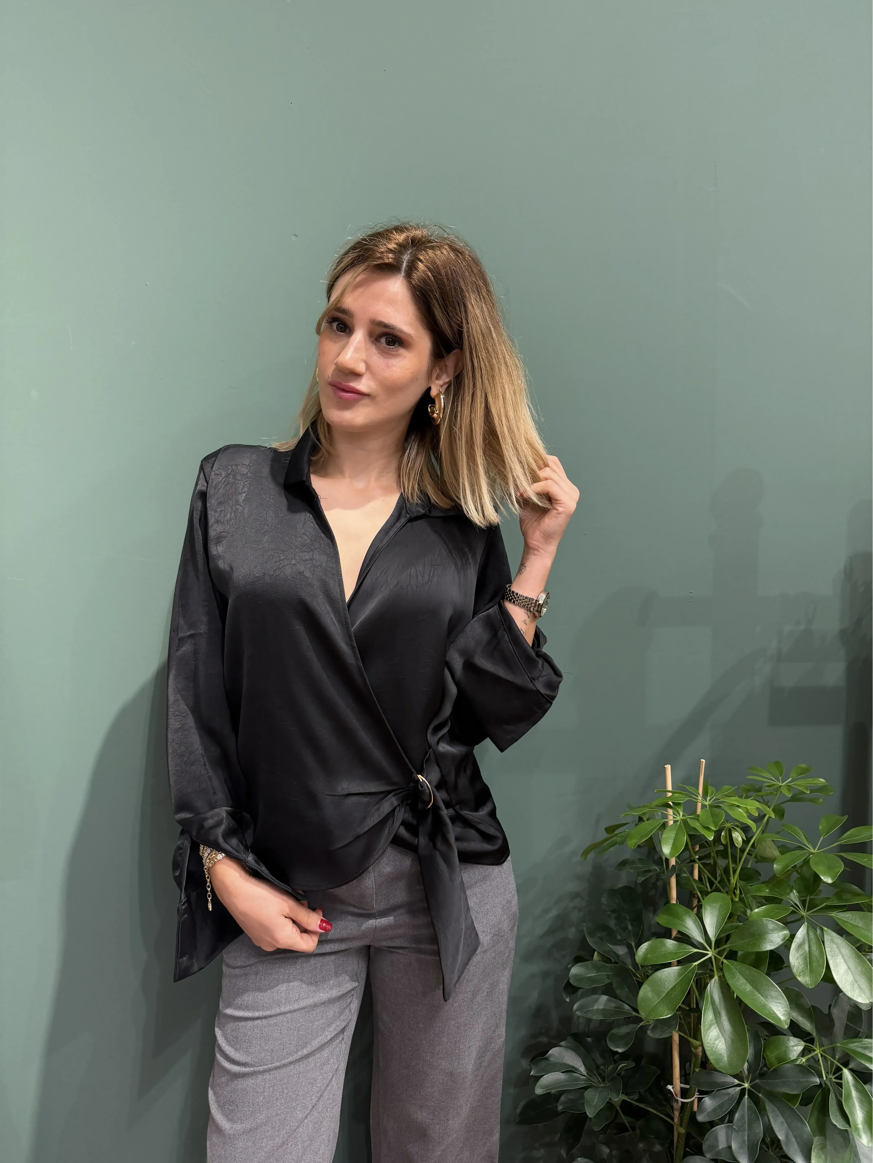 Şıklığın zarif dokunuşuyla tasarlanmış siyah tokalı saten kruvaze yaka gömlek, hem gündüz ofis stilinize hem de özel akşam buluşmalarına zarafet katmak için ideal bir parçadır. Işığı hafifçe yansıtan pürüzsüz saten kumaşı, vücuda yumuşakça otururken konforu da elden bırakmaz. Kruvaze yaka detayı, gömleğe feminen ve akıcı bir siluet kazandırır. Bel kısmındaki tokalı kapanma sistemi, görünümünüzü vurgularken gömleğinizi sabitler ve zarif bir yapı verir.