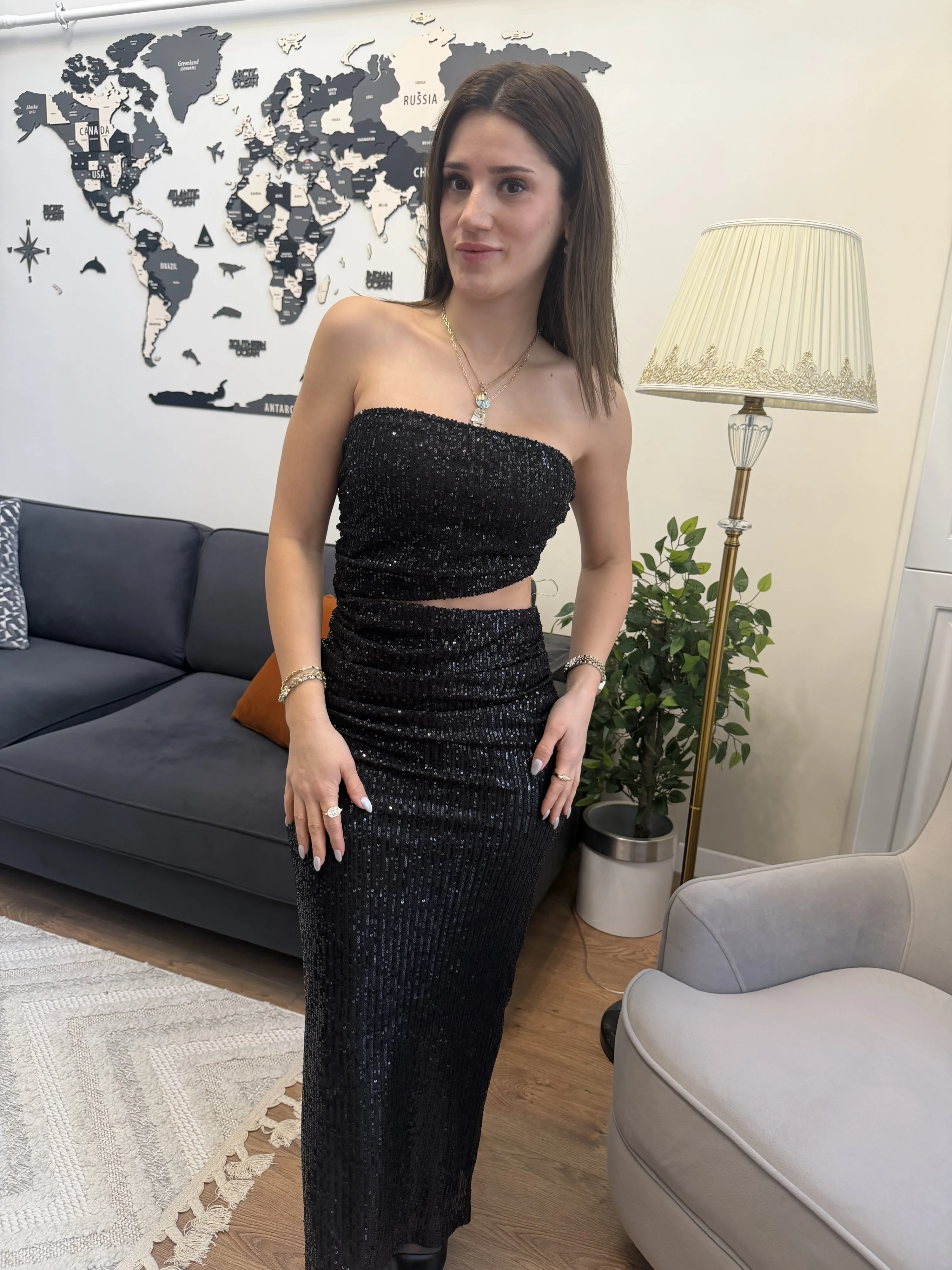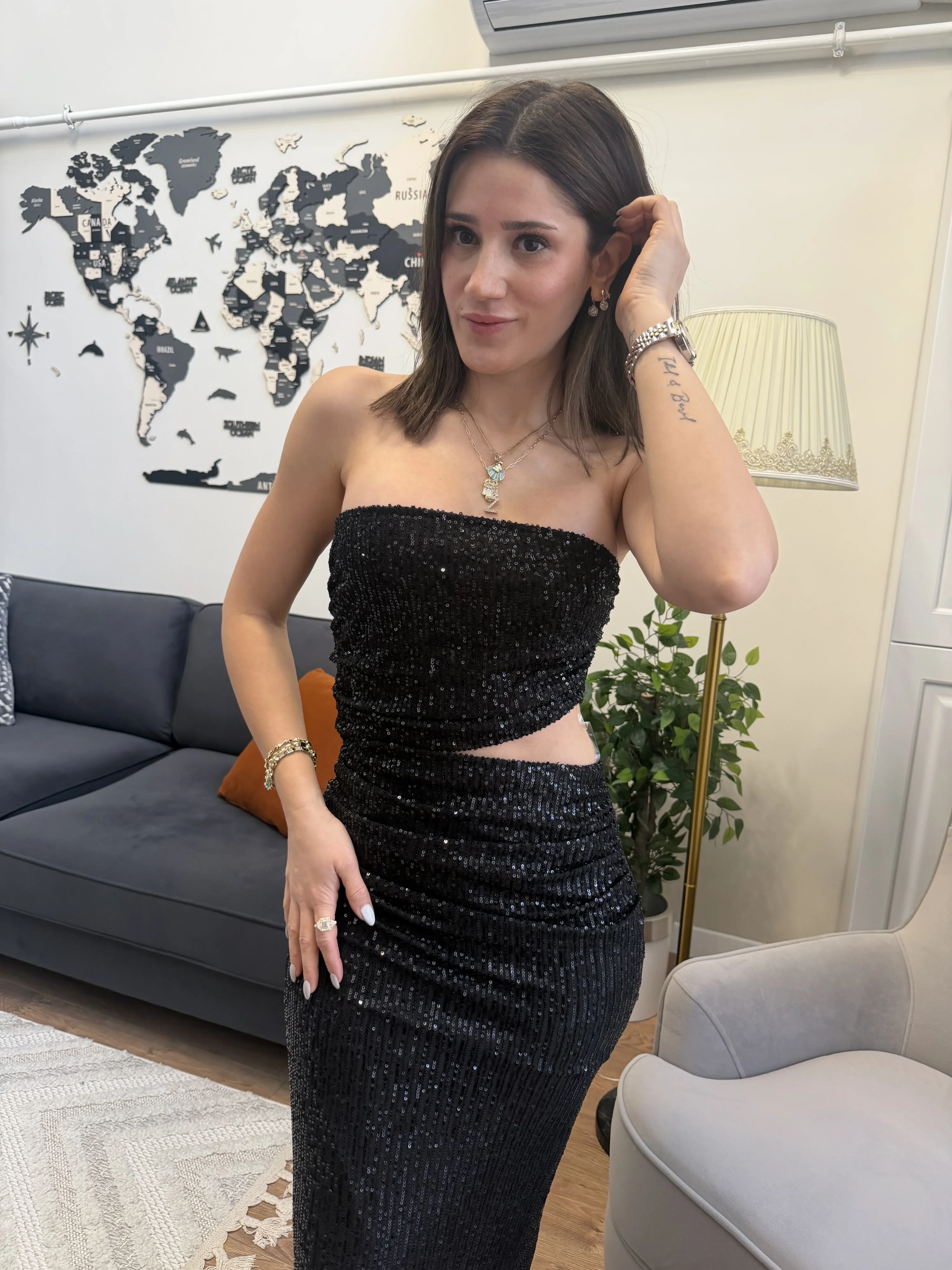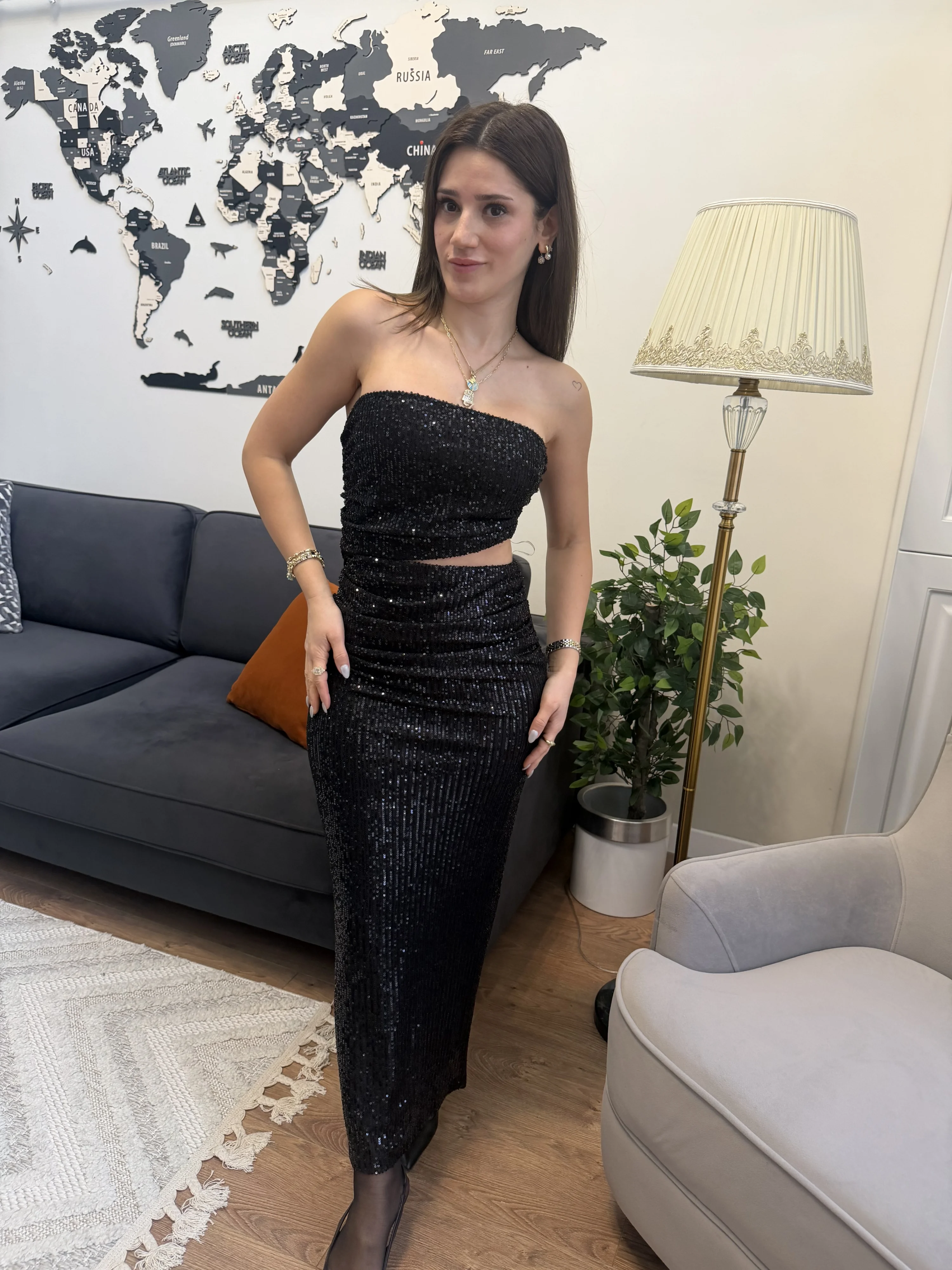 Bu ışıltılı straplez elbise, özel günlerde zarif ve modern bir stil yakalamak isteyen kadınlar için tasarlandı. Şık topuklu ayakkabılar ve zarif aksesuarlarla kombinleyerek gecenin yıldızı olabilirsiniz.